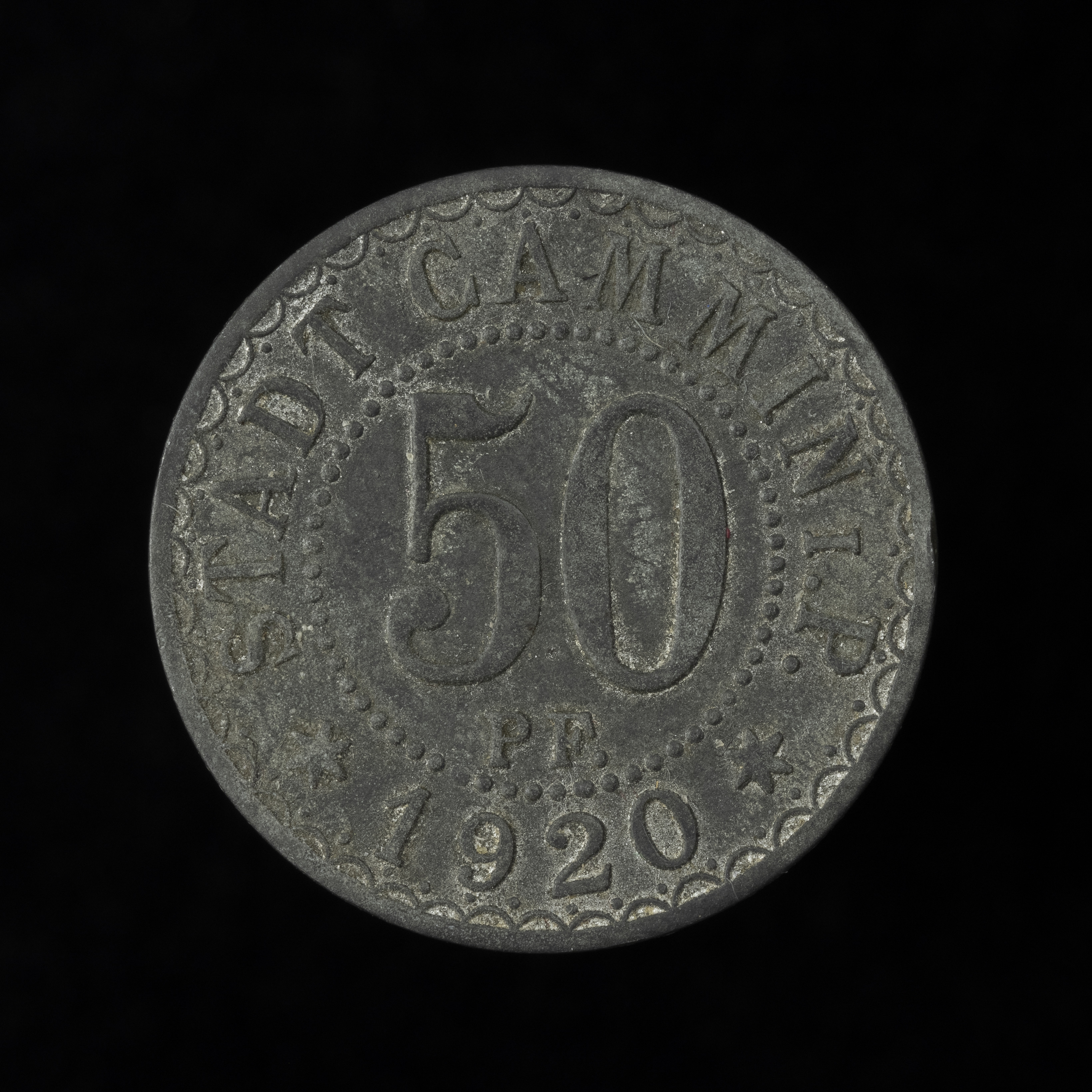 W celu złagodzenia uciążliwego dla obrotu pieniężnego deficytu niskich nominałów, władze samorządowe podejmowały inicjatywy emisji własnych pieniędzy. Wychodzono z założenia, że pieniądze zastępcze powinny być metalowymi monetami, ponieważ wydawane wcześniej bony papierowe nie sprawdziły się w obiegu. Ten sposób myślenia wykazał również magistrat miasta w Kamieniu Pomorskim. W 1918 oraz w 1920 roku ukazały się wybite przez firmę Wilhelm Mayer & Franz Wilhelm ze Stuttgartu monety o wartości 10 i 50 fenigów. Bito je w żelazie oraz w cynku. Szczególnie wiele znanych jest odmian 50-fenigówek z 1918 roku. Między innymi ze względu na dwa funkcjonujące już w obiegu wzory zapisu nominału: ½ MARK (znacznie rzadsza) i ½ Mk, widocznej na zdjęciu monecie z 1920 roku nadano inny wygląd. Ułamek marki zastąpiono ilością fenigów, czyli liczbą 50 z określeniem Pf. pod spodem, zaś zewnętrzną perełkową obwódkę bordiurą złożoną z łuków i kropek. Nowe 50 fenigów również ukazało się w dwóch metalach. Przypuszcza się jednak, że 50 fenigów z żelaza, podobnie jak i żelazne 10 fenigów z 1920 roku nie trafiło do obiegu. Być może monety te powstały na potrzeby komercyjne i zostały rozprzedane kolekcjonerom.
