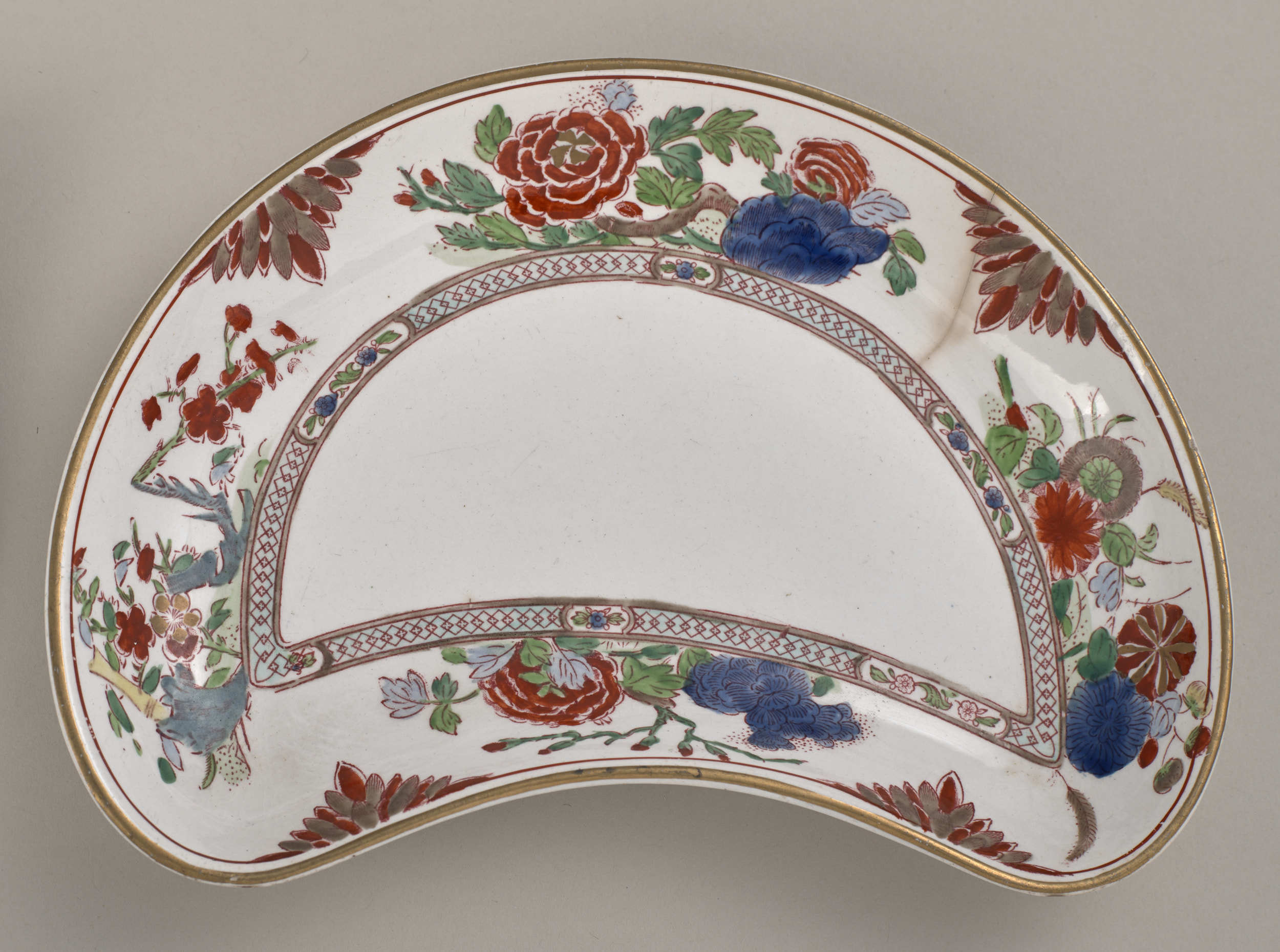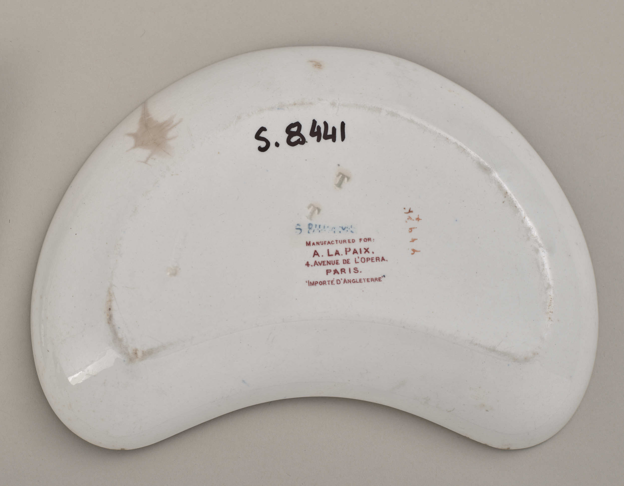 „Talerzyk przystawkowy z dekoracją chinizującą” Talerzyk z fajansu w  kształcie nerki o lekko kremowym zabarwieniu i drobnej siatce ozdobnych spękań szkliwa – „krakle”. Zdobiony w stylu chińskim motywami floralnymi i geometrycznymi. Widoczne są kwiaty piwonii oraz ukwiecone gałęzie naśladujące kwitnącą wiśnię. Szeroki pas nie połączonych ze sobą zdobień pokrywa brzeg naczynia otaczając znajdujące się w centrum niewielkie lustro talerzyka. Rysunek wzoru naniesiony jest techniką druku podszkliwnego, na szkliwie znajduje się zdobienie w kolorze rdzawej czerwieni, jasno – i ciemnoniebieskie, zielone w kilku odcieniach oraz żółte i złocenia. Jedyny ciągły ornament to wąski pas złożony z nachodzących na siebie rombów, w sześciu miejscach przerwany krótkimi odcinkami rezerw (niebieski kwiat z liśćmi). Na płaskim odwrociu talerzyka widoczna jest sygnatura producenta „BOOTHS” oraz zdwojona litera „T”, stemplowane w masie. Znajdują się tu też pieczątki drukowane podszkliwnie s kolorze bordowym: „MANUFACTURED FOR:/A LA PAIX,/34.AVENUE DE L’OPERA,/PARIS/ IMPORTE D’ANGLETERRE”. Dalej widoczny jest ręczny zapis cyfrowy farbą naszkliwną w kolorze cynobru:”7793”/”0” oraz litera „F”. Obok odręczny napis olejną farbą „nr inw.S.8436MŁ”. Fajans kształtowany w formie, dekoracja drukowana i podmalowana farbami naszkliwnymi, złocenie. Firma: Thomas, Booths Sonne, Anglia, Hanley, Booths, 2 poł XIX w.