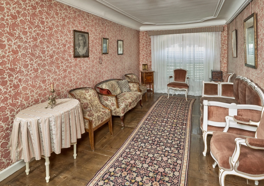 Pokój znajduje się w skrzydle północnym II piętra Zamku. Pomieszczenie w kształcie wydłużonego prostokąta, do którego wejście prowadzi przez dwuskrzydłowe drzwi z korytarza północnego do kwadratowego przedpokoju, z niego można też wejść do sypialni 59. Bezpośrednio do pokoju wchodzi się przez jednoskrzydłowe, płycinowe, malowane drzwi. W ścianie północnej umieszczono jedno kwadratowe dwuskrzydłowe okno zamknięte łukiem odcinkowym, z drewnianym płotkiem. Ściany od sufitu oddziela wklęsła faseta z profilowanym gzymsem. W narożu północno – zachodnim znajduje się murowany dwukondygnacyjny piec z profilowanym gzymsem i mosiężnymi drzwiczkami. Na ścianach papierowa tapeta drukowana na papierze maszynowym z czerwonym, powtarzającym się stylizowanym motywem kwiatowym i papugami. Tapeta pochodzi z pierwszych lat XX w. i została położona na ściany w czasie wielkiego remontu prowadzonego za czasów Romana i Elżbiety Potockich. Jej datowanie określa się na 1911 rok. Podczas ostatniej konserwacji (2015 r.) odkryto pod tapetą resztki innych wcześniejszych tapet. Pod koniec XVIII w. pomieszczenie wchodziło w skład apartamentu zwanego „Gabarówką” ( od nazwiska zajmującego go francuskiego emigranta) i pełniło funkcję pokoju służbowego. W drugiej połowie XIX w. pokój wchodził w skład Apartamentu Państwa Młodszych. Po drugiej wojnie światowej pokój pełnił funkcję magazynu grafik ze zbiorów Muzeum. Po wykonaniu prac konserwatorskich w latach 2014 – 2016 z pokoju urządzono stałą ekspozycję muzealną.
