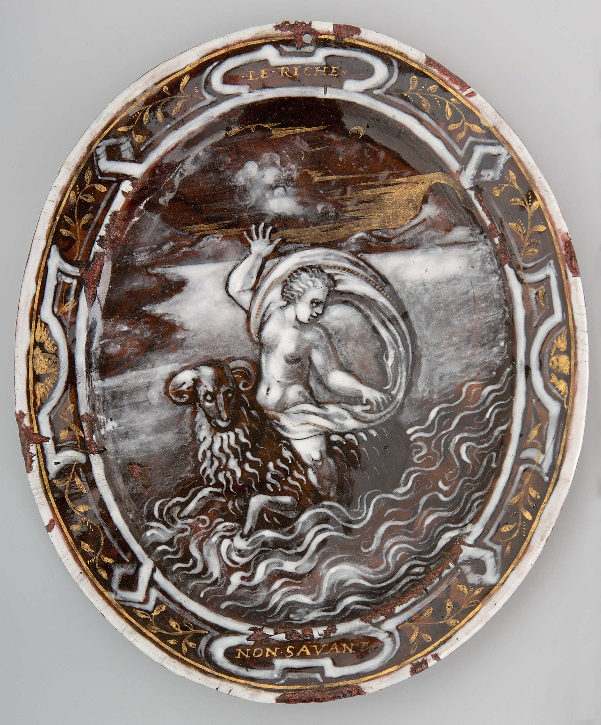 Dekorację lustra naczynia stanowi scena przedstawiająca chłopca o imieniu Friksos, syna króla Atamasa i bogini Nefele, który płynie na zesłanym przez matkę baranie o złotym runie. Chłopiec, aby uniknąć złożenia w ofierze, ucieka z Beocji. Dociera do Kolchidy, gdzie dzięki opiece tamtejszego króla, Ajetesa, dożywa starości. W kartuszach napisy – u góry: Le riche, u dołu: non savant. Na rewersie – Medea w profilu zwróconym w prawo i napis: MEDEA. Scena wykonana została zapewne wg ryciny zamieszczonej we francuskich edycjach dzieła Andrei Alciato Emblematum liber, przygotowanych przez Guillaume’a Roville’a z Lyonu (1548), gdzie dodatkowo wizerunek opatrzony został inskrypcją.
