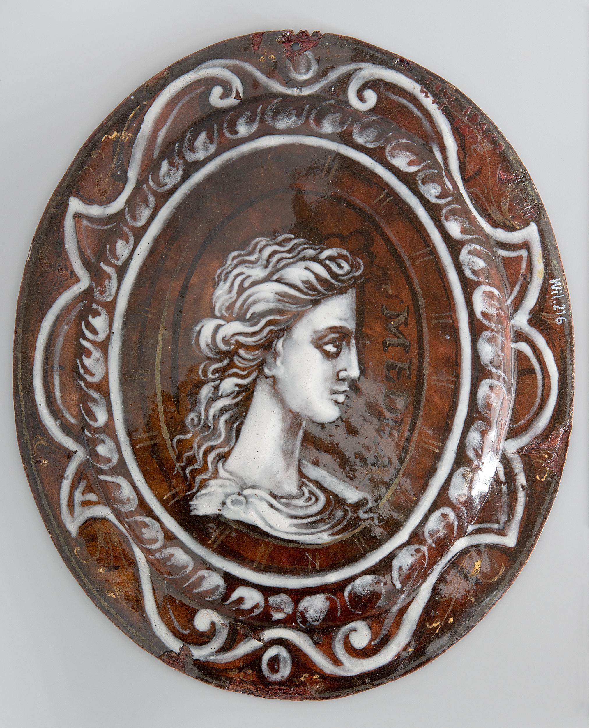 Jeden z sześciu owalnych talerzyków, dekorowanych emalią en grisaille w tonach brązowych, z białymi akcentami. Wspólnym motywem dla zestawu są białe meandrujące linie przy krawędziach kołnierza, przechodzące na osi pionowej w kartusze wypełnione napisami odnoszącymi się do poszczególnych scen. Pomiędzy nimi wić roślinna. Na rewersie popiersie w profilu, zwrócone w lewo bądź w prawo. Naczynia połączone są w pary zgodnie ze związkiem wynikającym z miłosnej historii opisanej w Metamorfozach Owidiusza.