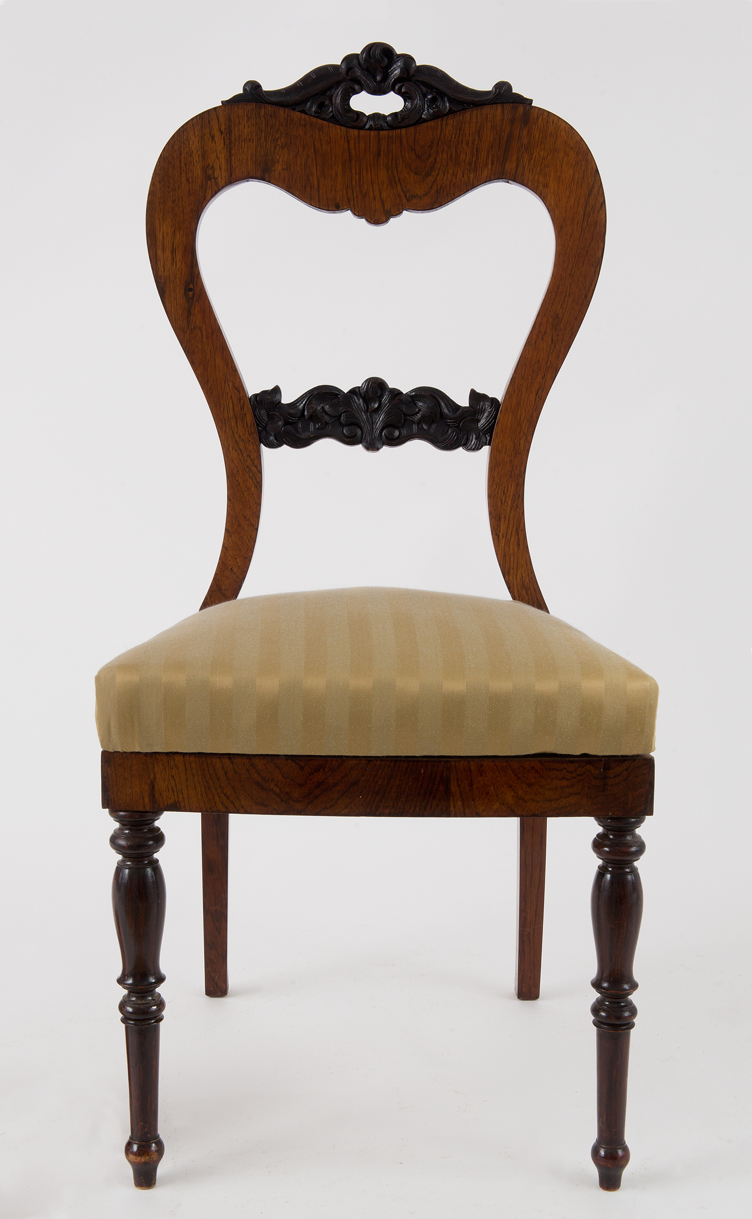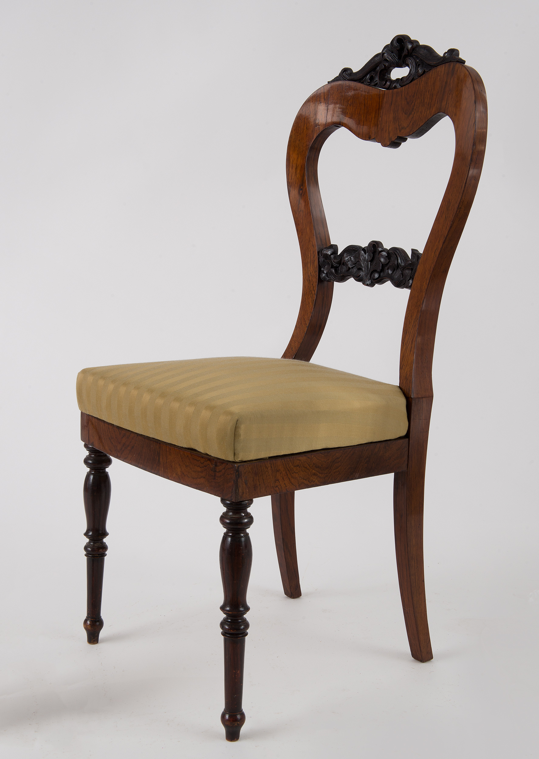 Krzesło o trapezoidalnym siedzisku, na czterech nogach z których przednie są tralkowo toczone, zaś tylne o przekroju kwadratowym, lekko zbieżne, nieco odgięte ku tyłowi, płynnie przechodzą ramiaki boczne oparcia, esowato odchylonego do tyłu. Oparcie ażurowe o kształcie balonowym, szersze u góry, w dolnej partii przewężone i związane rzeźbioną łączyną o motywach roślinnych. Szerokiego ramiak górny z wyraźnym ugięciem, od dołu ozdobnie podkrojonym, od góry ozdobiony ażurowym rzeźbionym zwieńczeniem o motywach roślinno-muszlowych. Ramiaki boczne oparcia zwężające się ku dołowi, tuż nad siedziskiem przełamane, poniżej przełamania przechodzące w tylne nogi. Okrzynienie proste. Ramiaki oparcia, oskrzynienie oraz tylne nogi pokryte fornirem palisandrowym, przednie nogi oraz elementy rzeźbione lakierowane, w kolorze ciemnobrązowym. Siedzisko tapicerowane, obite jasnobeżowym adamaszkiem w gładkie pasy.