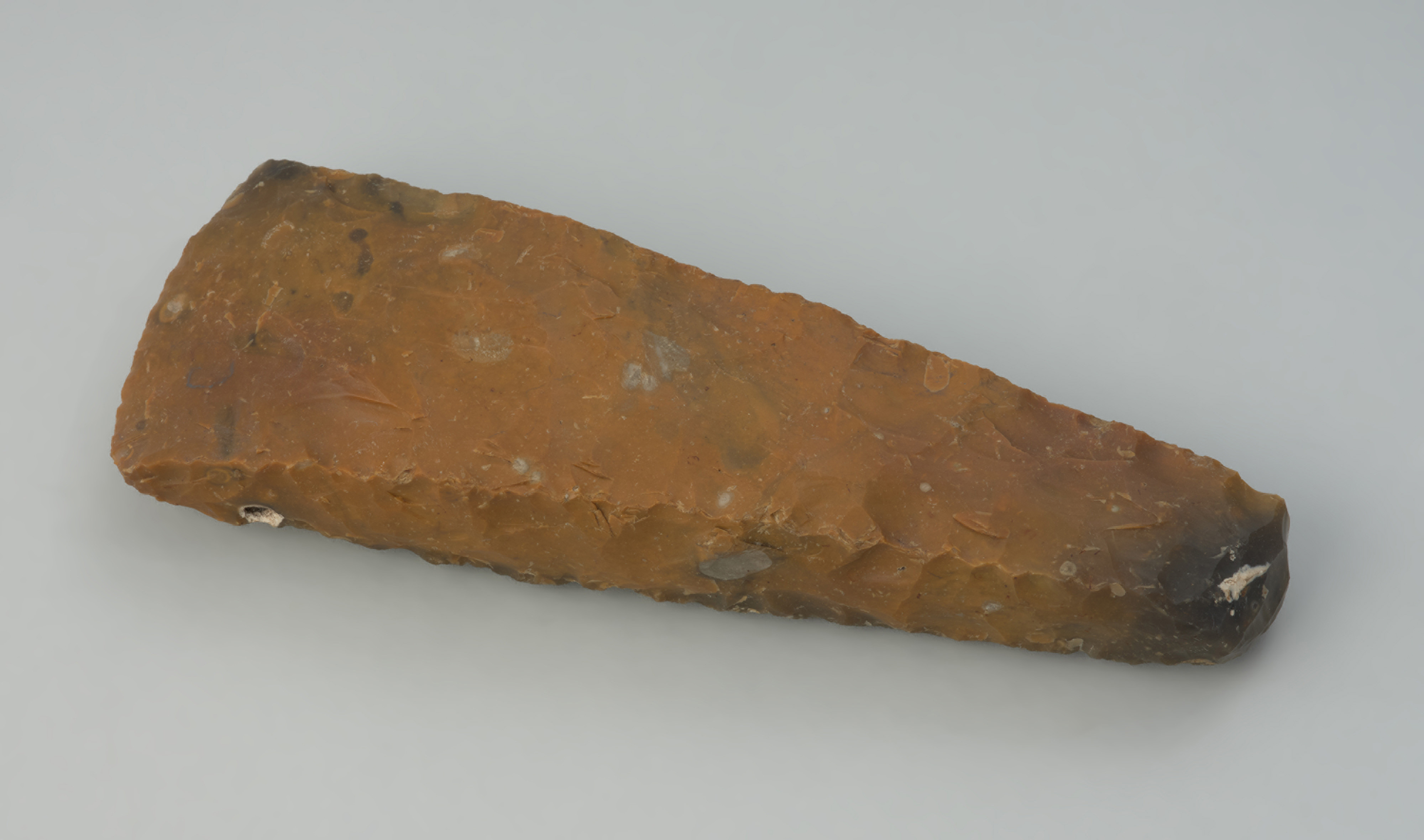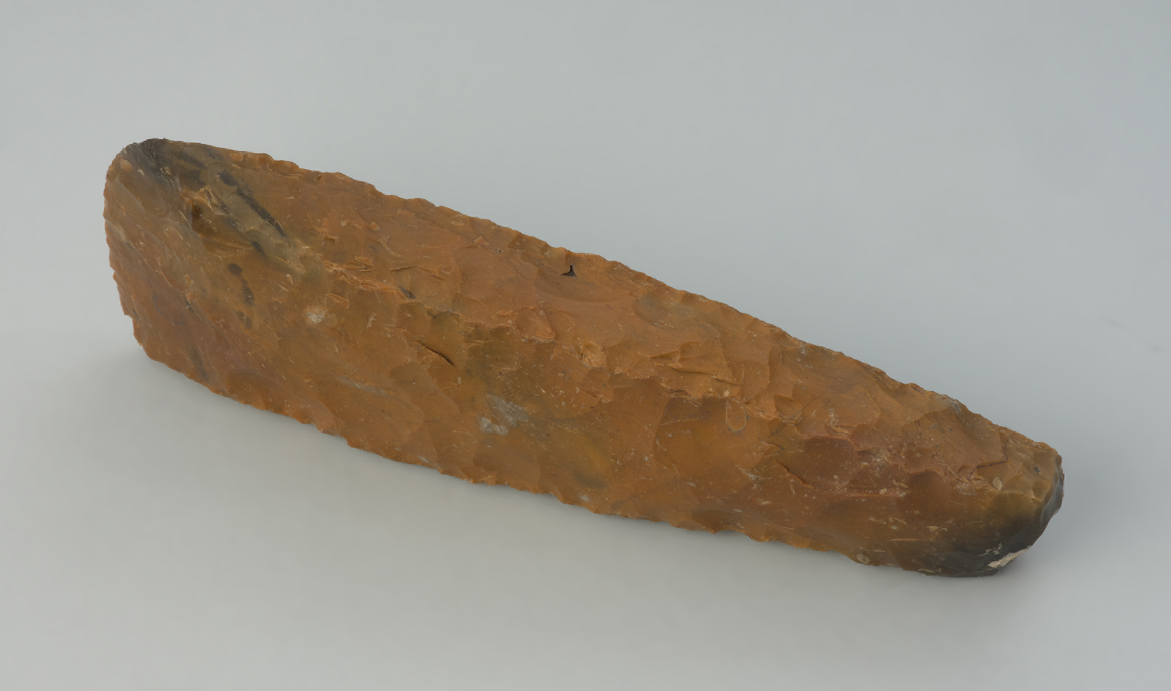 Narzędzia sprawiają wrażenie jakby były zrobione przez jednego wytwórcę. Nie są to wyroby ukończone, a przygotowane do kończącego produkcję gładzenia powierzchni. Mają ślady negatywów po odbiciach formujących kształt i wyrównujących krawędzie. Wykonano je z krzemienia wieku kredowego o szaro-białawej barwie, która uległa zmianie wskutek pokrycia ich przez rdzawą patynę powstałą w wilgotnym środowisku ich wielowiekowej depozycji. Czworościenne formy o wąskich obuchach mają nieco zróżnicowane długości (13,6–17,4 cm) i pewną odmienność w ukształtowaniu ostrza. Część z nich ma ostrze proste w widoku od przodu, a inne – jak prezentowany egzemplarz – są ukształtowane łukowato. Trudno tę odmienność uznać za przypadek, biorąc pod uwagę umiejętności wytwórcy przejawiające się w starannym uformowaniu wszystkich powierzchni. Być może te formalnie podobne do siebie półwytwory były przygotowywane jako funkcjonalnie różne narzędzia: z krawędzią prostą – jako siekiery służące do rąbania i ociosywania oraz z krawędzią łukowatą – jako ciosła do żłobienia i drążenia.