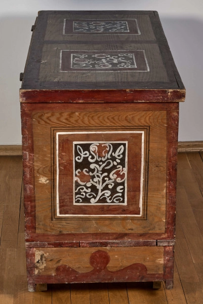 Skrzynia wianna drewniana, malowana w motywy kwiatowe, wsparta na wyciętych z desek nogach, za którymi kryją się drewniane kółka. Wewnątrz przy lewym boku posiada tzw. półskrzynek czyli wąski i długi zamykany schowek na cenne przedmioty. Skrzynia przeznaczona była do gromadzenia wiana czyli posagu, będącego wyprawą panny młodej. Razem z panną młodą wchodziła ona do nowej rodziny, gdzie często pozostawała na długie lata, a nawet na kolejne pokolenia. Pełniła ważną rolę podczas przenosin do domu męża, kiedy to niesiono ją w widoczny sposób, a nierzadko też i otwierano, tak aby cała społeczność mogła zobaczyć stroje, misternie haftowaną pościel czy akcesoria kuchenne, które kobieta wnosiła w posagu. Półskrzynek mieścił z kolei drobiazgi typu czerwone korale, biżuteria, dokumenty czy listy. Pierwotnie skrzynie przechowywano w komorach, z czasem pojawiać się zaczęły w izbach jako ich dekoracja. Prezentowana skrzynia pochodzi z początku XX w. Nie jest ona miejscowym wyrobem, a importowanym, gdyż w powiecie łańcuckim nie funkcjonował żaden ośrodek zajmujący się ich produkcją. Najstarsze skrzynie posiadały na surowym drewnie malowane na ścianie frontowej dwa czarne prostokątne pola zdobione białym wolutowym wzorem roślinnym. Młodsze pochodzące z Sokołowa na żółtym „mazerowanym” tle miały jedno zielone prostokątne pole, na którym wymalowany był wianek lub bukiet wachlarzowato ułożonych kwiatów. Rzadziej spotkać można było skrzynie, w których na żółtym tle widniały malowane rozety cyrkowe z czterema wolutowymi motywami rozmieszczonymi dośrodkowo po rogach. Skrzynie malowane nabywano od sokołowskich stolarzy na targach w Łańcucie, Żołyni, Rzeszowie, a także w czasie dorocznego odpustu w Zaczerniu na święto Matki Boskiej Siewnej 8 września.