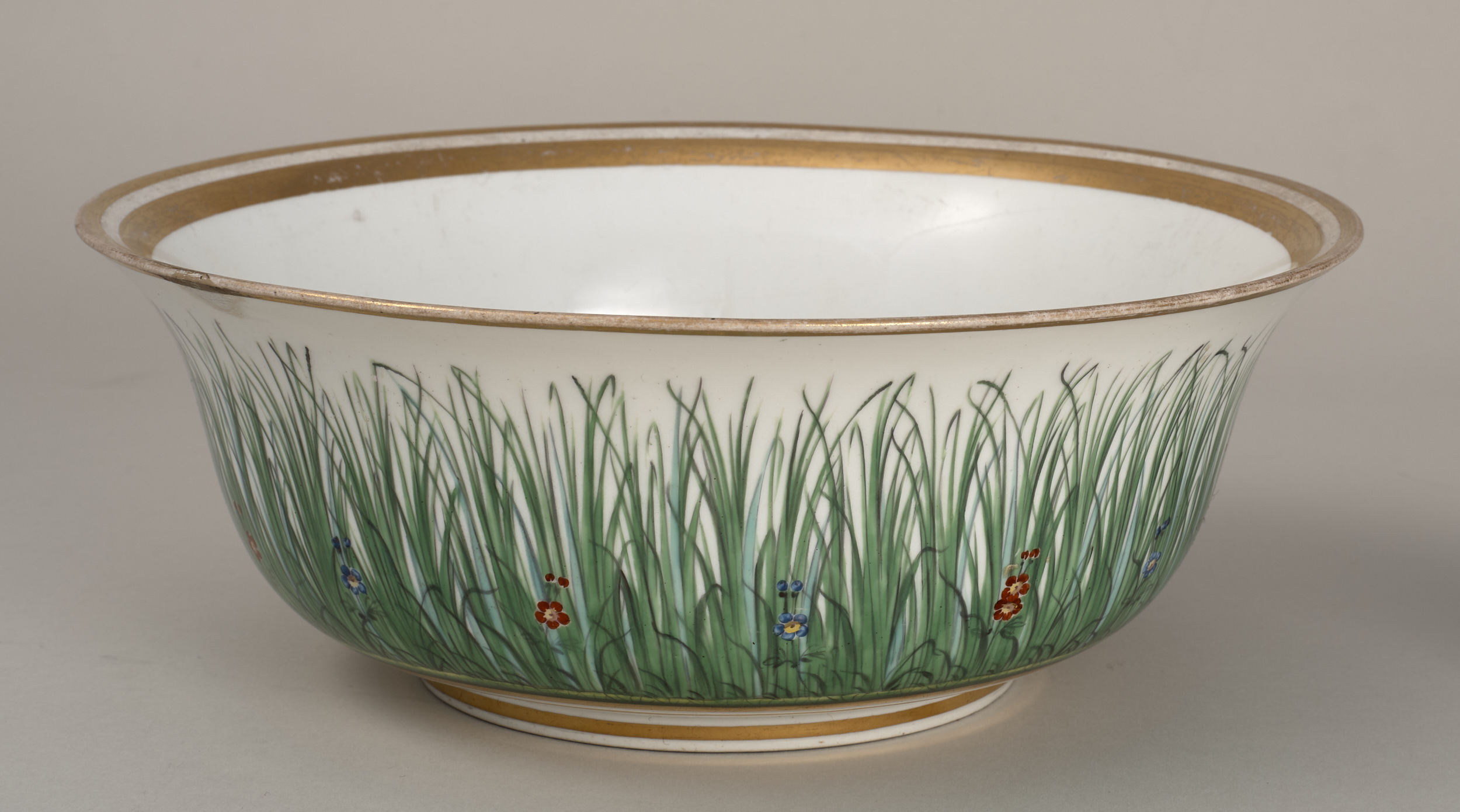 Salaterka wchodzi w skład serwisu obiadowego wykonanego w manufakturze porcelany w Wiedniu. Wytwórnia ta powstała w 1718 r., jako druga w Europie, po Miśni, manufaktura porcelany, działała do 1864 r. Serwisy obiadowe, śniadaniowe, do herbaty, kawy i czekolady stanowiły zasadniczą część produkcji wiedeńskiej wytwórni, zwłaszcza od 4 ćwierci XVIII w. Serwis obiadowy, którego część została zakupiona przez muzeum powstał w okresie kiedy manufakturą wiedeńską kierował Matthias Niedermayer (1805 – 1827). Zakupiona część serwisu składa się z kilkudziesięciu sztuk: talerzy płytkich, waz na zupę, salaterek, koszyków na owoce, półmisków, solniczek, dzbanka i dzbanuszka. Serwis ten został zakupiony przez muzeum w Łańcucie w 1964r. od Franciszka Żaby. Teresa Grzybkowska błędnie uważa, iż serwis ten zamówiła właścicielka łańcuckiego zamku Elżbieta Lubomirska (1736 -1816) dla Henryka Lubomirskiego, który był jej wychowankiem (T. Grzybkowska, „Kobieta wodzem chwalebnego czynu”, Warszawa-Toruń 2018, s. 228, il. 144). Jest to serwis w stylu klasycystycznym. Wykonany został z mlecznobiałej porcelany. Zdobiony jest we wzór polnych traw malowanych dwoma odcieniami zieleni: trawiastą i grynszpanową oraz ciemnoszarym kolorem w postaci delikatnych linii uplastyczniających rysunek traw. Zielone pasma traw gdzieniegdzie urozmaicają małe kwiatuszki, malowane rdzawą czerwienią i chabrowym błękitem oraz jasną żółcią znaczącą ich środki. Salaterka serwisowa jest okrągła, w kształcie głębokiej miski. Na ściankach zdobiona wzorem polnych traw. Brzeg naczynia podkreślony złoconymi paskami.