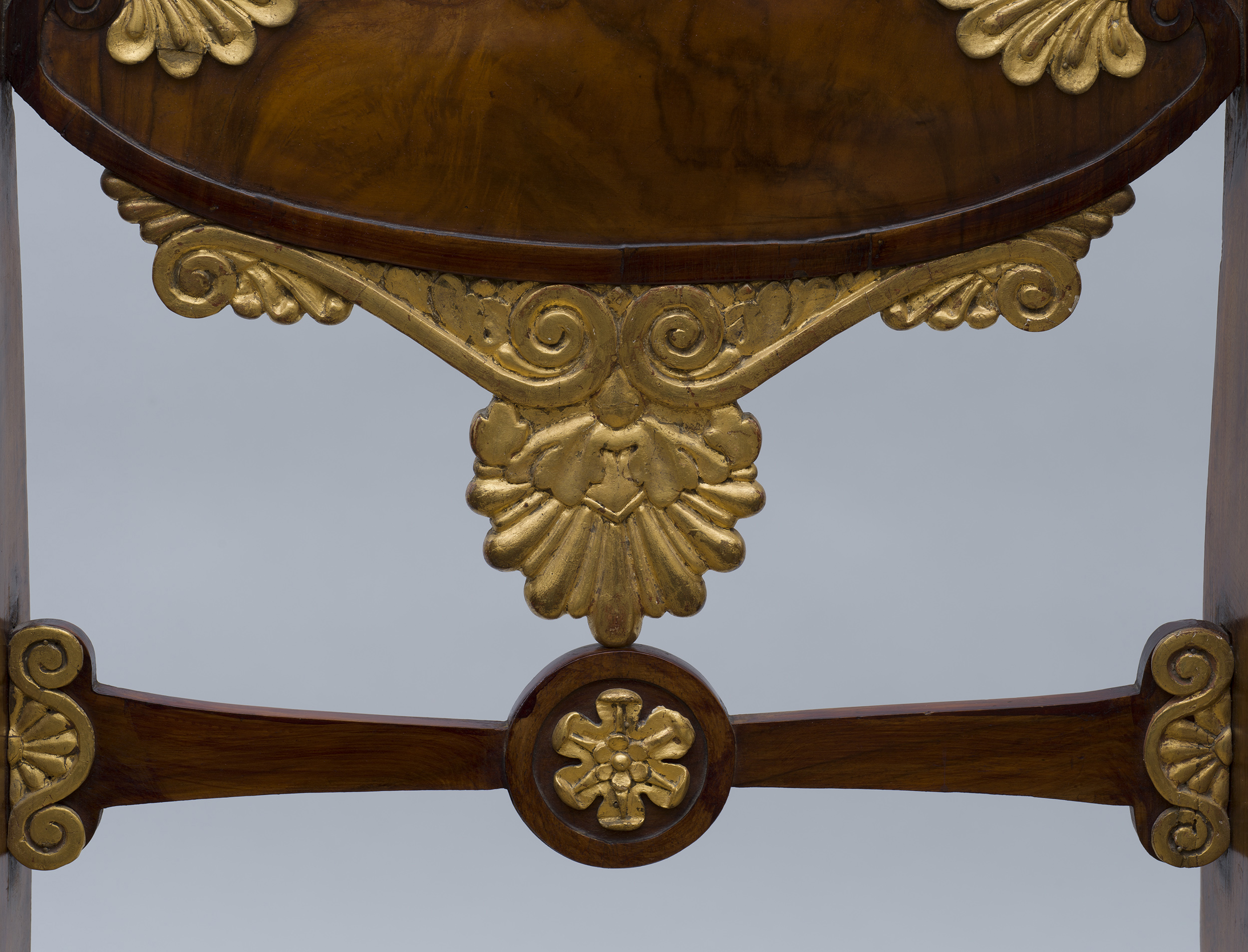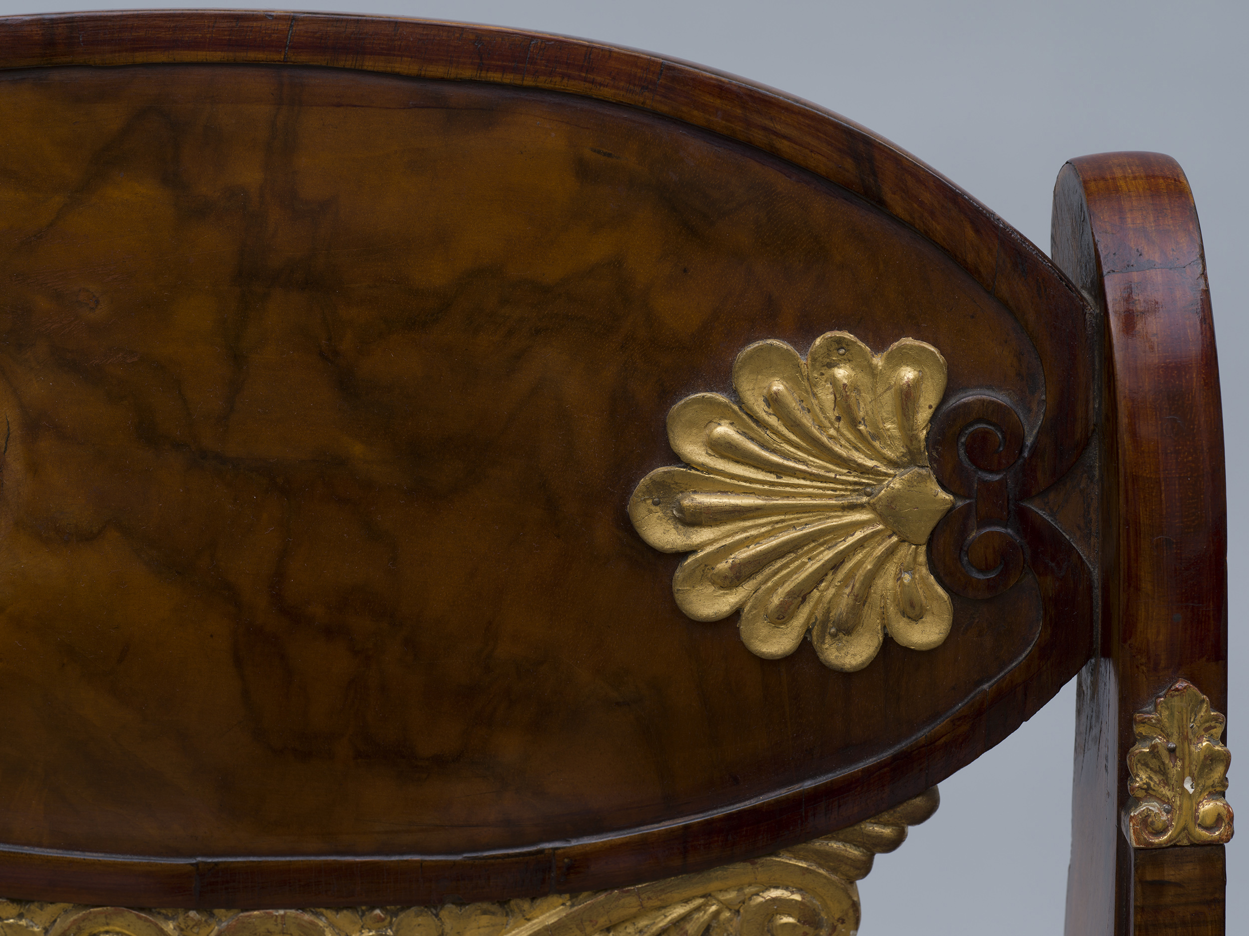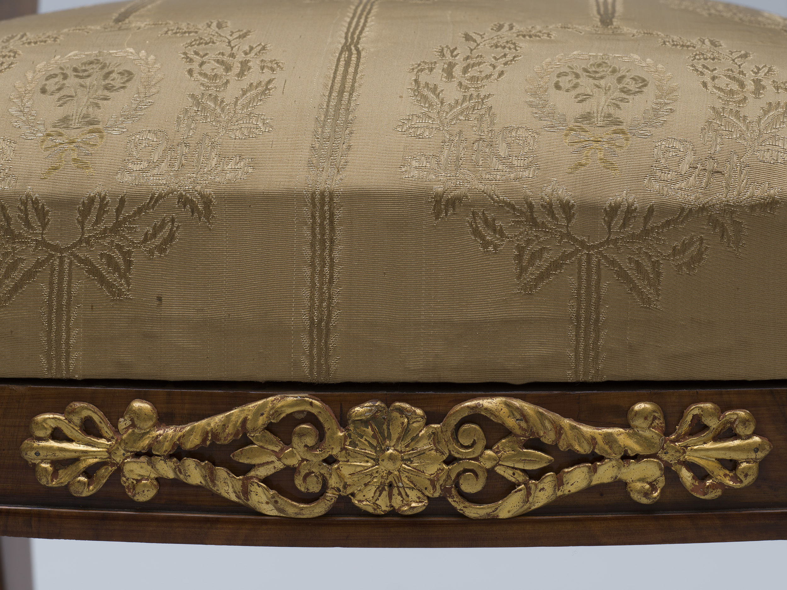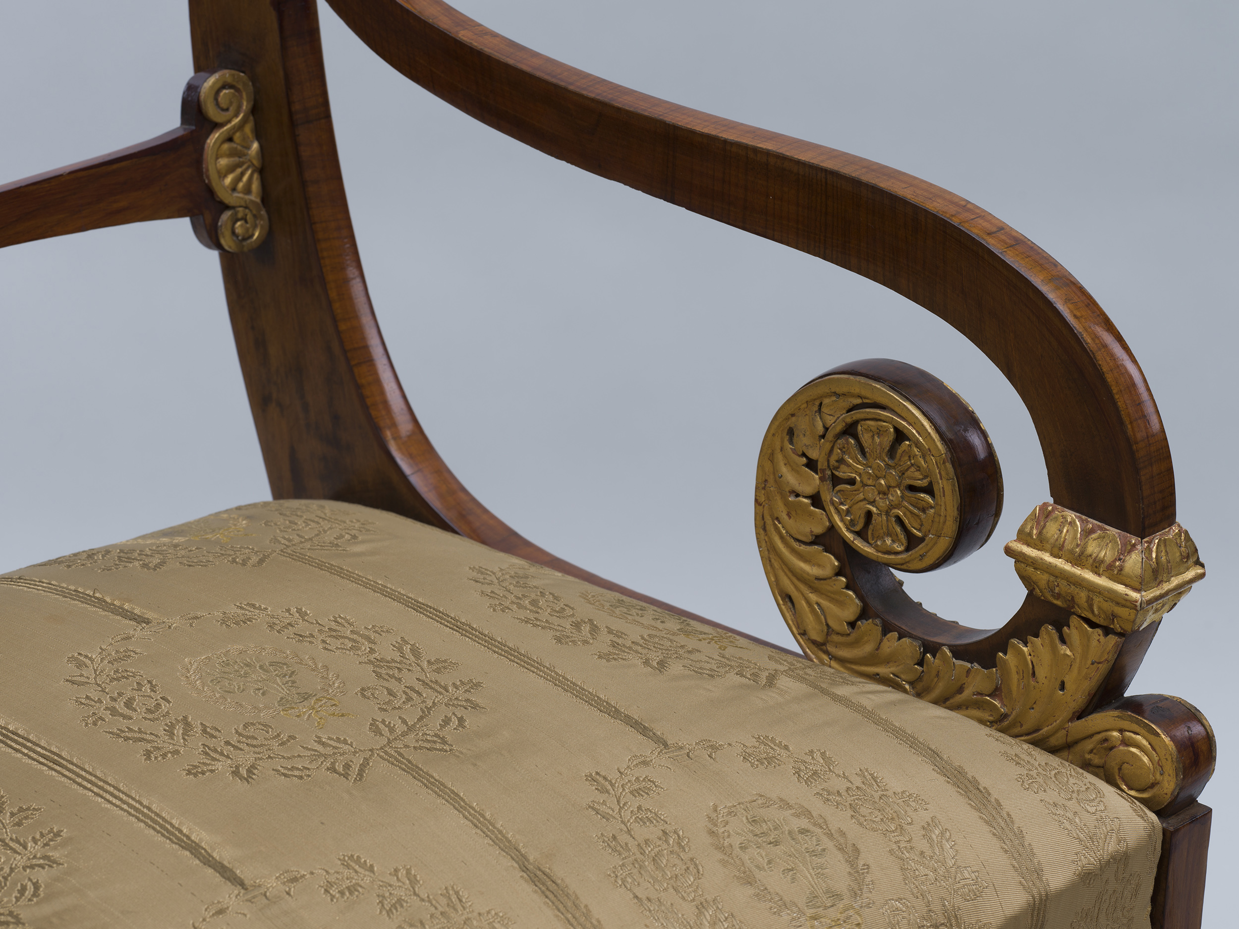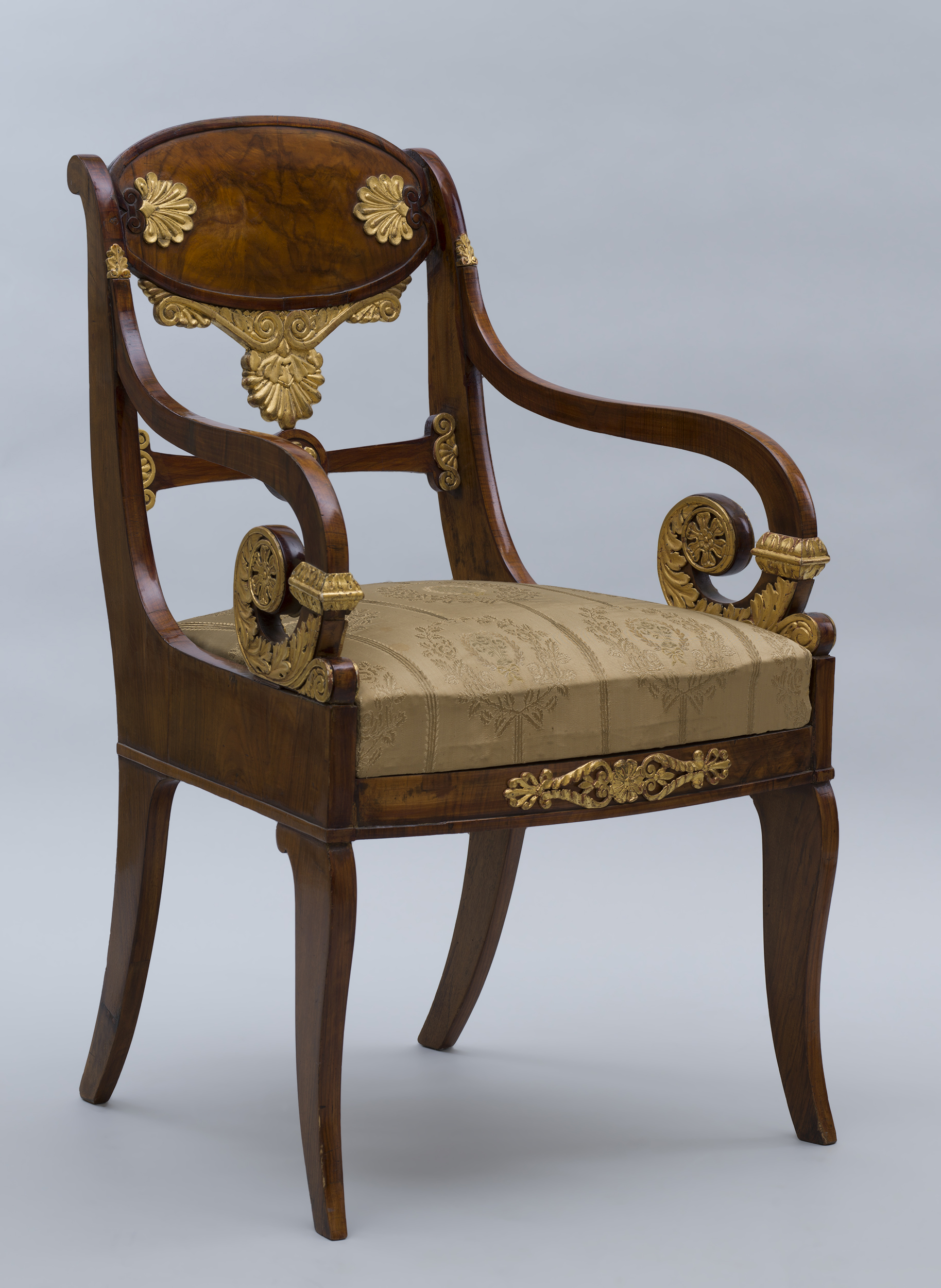 Fotel o trapezoidalnym siedzisku, na czterech wąskich szablastych nogach o przekroju prostokątnym, lekko zbieżnych, przednich wygiętych do przodu, a tylnych nieco odgiętych ku tyłowi. Oparcie lekko odchylone do tyłu, płynnie przechodzące w ramiaki boczne siedziska, dwukrotnie szersze od ramiaków przedniego i tylnego. U góry oparcia znajduje się pozioma, owalna płycina ujęta w wąską ramkę, po bokach wolutowo zwiniętą do środka od góry i od dołu. Z połączenia wolutek wyrastają ku środkowi dwie złocone palmetki. Do dolnej krawędzi płyciny przymocowana została płaskorzeźbiona złocona palmeta oparta na dwóch połączonych ze sobą pośrodku symetrycznych wolutach. Poniżej niej wąska, pozioma przewiązka, na której pośrodku umieszczona została niewielka okrągła płycina wypełniona złoconą rozetką. Poręcze w formie dużych, luźno zwiniętych wolut płynnie spływają od górnej części oparcia i opierają się na bocznych ramiakach cargi, w dolnej partii ich powierzchnie zdobią płaskorzeźbione złocone detale z motywem kimationu, liście akantu oraz rozety. Na przednim ramiaku pod siedziskiem umieszczono płaskorzeźbiony motyw złoconej rozety liściastej ujętej po obu stronach przez zwinięte na kształt liry liście akantu. Siedzisko tapicerowane, obite złocistym adamaszkiem w wąskie paski na których rozłożone są naprzemiennie duże różane wieńce.