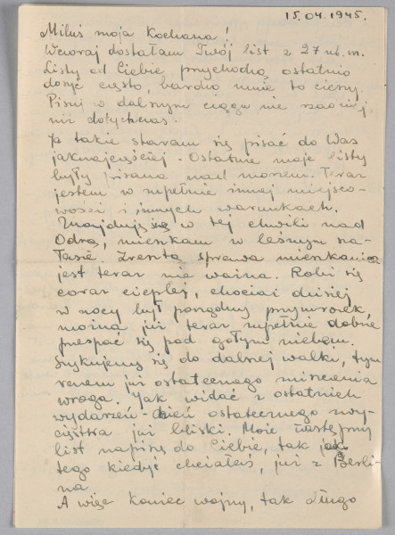 List Haliny Altman do Emilii Endler na dwóch czystych kartach papieru, zapisanych obustronnie. Z treści: „Jak widać z ostatnich wydarzeń – dzień ostatecznego zwycięstwa już bliski. Może następny list napiszę do Ciebie, tak jak tego kiedyś chciałaś, już z Berlina. A więc koniec wojny, tak długo oczekiwany, już nie za górami. Jakoś nie bardzo sobie wyobrażam ten moment. Wielu z nas znajdzie się na rozdrożu, nie wiedząc, co ze sobą robić. Ja jestem w tym szczęśliwym położeniu, że mam «dom» – będę miała zawsze oparcie. A co dalej – zobaczymy”.