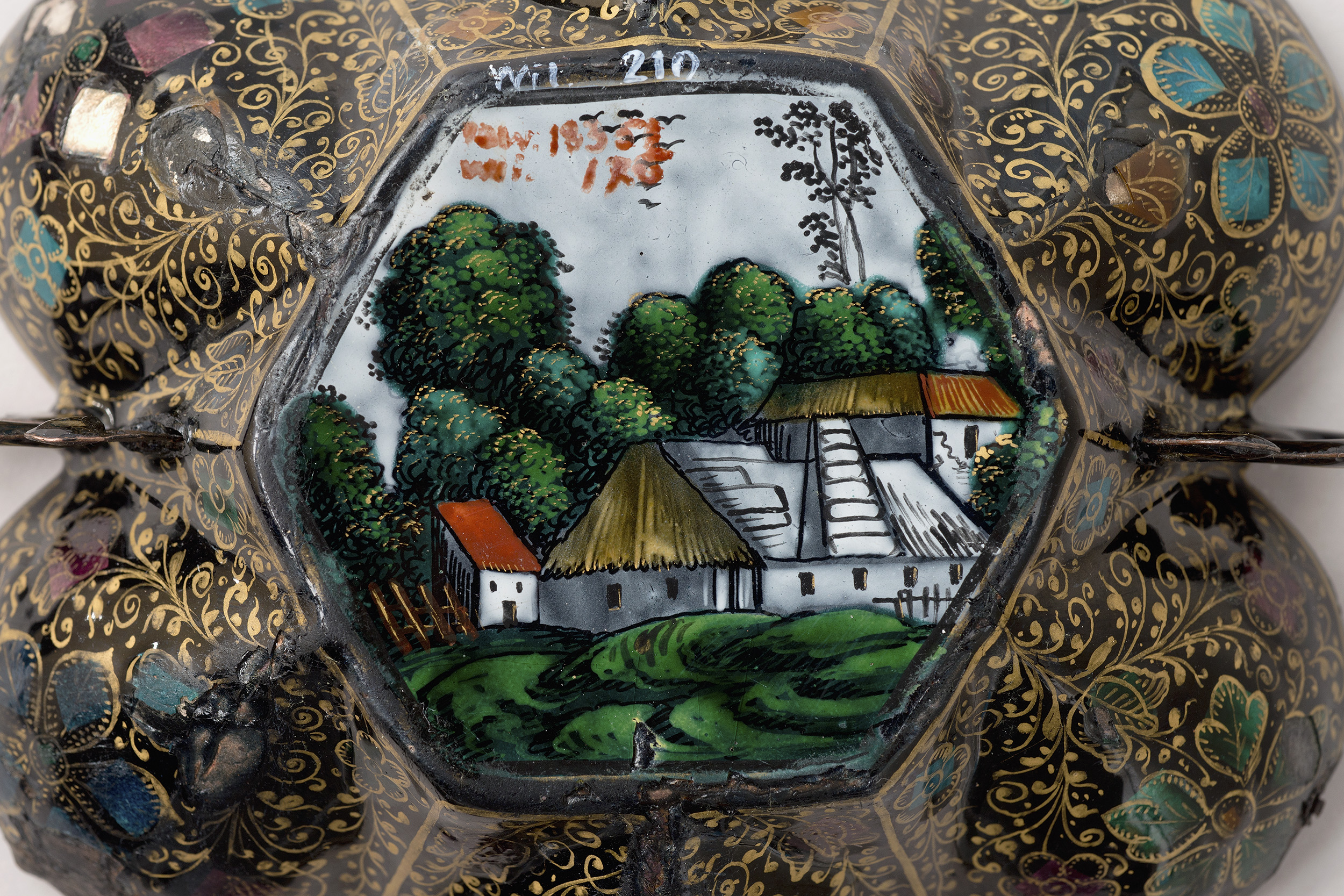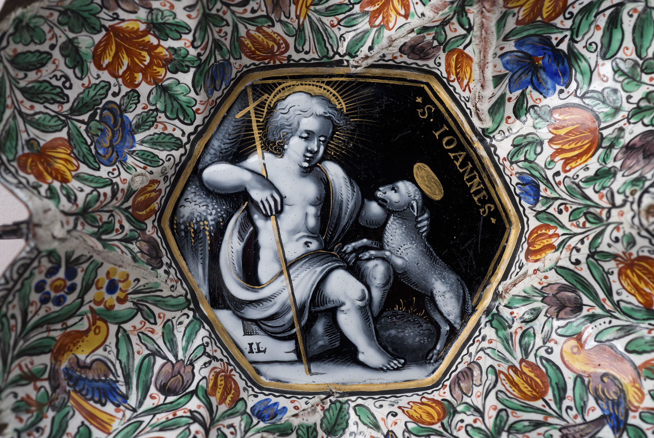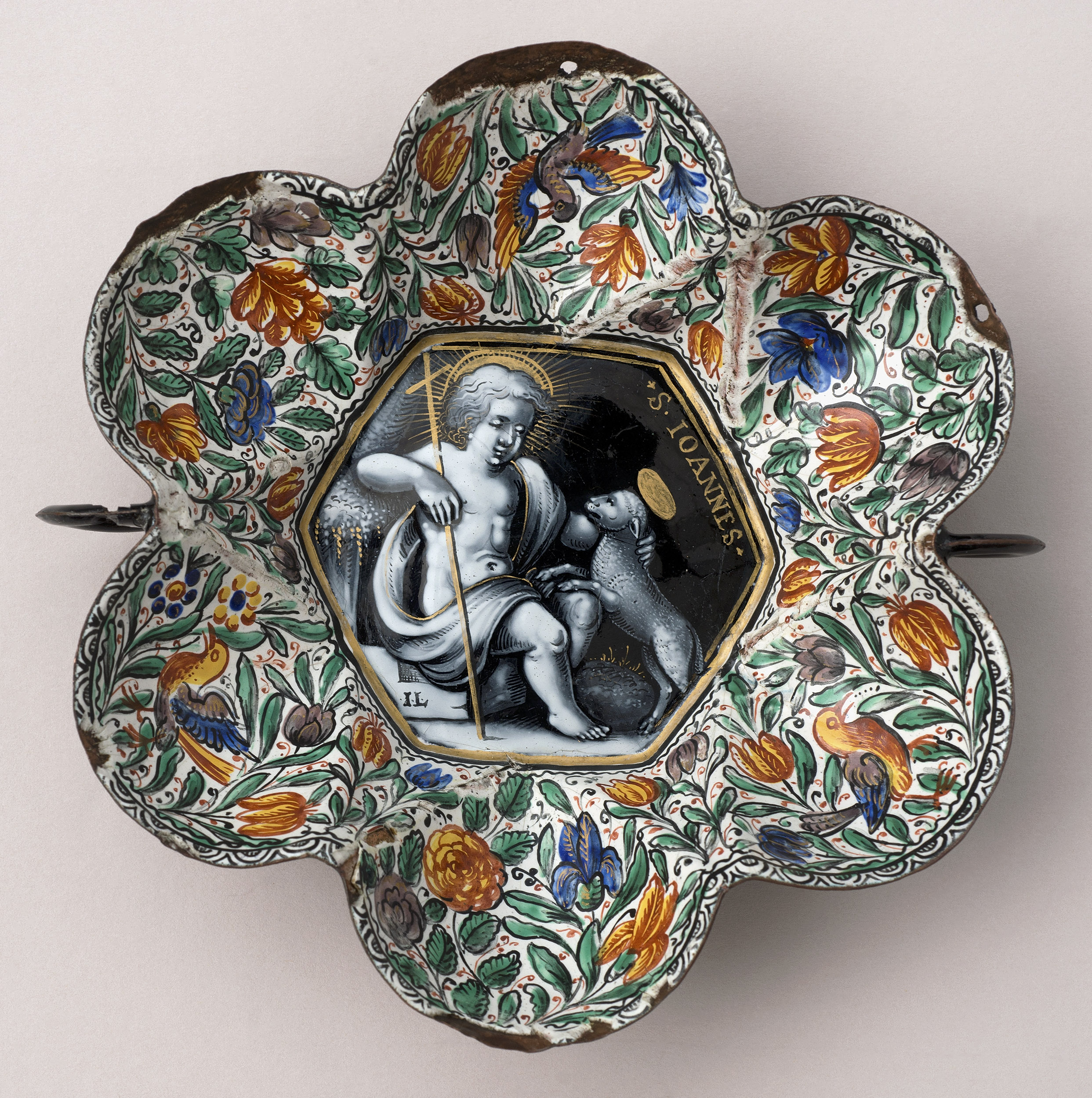 Czarka o sześciokątnym dnie i sześciopłatkowym kołnierzu, z obu stron pokryta wielobarwną emalią. Dekoracja wewnątrz kołnierza skomponowana na białym tle. Stanowią ją kwiaty i ptaki w kolorach: zielonym, żółtym i szafirowym. Boki zewnętrzne, pokryte czarną emalią, złoconą w arabeski i kwiaty, stanowią bordiurę dla scen umieszczonych po obu stronach dna. Dno sześcioboczne, od wewnątrz jest pokryte dekoracją en grisaille na czarnym tle, ukazującą postać siedzącego św. Jana. Święty trzyma krzyż w prawym ręku, a lewą obejmuje baranka. Wyżej, złoconymi literami, napis: S. Joannes. Od zewnątrz na dnie znajduje się wielobarwny pejzaż letni z domkami na tle grupy drzew. W lewym dolnym rogu przedstawienia wewnątrz czarki czarną farbą namalowany monogram I.L. (monogramem tym posługiwał się zarówno Jacques Laudin I, jak i Jacques Laudin II).