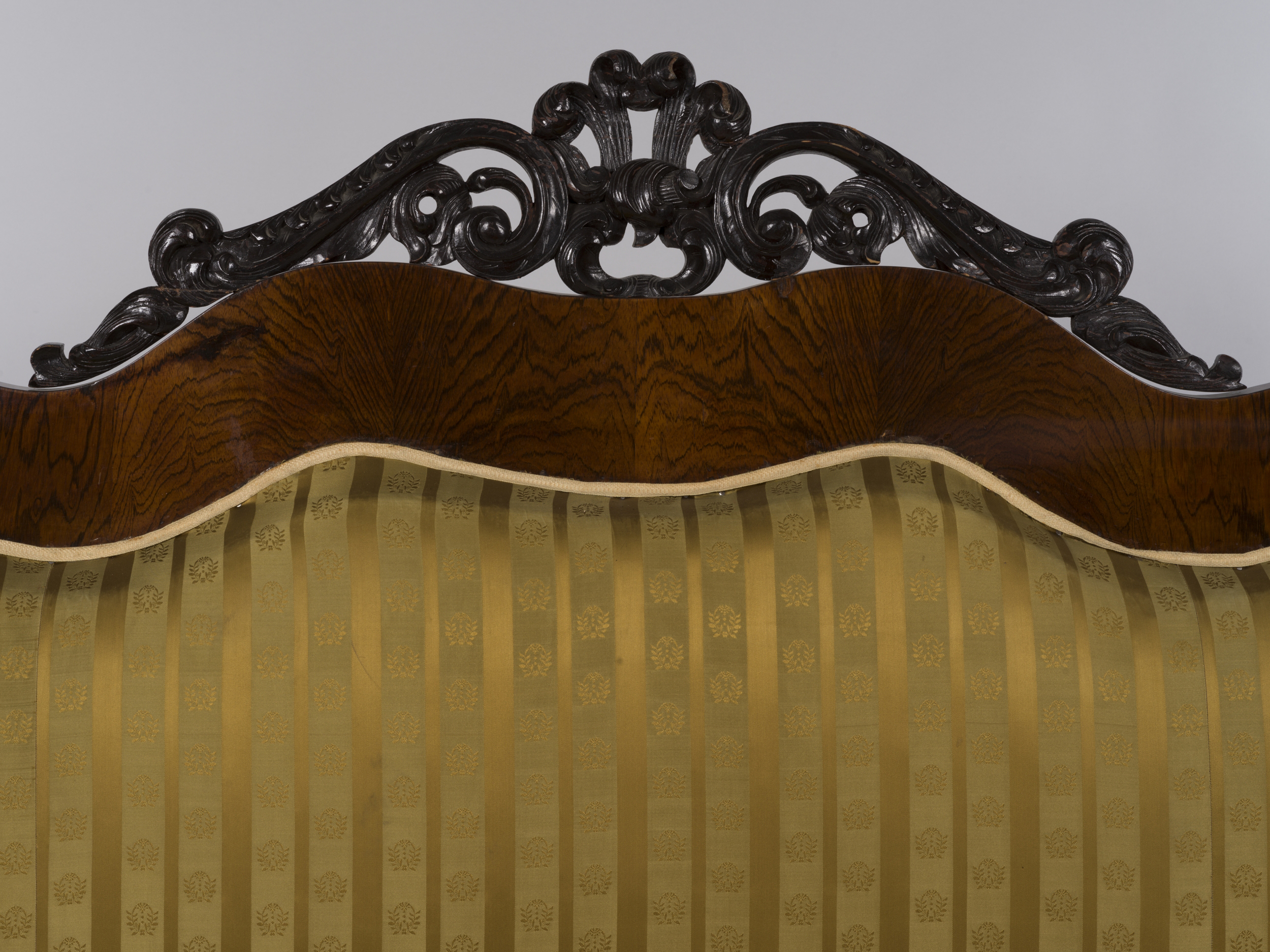 Kanapa o prostokątnym siedzisku, na czterech niskich nogach, z których przednie są tralkowo toczone, zaś tylne o przekroju prostokątnym, lekko zbieżne, nieco odgięte ku tyłowi, płynnie przechodzą ramiaki boczne oparcia, esowato odchylonego do tyłu. Oparcie wysokie, u góry zamknięte linią falistą, szersze u góry, w dolnej partii przewężone. Szeroki i płaski falisty ramiak górny w części środkowej od góry ozdobiony został ażurowym rzeźbionym zwieńczeniem o motywach roślinnych, w formie pary wolut. Ramiaki boczne oparcia zwężające się ku dołowi, tuż nad siedziskiem nieco poszerzone i przełamane, poniżej przełamania przechodzące w tylne nogi. Poręcze lekko opadające, z długimi nerkowatymi podłokietnikami, po bokach gładkie, na górnej powierzchni powyżej podłokietników płaskorzeźbione w motywy roślinne, osadzone w masywnych rzeźbionych wspornikach o motywach rocaille. Okrzynienie proste. Ramiaki oparcia, boczne płaszczyzny poręczy, oskrzynienie oraz tylne nogi pokryte fornirem palisandrowym, przednie nogi oraz elementy rzeźbione lakierowane, w kolorze ciemnobrązowym. Oparcie, siedzisko i podłokietniki tapicerowane, obite złotym adamaszkiem w parzyste kremowe pasy pokryte deseniem z wieńców laurowych.