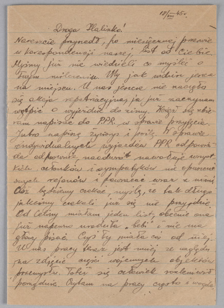 „U nas jeszcze nie zaczęła się akcja repatriacyjna, ja już zaczynam wątpić o wyjeździe do zimy. Wciąż się zbieram napisać do P.P.R. w sprawie przyjęcia. Jutro napiszę życiorys i poślę. W sprawie indywidualnych wyjazdów PPR odpowiada odmownie, na odwrót nawołuje wszystkich członków i sympatyków nie opuszczać swych rejonów i powracać wraz z innymi. [...] Od Celiny miałam jeden list, obecnie ona już na pewno urodziła «bebi» i nie ma głowy pisać. [...] U nas pracy teraz jest mniej ze względu na zdjęcie części wojennych obiektów przemysłu. Toteż się człowiek rozleniwił porządnie. Czytam na pracy często i w ogóle. [...] Droga Halik! Bardzo bym Cię prosiła, jeżeli masz jakieś możliwośc[i], jednak Ty jesteś na miejscu, dowiedz się o mojej rodzinie. Tyś kiedyś pisała o Mietku Endlerze, który był w wojsku, może on wie o kimkolwiek. Ja pisałam do Warszawy w lutym na adres stary (śmiesznie, co?) i otrzymałam [z] powrotem list z napisem «dom spalony», a o ludziach nic. Ty się nie dziw, ja wiem, że oni nie żyją, ale chce się jakiś znak bardziej dokładny, choć ślad, choć kierunek, gdzie oni zginęli, a jak to się można domyśleć. Tak, trzeba skończyć te wspomnienia. | Jak myślisz, czy będziemy mieli możliwość pozostać się w centralnej Polsce, choćby [z] początku w Krakowie, zwłaszcza, że Marcina mieszkanie na pewno jest całe”.