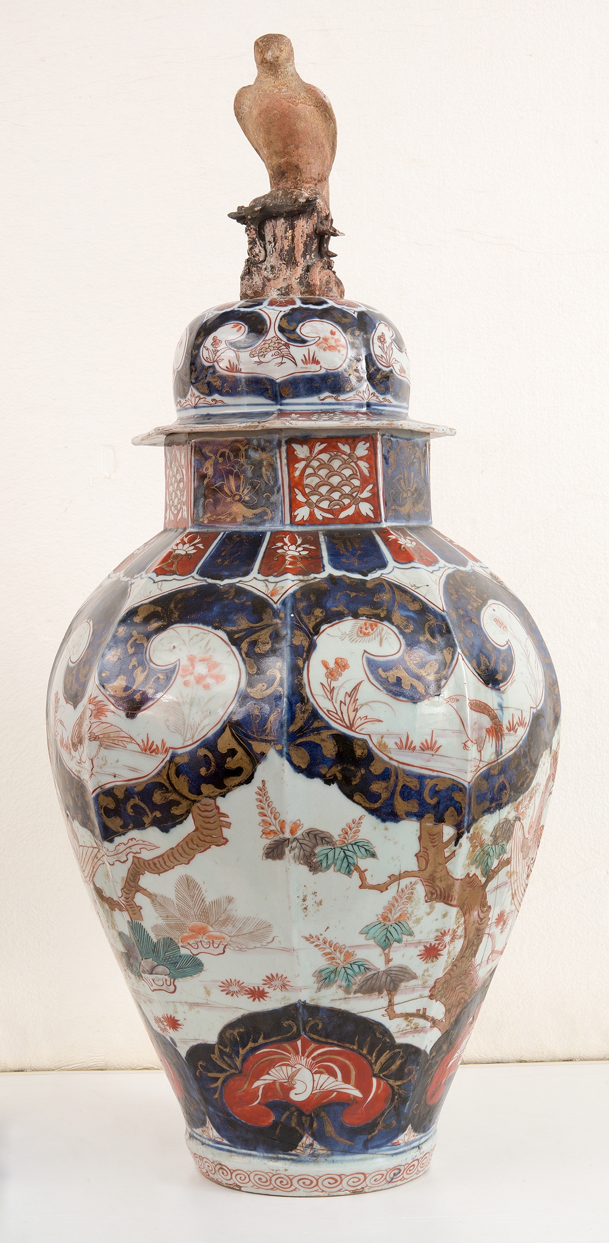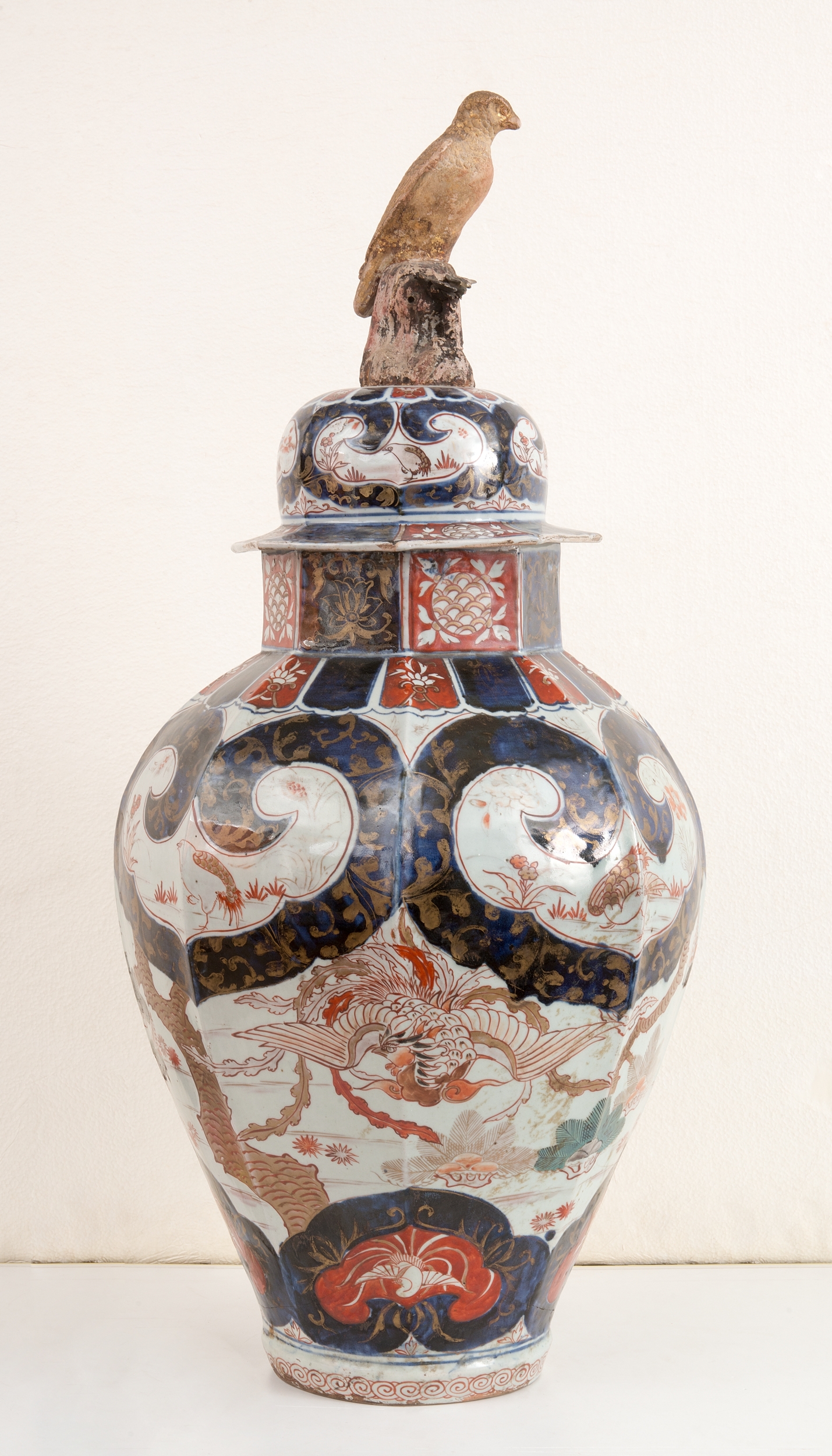 Wysoki porcelanowy ośmioboczny wazon z pokrywą. Brzusiec naczynia rozszerza się w kierunku ramion i zwęża przechodząc w stosukowo wysoką, również ośmioboczną szyję. Na niej spoczywa wysoko wysklepiona pokrywa z kołnierzem, zwieńczona figurą drapieżnego ptaka stojącego na skale.