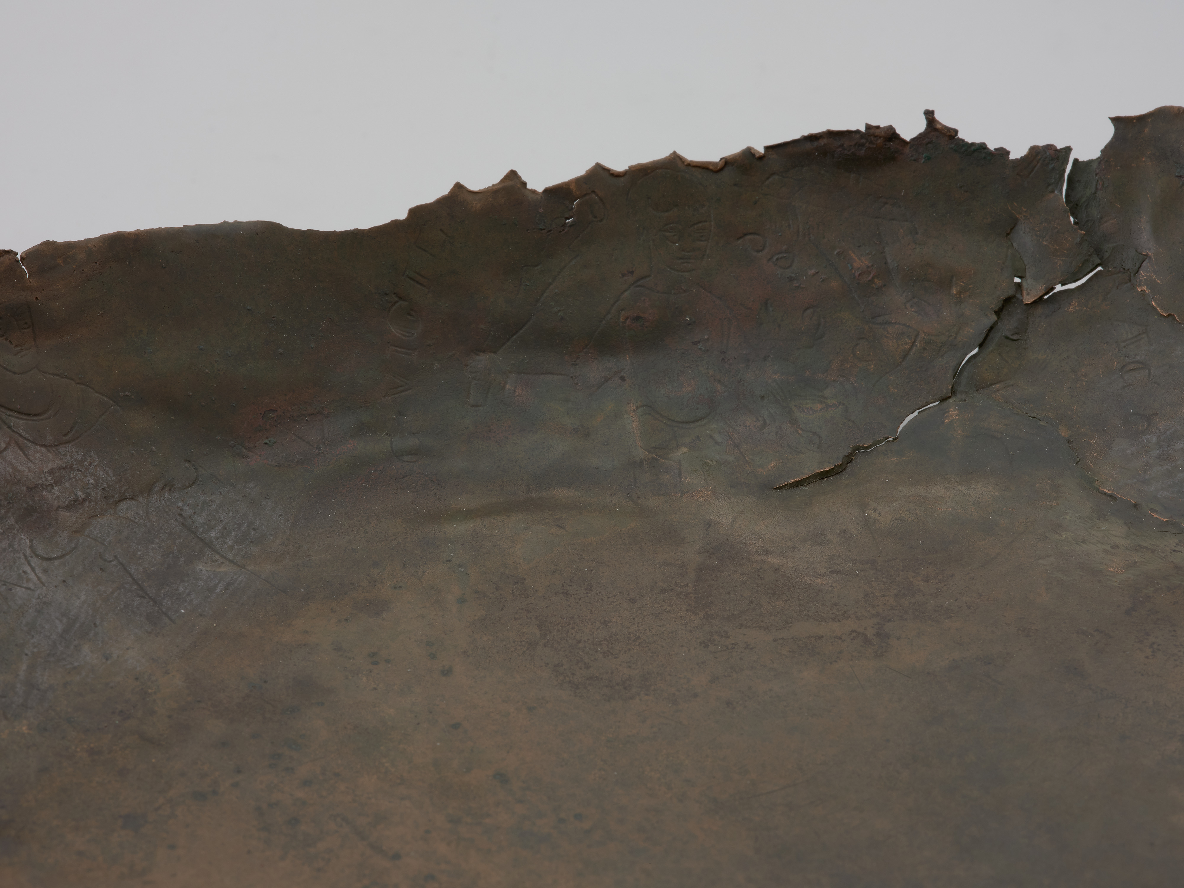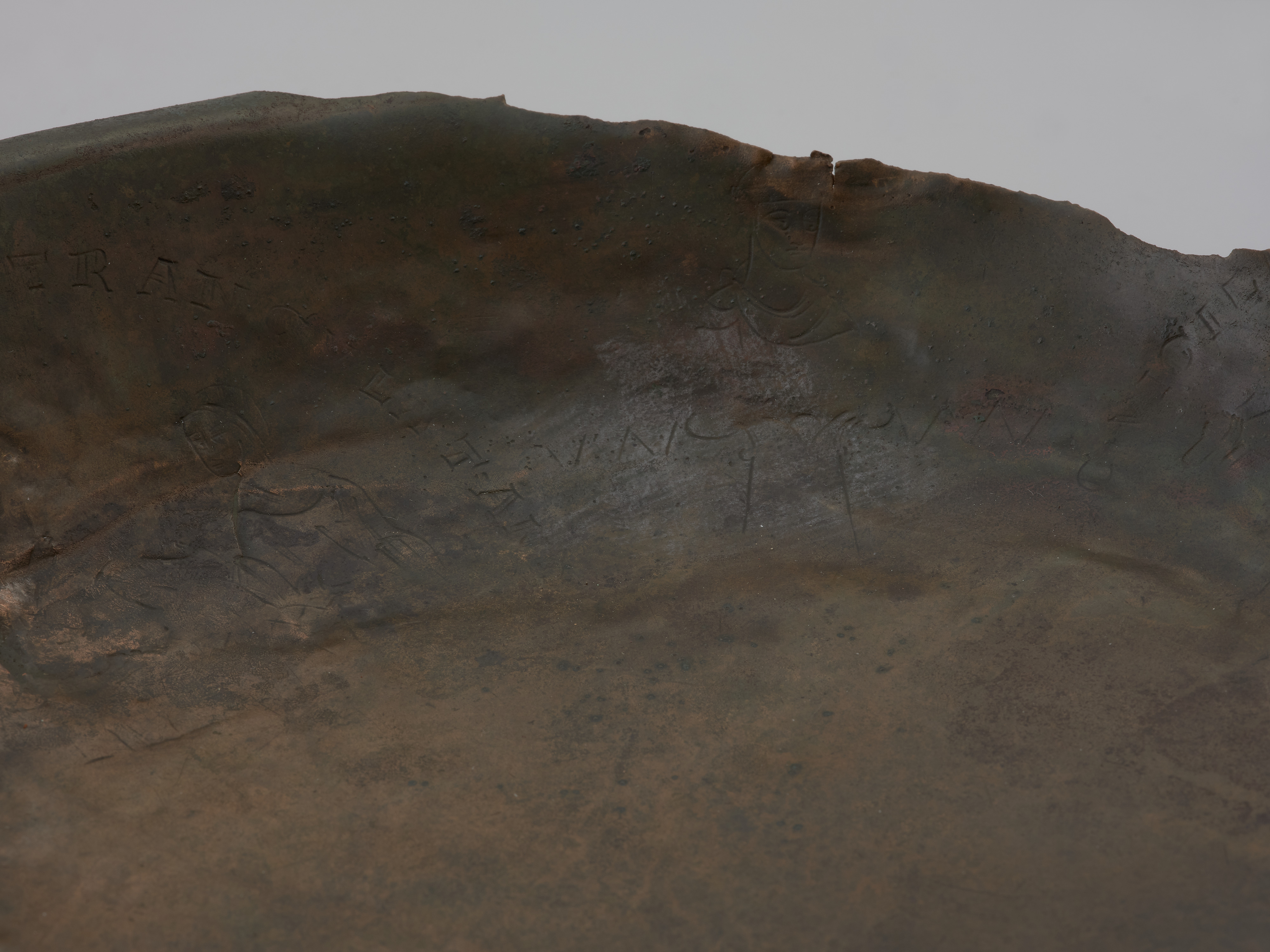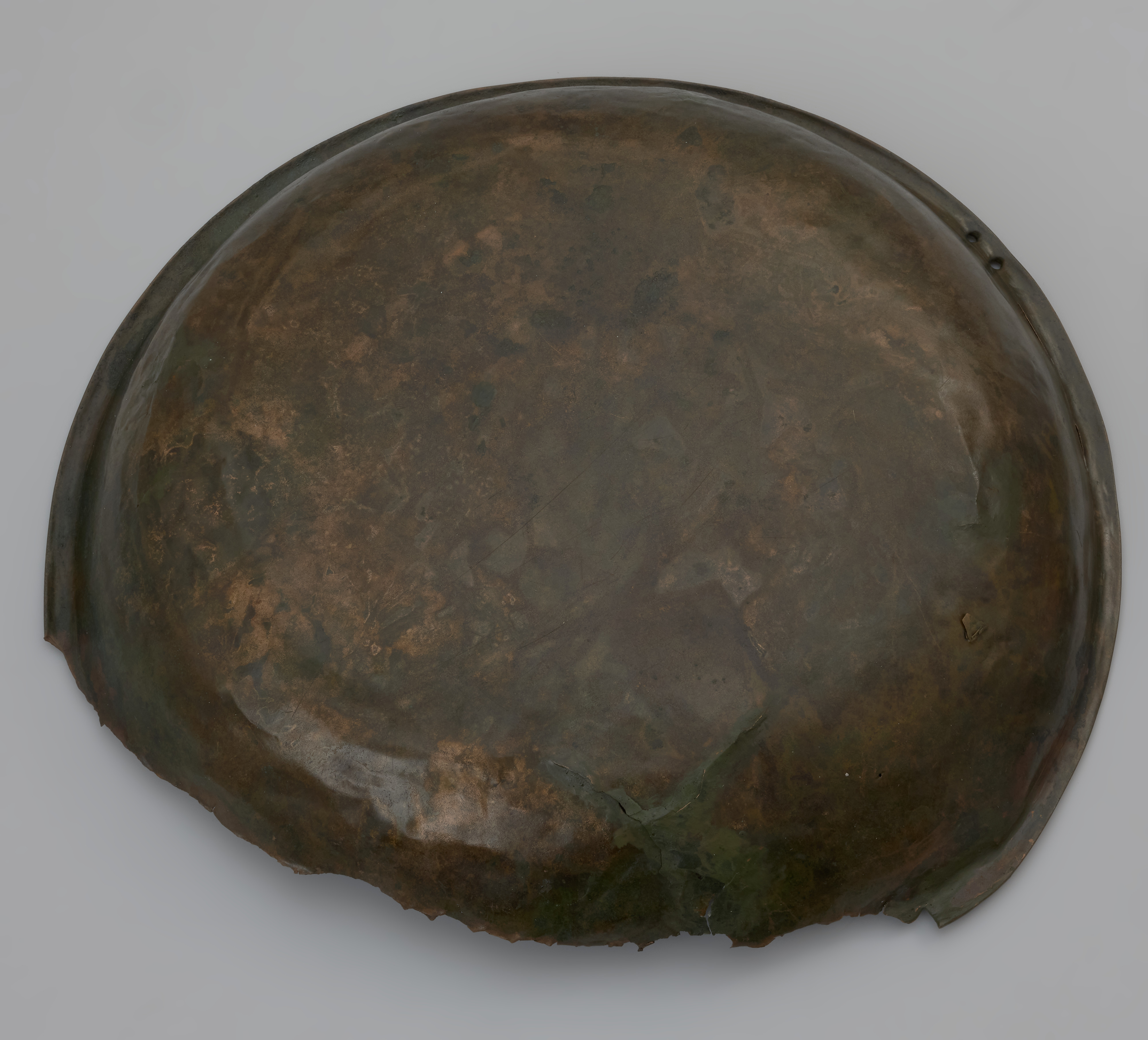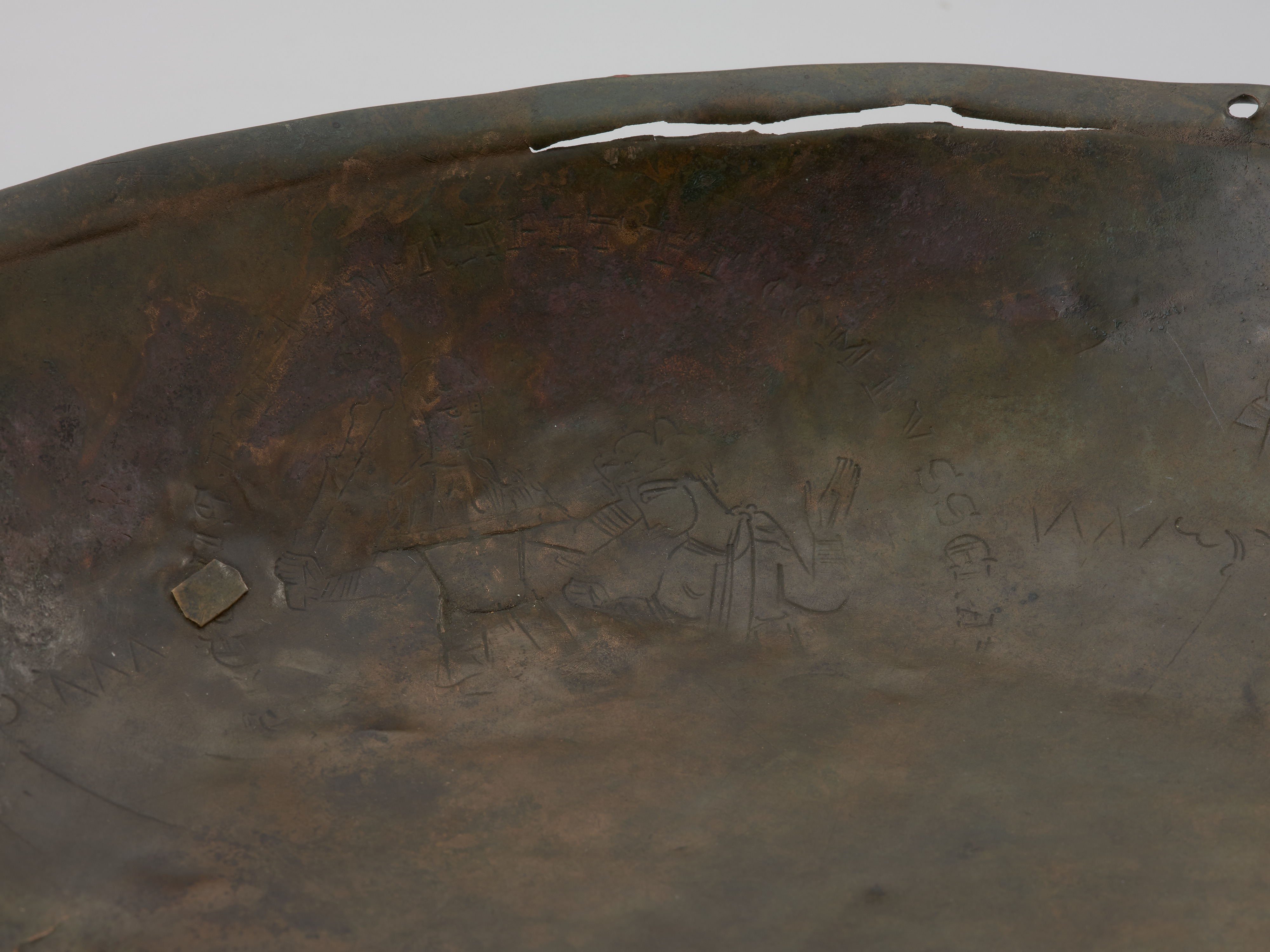 Naczynie wykonane jest z jednego płata blachy ze stopu miedzi poprzez mechaniczne rozklepywanie i formowanie kształtu. Ma wąski wywinięty na zewnątrz brzeg z zaokrągloną i lekko pogrubioną krawędzią, z dwoma otworami oraz płaskie dno, w którym widoczna jest niewielka łatka będąca świadectwem naprawy.