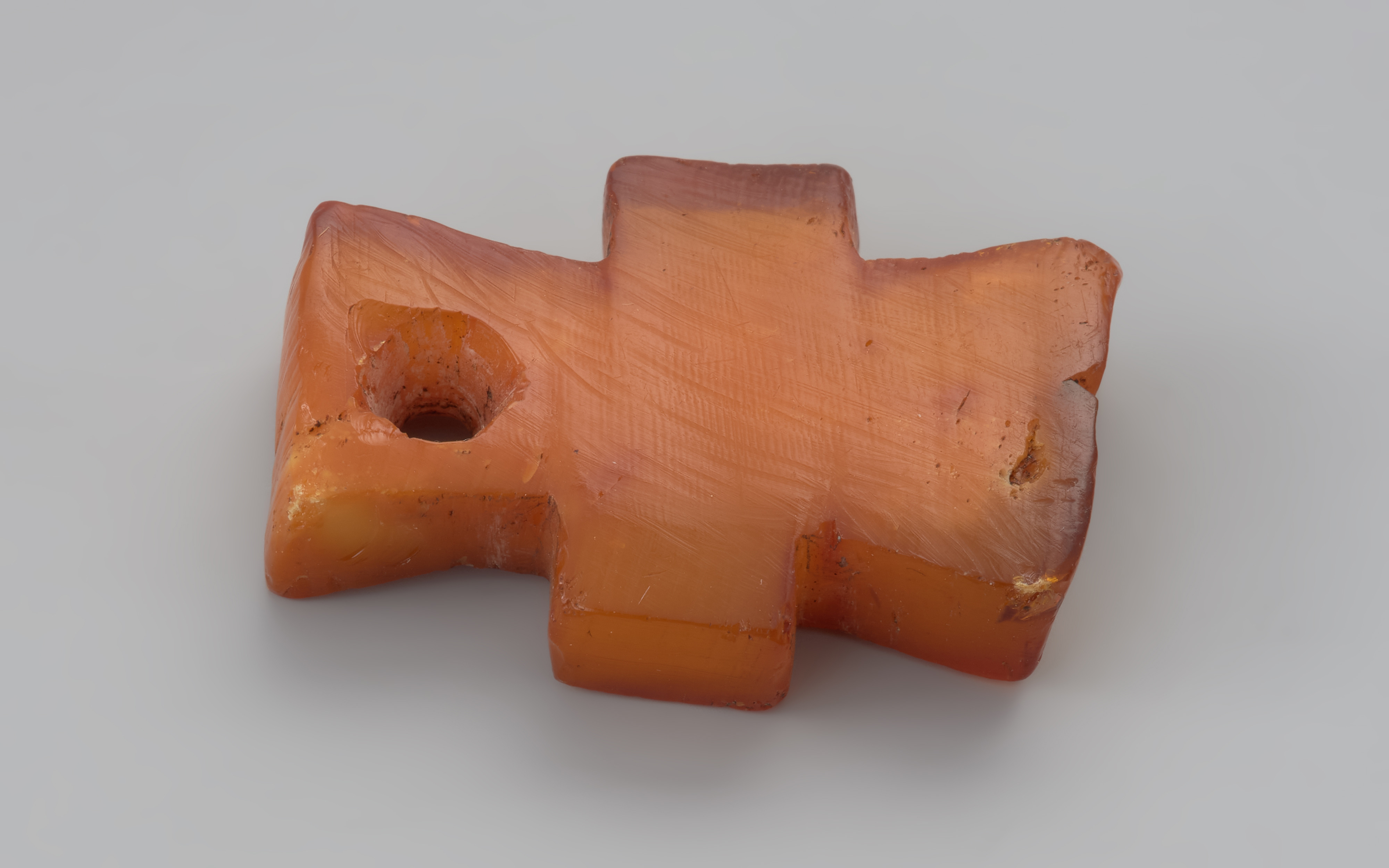 Zawieszka bursztynowa odkryta podczas badań wykopaliskowych w 1965 lub 1966 roku na Starym Mieście w okolicy ratusza w Kamieniu Pomorskim.
