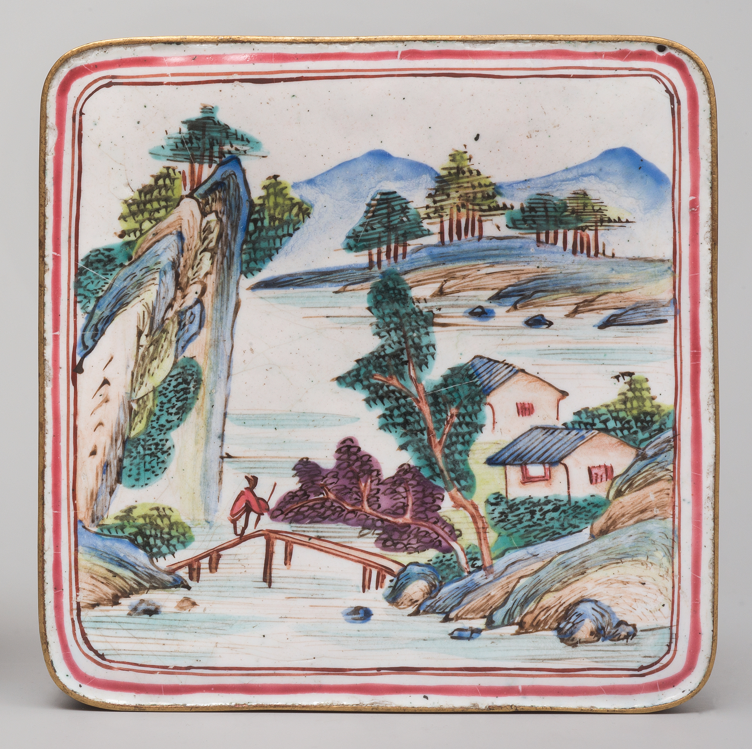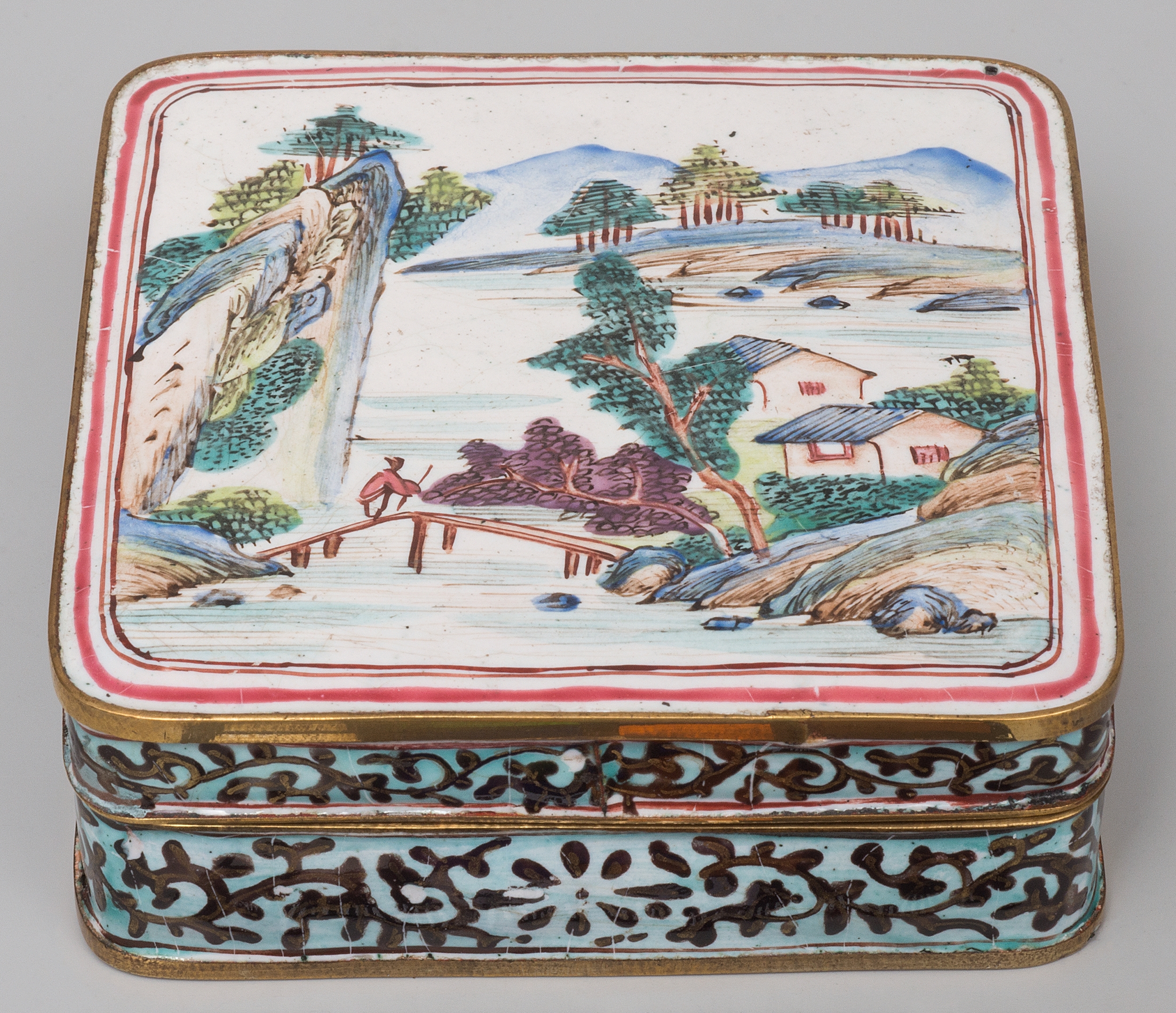 Miedziane, kwadratowe pudełeczko z delikatnie zaokrąglonymi narożami. Składa się z dwóch części – korpusu i pokrywki. Wieczko pudełka zdobi scena pejzażowa z typowym chińskim krajobrazem – z wysokimi górami, z drzewami, skałami, z akwenem wodnym, z elementami architektury i z majaczącą postacią ludzką. Powierzchnia boków wieczka i korpusu pudełeczka została pokryta gęstą, mocno stylizowaną wicią roślinną.