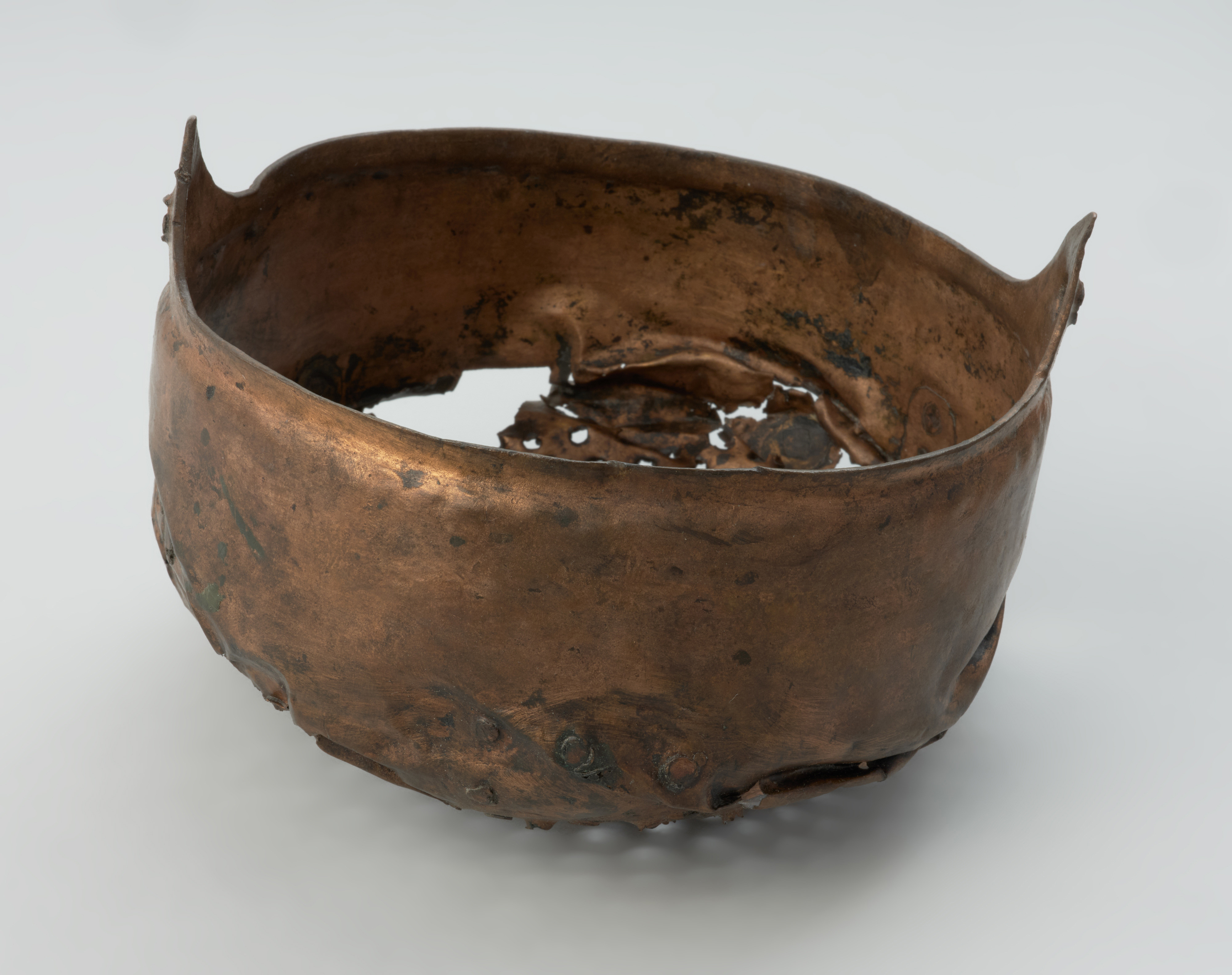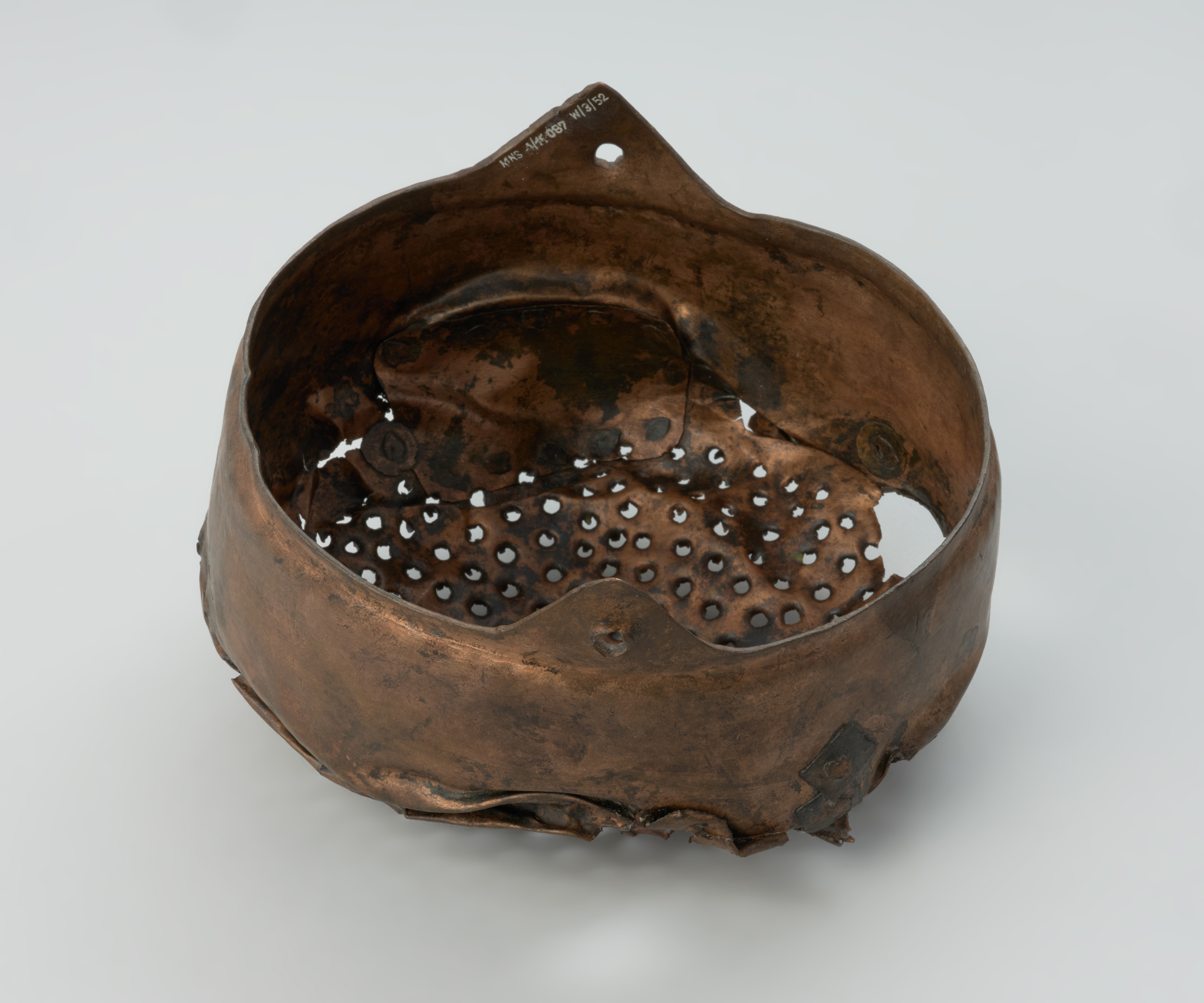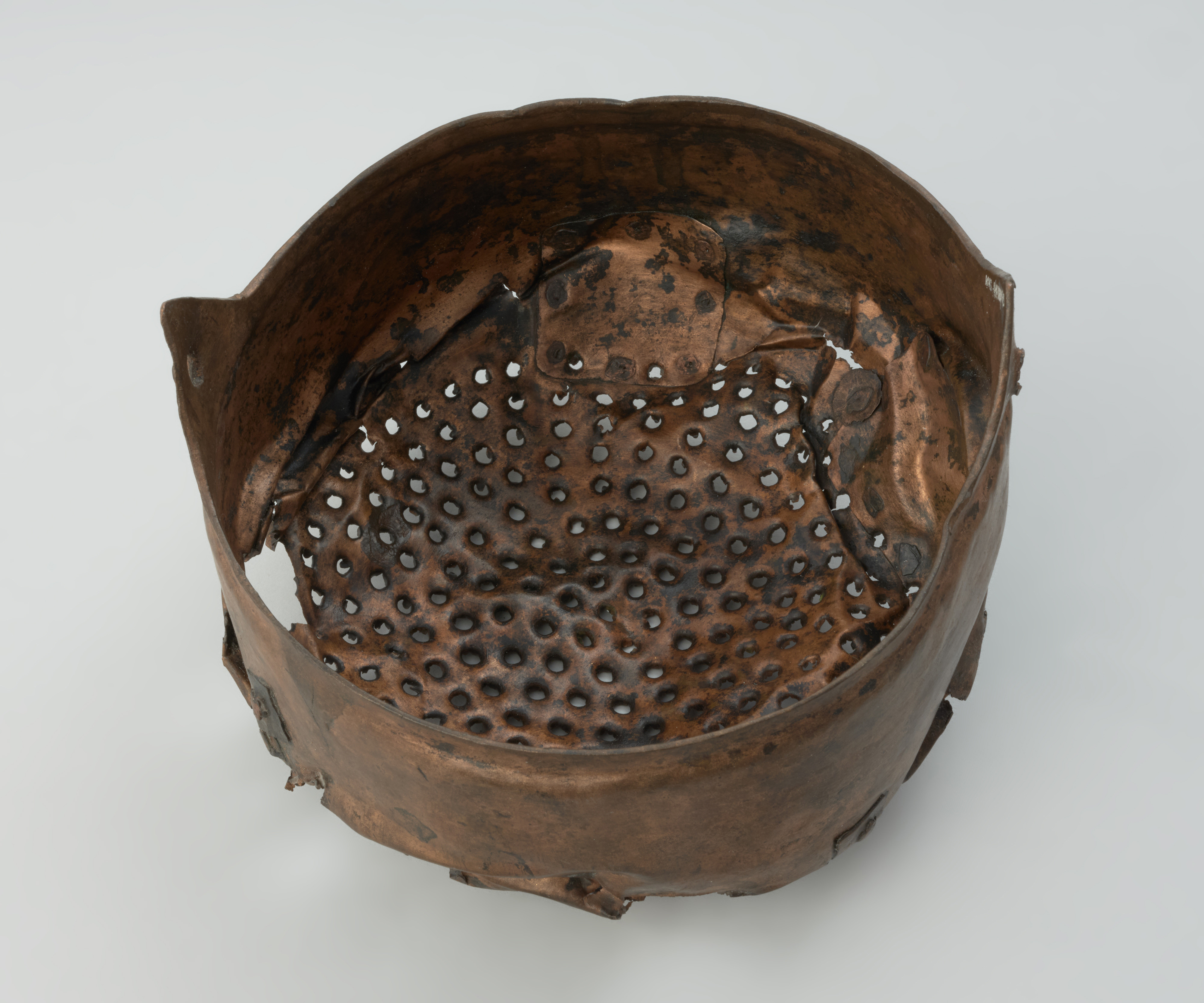 Cedzak ze stopu miedzi odkryto podczas podwodnych badań archeologicznych przeprowadzonych w 1952 roku przez Władysława Filipowiaka w Wolinie, pow. kamieński. Wydobyty został z mułu rzecznego na głębokości 9,52 m podczas prac hydrotechnicznych. Oprócz cedzaka natrafiono wówczas na dwa kotły, także wykonane ze stopu miedzi. Cedzak wykonano metodą rozklepywania arkusza blachy i formowania zaplanowanego kształtu. Jest zaopatrzony w dwa trójkątne ucha o wysokości 2,8 cm z otworami. Na powierzchni wewnętrznej widoczne są liczne ślady po formowaniu kształtu naczynia powstałe w wyniku uderzenia w blachę tępym narzędziem. Można także zaobserwować pozostałości zabiegów naprawczych – zasklepiania pęknięć i dziur. Do reperacji uszkodzeń wykorzystywano fragmenty blach, które nakładano z jednej lub z dwóch stron, w zależności od stopnia ubytku. W przypadku największego uszkodzenia zastosowano łatkę blachy o wymiarach 8 × 5 cm, przytwierdzając ją 12 niewielkimi nitami. Dno cedzaka ma liczne otwory o średnicy około 0,3 cm. Naczynie wykonano najprawdopodobniej z uszkodzonego kotła, który w wyniku licznych napraw nie spełniał już swojej pierwotnej funkcji.