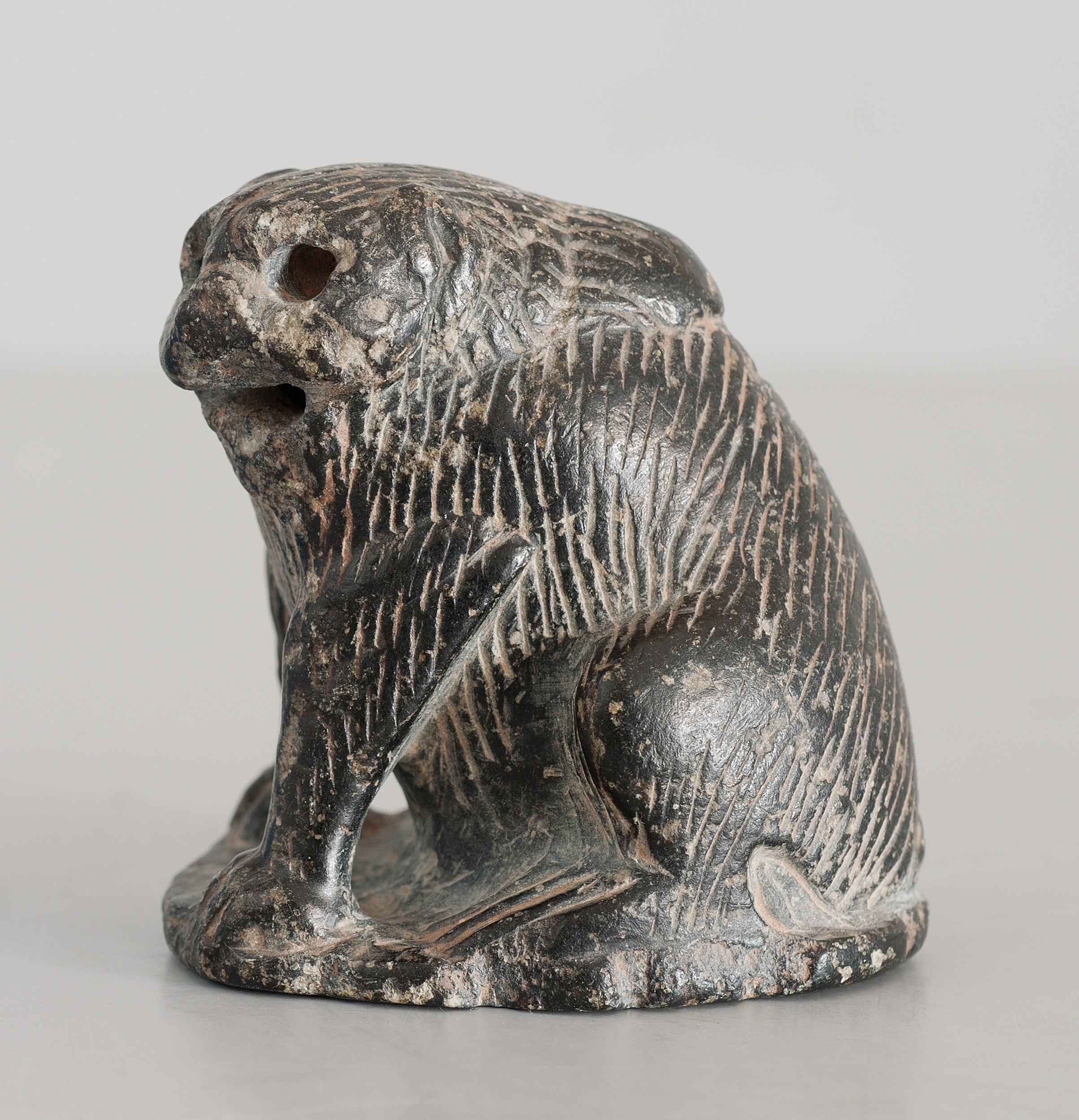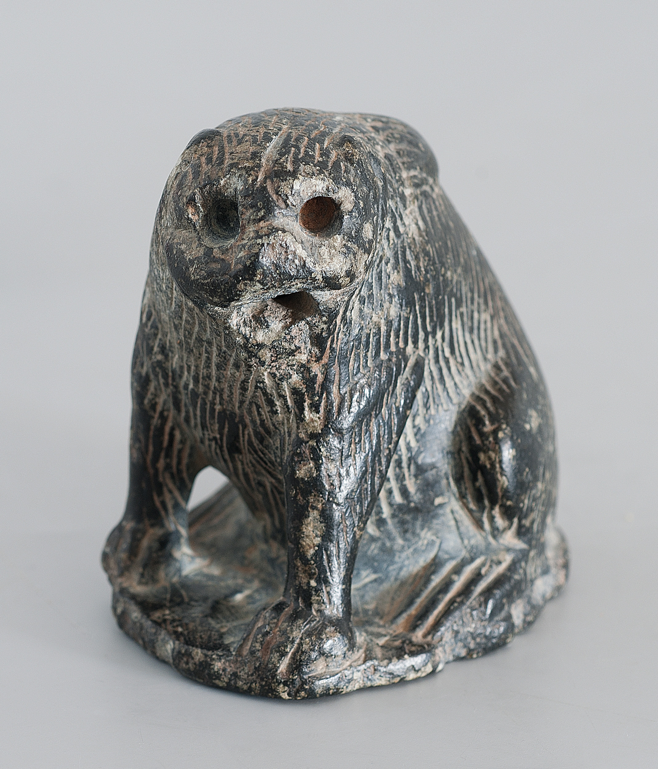 Niewielka kamienna figurka przedstawiająca zwierzę przysiadające na tylnych łapach, wsparte na przednich. Głowa została opracowana pobieżnie, być może nie została dokończona. W miejscach oczu znajdują się otwory, w paszczy również pozostawiono nieobrobiony w materiale otwór. Rzeźba została opracowana w surowcu skalnym z nacięciami powierzchni figurki, w celu uzyskania struktury futra zwierzęcia. Dodatkowo w powstałe zagłębienia wtarto jasną zaprawę nadającą plastyczności i podkreślającą powstały efekt.