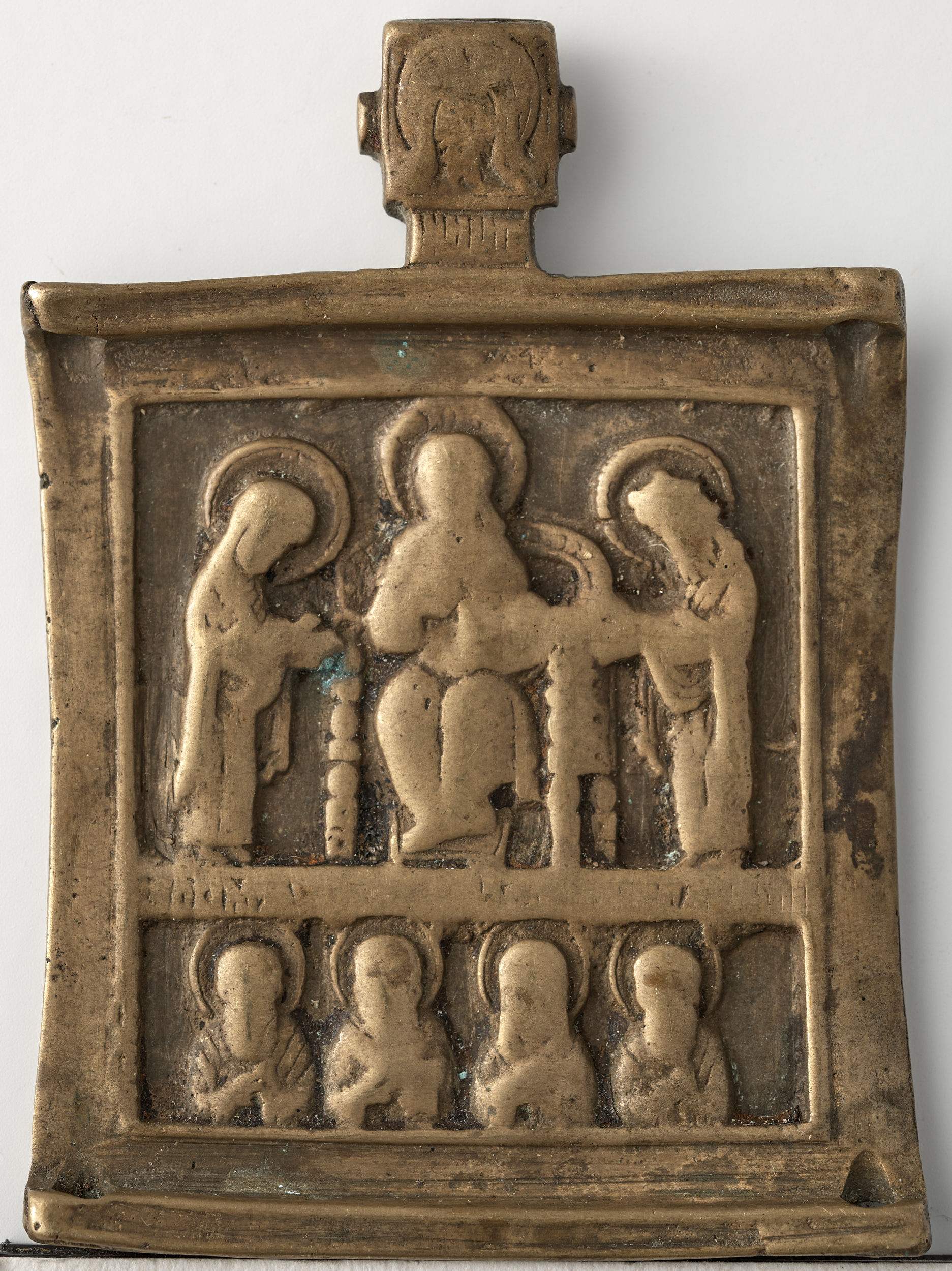 Deesis z greckiego oznacza błaganie, prośbę. Od wczesnego chrześcijaństwa prośby modlitewne zawarte są w tekstach liturgicznych: dziękczynnej modlitwie eucharystycznej, modlitwach błagalnych, w których Kościół ucieka się do orędownictwa Bogurodzicy, Jana Chrzciciela, aniołów, apostołów, męczenników, świętych, którzy zanoszą modlitwy wiernych do Chrystusa. Wizerunek Deesis, znany od VI – VII w., został utrwalony od X w. po okresie obrazoburstwa w kilku wariantach, począwszy od wersji podstawowej ze stojącym lub tronującym Chrystusem – Pantokratorem Wszechwładcą i zwracającymi się do niego największymi orędownikami ludzkości, Bogurodzicą i Janem Chrzcicielem (patrz S.12824MŁ), a skończywszy na Wielkiej Deesis poszerzonej o archaniołów, apostołów, męczenników, wybranych świętych (S.12788MŁ; S.12830MŁ). Prezentowana ikona Deesis jest fragmentem odlanego w metalu tryptyku (zachowane środkowe skrzydło) spopularyzowanego w środowisku staroobrzędowców. Oprócz klasycznego trójosobowo „trymorphonu” – tronującego Pantokratora, Bogurodzicy i Jana Chrzciciela, na dole umieszczono wybranych świętych: Leoncjusza Rostowskiego, św. Mikołaj oraz Zozyma i Sawacjusza Sołowieckich. Biskup Mirry św. Mikołaj, między innymi patron podróżnych, był zawsze otoczony na Rusi wielką czcią. Żyjący w XI w. mnich kijowsko - peczerski Leoncjusz, zostawszy biskupem Rostowa nad Donem, nawracając pogrążoną w pogaństwie prowincję, miał ponieść śmierć męczeńską. W środowisku przeciwnych reformie liturgicznej staroobrzędowców pochodzący z XV w Zozym i Sawacjusz, założyciele pustelni, a potem monasteru na wyspach Sołowieckich nad Morzem Białym, byli stawiani jako wzór życia monastycznego. Założony przez nich monastyr, sprzeciwiający się moskiewskiej reformie patriarchy Nikona, zdobyty zbrojnie przez wojska carskie w 1676 r., postrzegany był jako ostoja tradycji prawosławnej.