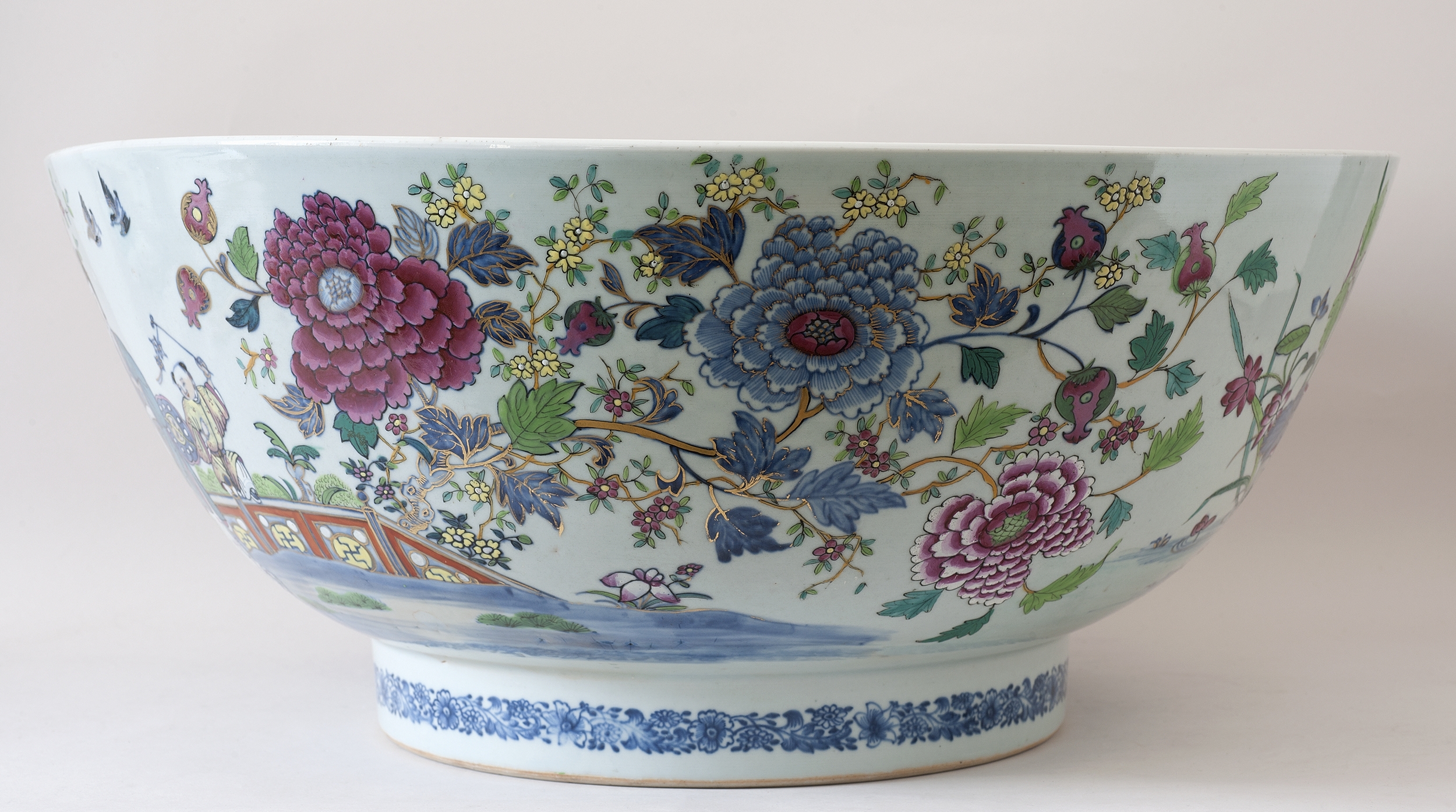Duża porcelanowa misa dekorowana stylu famille rose. Famille rose to francuski termin oznaczający przynależność do określonej grupy porcelany chińskiej. W tym przypadku jest to tzw. rodzina różowych, czyli wyroby dekorowane naszkliwnymi farbami z przewagą odcieni różu i purpury. Chińczycy określali je jako yangcai - „obce kolory”. Zaczęły być używane w chińskich manufakturach do zdobienia porcelany na przełomie lat 20. i 30. XVIII wieku. Najwyższy poziom artystyczny wyrobów w typie famille rose osiągnięto w wytwórniach Jingdezhen w okresie Yongzheng (1722-1735).