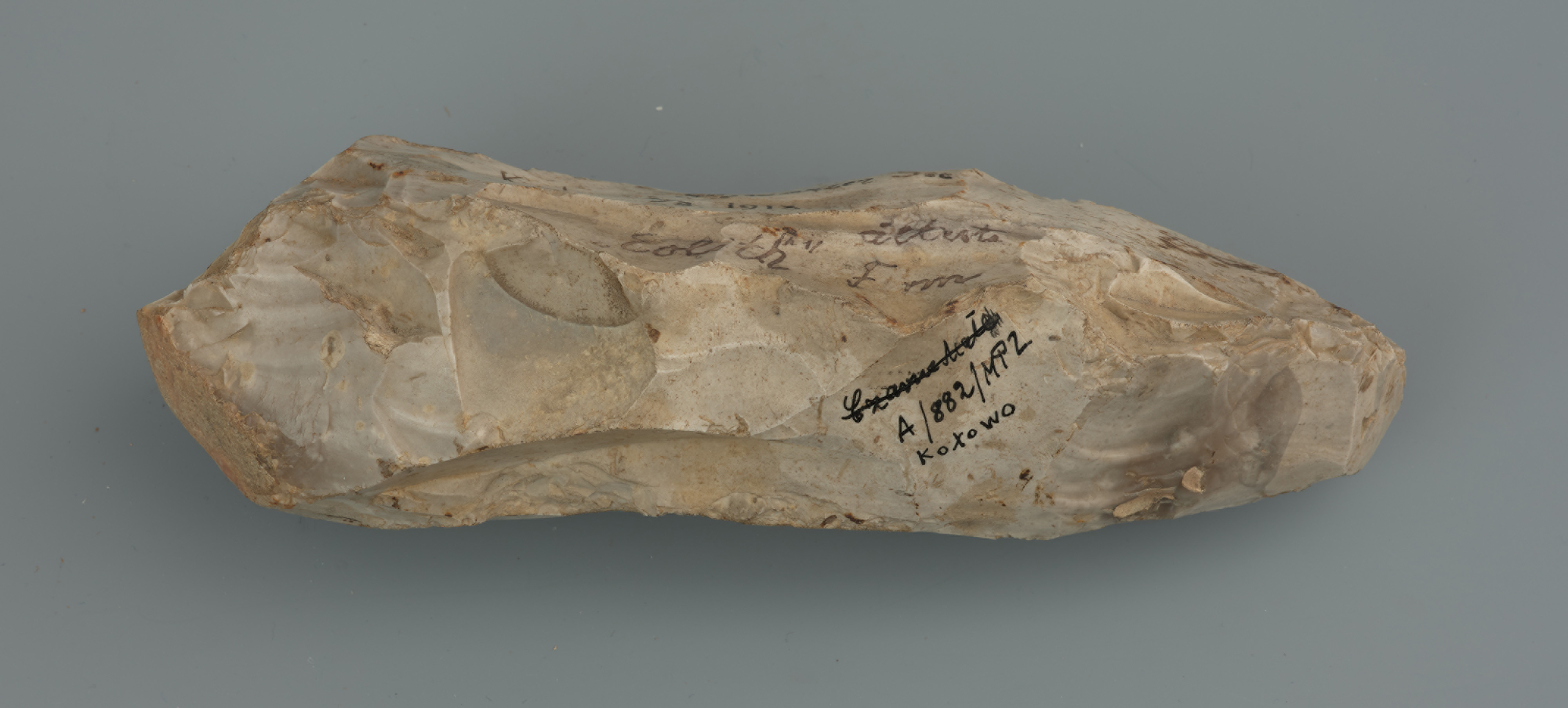 Półwytwór ciosaka rdzeniowego został znaleziony nad Jeziorem Czarnym w Kołowie, pow. gryfiński, prawdopodobnie w 1913 roku. Jest to przedmiot wykonany z krzemienia kredowego wysokiej jakości, z dużej bryły o mocno zdartej powierzchni naturalnej i spękaniami, które świadczą, że wydobyto ją z rzeki lub strumienia o wartkim nurcie. Podstawową techniką użytą do produkcji było uderzenie twardym (kamiennym) tłukiem. Ze względu na formę półwytwór ciosaka z Kołowa dosyć łatwo można pomylić z półwytworem siekiery neolitycznej. Na wczesnych etapach produkcji mezolityczne ciosaki i neolityczne siekiery tzw. czworościenne mogą wydawać się podobne, ale występuje między nimi dosyć istotna różnica. Siekiery zazwyczaj od samego początku były planowane jako narzędzia czworościenne z kątami prostymi pomiędzy ścianami i konsekwentnym odbijaniem odłupków od czterech krawędzi przy bokach, co znacząco ułatwiało formowanie narzędzia. Wcześniejsze od siekier ciosaki w większości przypadków na wczesnych etapach produkcji planowane były jako narzędzia soczewkowate, czyli z jedną dookolną krawędzią, od której odbijano odłupki naprzemiennie na obie strony. Czasami skutkowało to pozorną czworościennością, jak w przypadku prezentowanego ciosaka. Zazwyczaj jest to efekt użycia bryły krzemienia o przekroju zbliżonym do okrągłego, które mezolityczni wytwórcy starali się spłaszczać już w pierwszych etapach produkcji narzędzia. Jest rzeczą interesującą, że ciosak z Kołowa został uznany z tzw. eolit, których kolekcjonowanie było dosyć popularne na przełomie XIX/XX wieku. Tego typu narzędzia wiązano wówczas z najstarszymi etapami zasiedlenia Europy. Dzisiaj wiemy, że zdecydowana większość z nich to całkowicie naturalne fragmenty krzemienia, powstałe np. na skutek obstukiwania brył krzemienia w strumieniach, na brzegach morskich lub zniszczone przez lodowiec. Inne natomiast, jak półwytwór ciosaka z Kołowa, są zdecydowanie młodsze niż kiedyś zakładano.