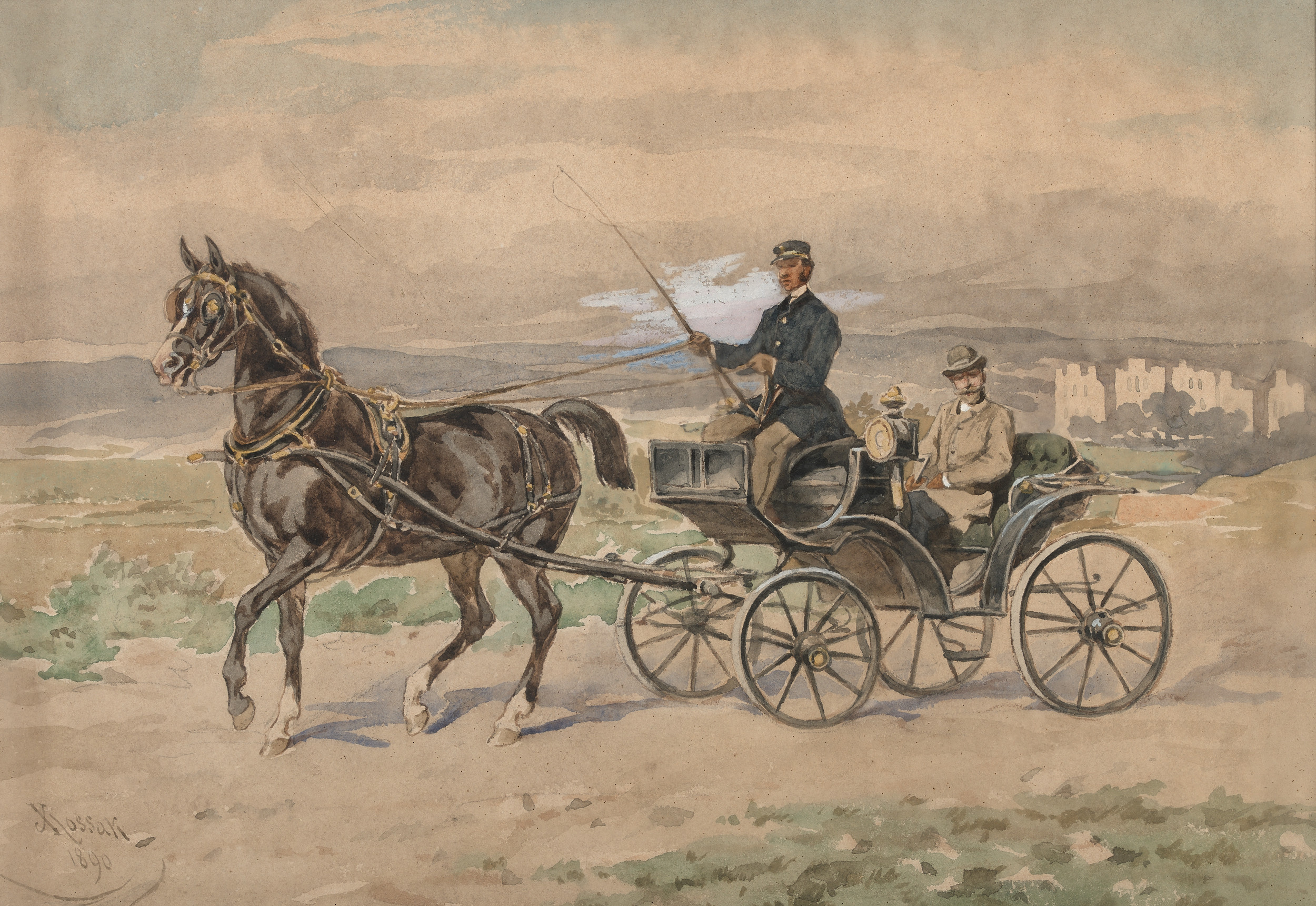 Juliusz Kossak, Doktor Śliwiński w powoziku, sygn. „Juliusz Kossak 1890”. Pochodząca z zakupów muzealnych, oryginalnie oprawna – w czarną profilowaną ramę i wiedeńskie passe-partout - akwarela Juliusza Kossaka przedstawia jednokonny zaprzęg - czarny powozik z budą powożony z kozła przez stangreta i jadącego w nim mężczyznę w średnim wieku. Akwarela ta, co dla Juliusza Kossaka było typowe, jest dokumentacyjna, by nie powiedzieć portretowa. W dyszlach widzimy bowiem karego z odmianami na nogach konia, o imieniu Murzyn, w bardzo stylowej angielskiej chomątowej, oddanej ze szczegółami, uprzęży. W pojeździe w jasnym letnim ubraniu ukazany jest jego właściciel lekarz Michał Śliwiński z Krakowa. Rozparty swobodnie na głównym siedzeniu twarz zwróconą ma na wprost patrzącego na obraz - tak zapewne pozował Kossakowi. Podobnie jak doktor Śliwiński także portretowy wizerunek otrzymał jego stangret. W dalekim tle Juliusz Kossak przedstawił ruiny zamku w Tęczynie. Akwarela ta, pod zaskakującą nazwą „Kabriolet z koniem” eksponowana była na pośmiertnej wystawie Juliusza Kossaka urządzonej w 1899 roku w Krakowie przez Towarzystwo Przyjaciół Sztuk Pięknych.