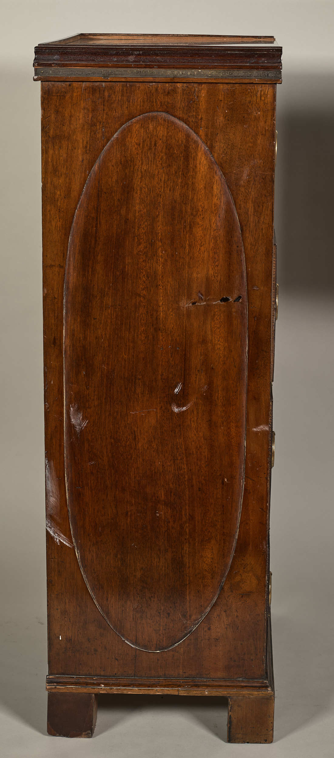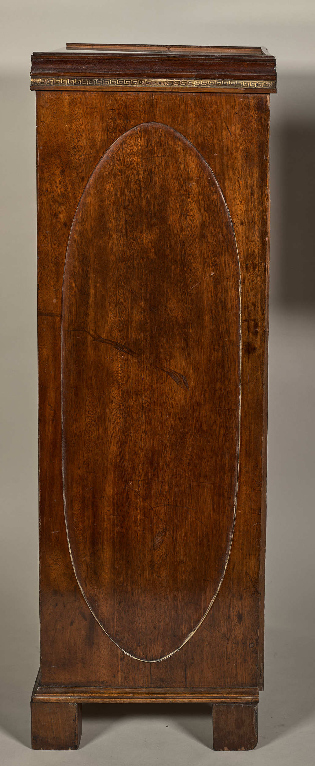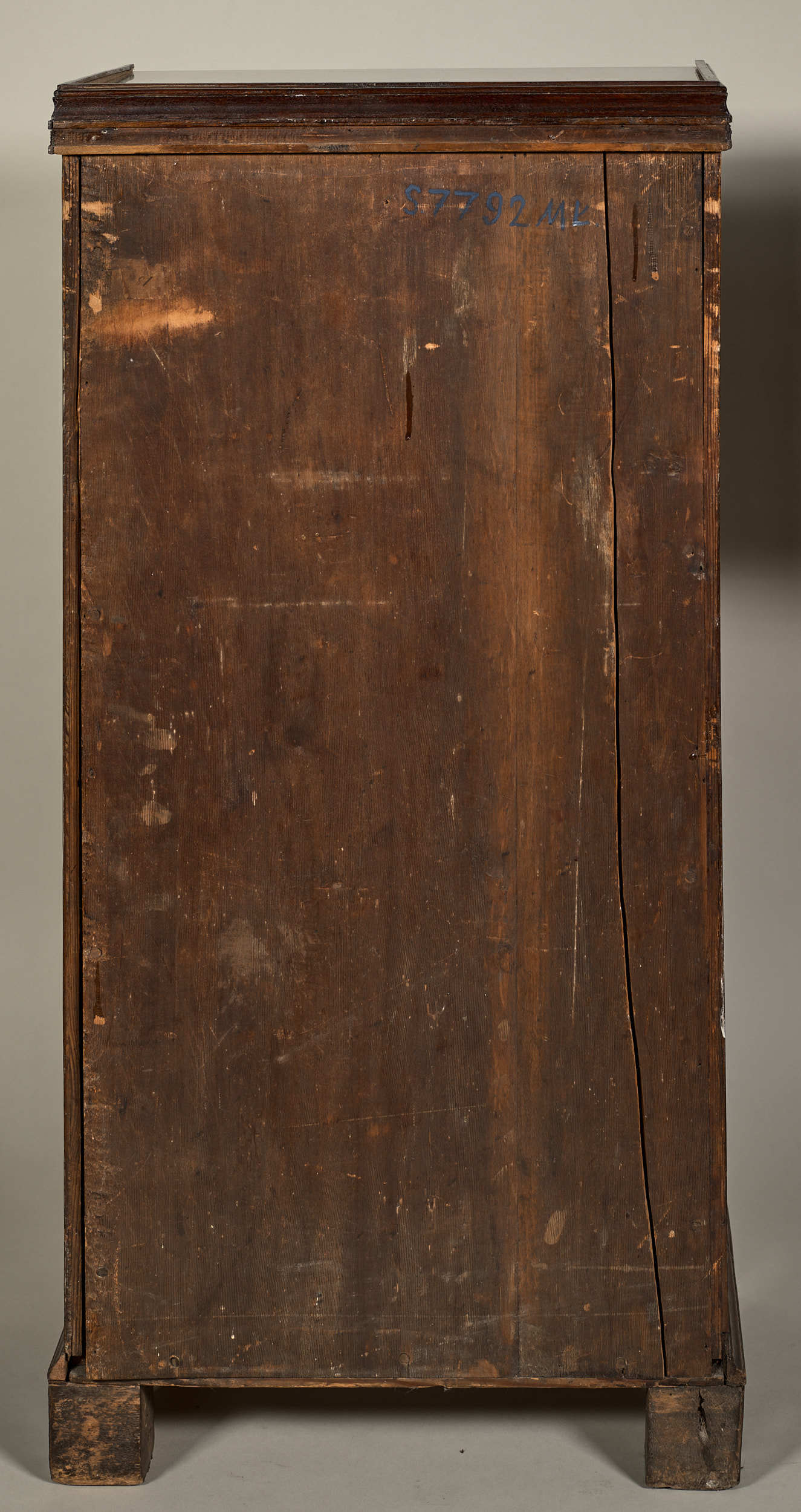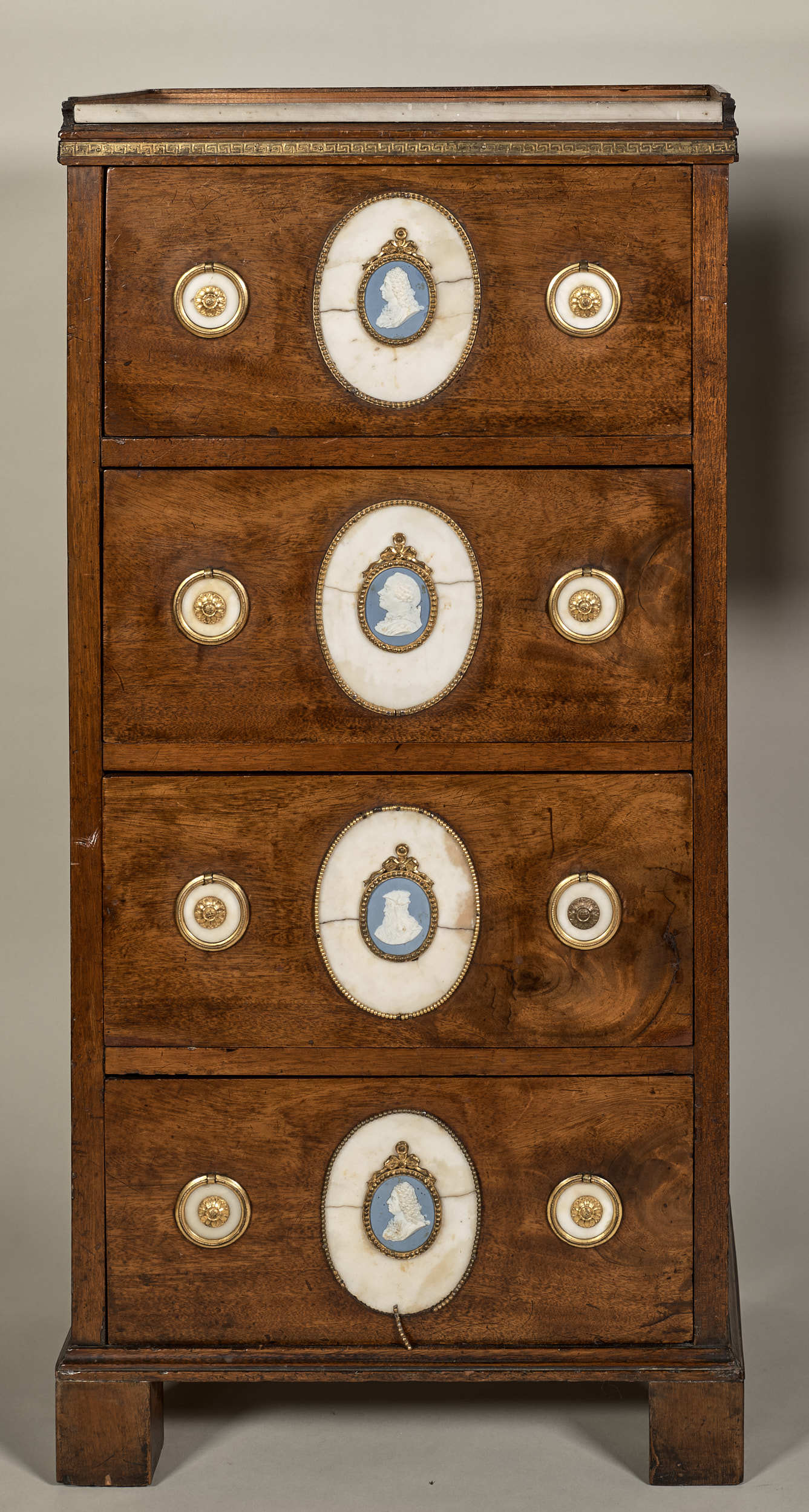 Jednym z mebli, używanych we Francji od połowy XVIII w., jest szyfoniera. To niewielka, wąska, wysoka komódka z kilkoma szufladami służąca do przechowywania bielizny, drobnych ozdób, akcesoriów stroju kobiecego i dodatków, tkanin, osobistych przedmiotów, papierów, biżuterii. Nazwa mebla pochodzi od francuskiego „chiffon” oznaczającego płótno, niewielki kawałek tkaniny, szmatkę. Prezentowana klasycystyczna szyfoniera została wykonana w parze z drugim identycznym meblem (S.7791MŁ; S.7792MŁ). Obie komódki, zakupione w 1960 r. przez Muzeum-Zamek, według relacji poprzednich właścicieli pochodziły z położonego w ogrodach wersalskich pałacyku Petit Trianon, który upodobała sobie królowa Maria Antonina. Uwagę przyciągają białe marmurowe plakiety umieszczone na czołach każdej szuflady fornirowanego mahoniem mebla. Dwie mniejsze koliste są tłem dla odlewanych z brązu uchwytów. Środkowe owalne stanowią tło dla medalionów z portretowymi popiersiami. Reliefy, naśladujące starożytne kamee, wykonano i sygnowano w angielskiej spółce Wedgwood & Bentley działającej w latach 1769 – 1780, w wytwórni Etruria na terenie Stoke-on-Trent w środkowej Anglii. Dzięki prowadzonym przez Josiaha Wedgwood’a eksperymentom w latach 70 XVIII w. rozpoczęła się produkcja barwionej tlenkami metali, nie wymagającej szkliwienia kamionki zwanej jaspisową. Były to wyroby o jasno barwionej masie stanowiącej tło dla białej reliefowej plastyki. Autorem wprawionych w szyfonierę biało - niebieskich medalionów jest John Flaxman, modelarz pracujący dla Josiaka Wedgwood’a w latach 1775 – 1787. Na medalionach ukazani są z lewego profilu: pisarz, poeta, filozof – Bernard le Bovier de Fontenelle; matematyk, filozof – Jean le Rond d'Alembert; artysta, uczony, wynalazca – Leonardo da Vinci. Czwarty medalion jest niemal bliźniaczy względem wizerunku Fontenelle, może być powtórzeniem lub podobnie ukształtowanym portretem innej niezidentyfikowanej osoby.