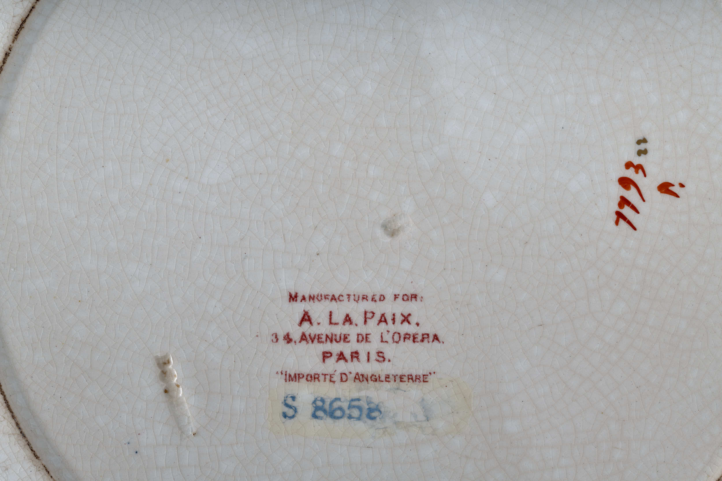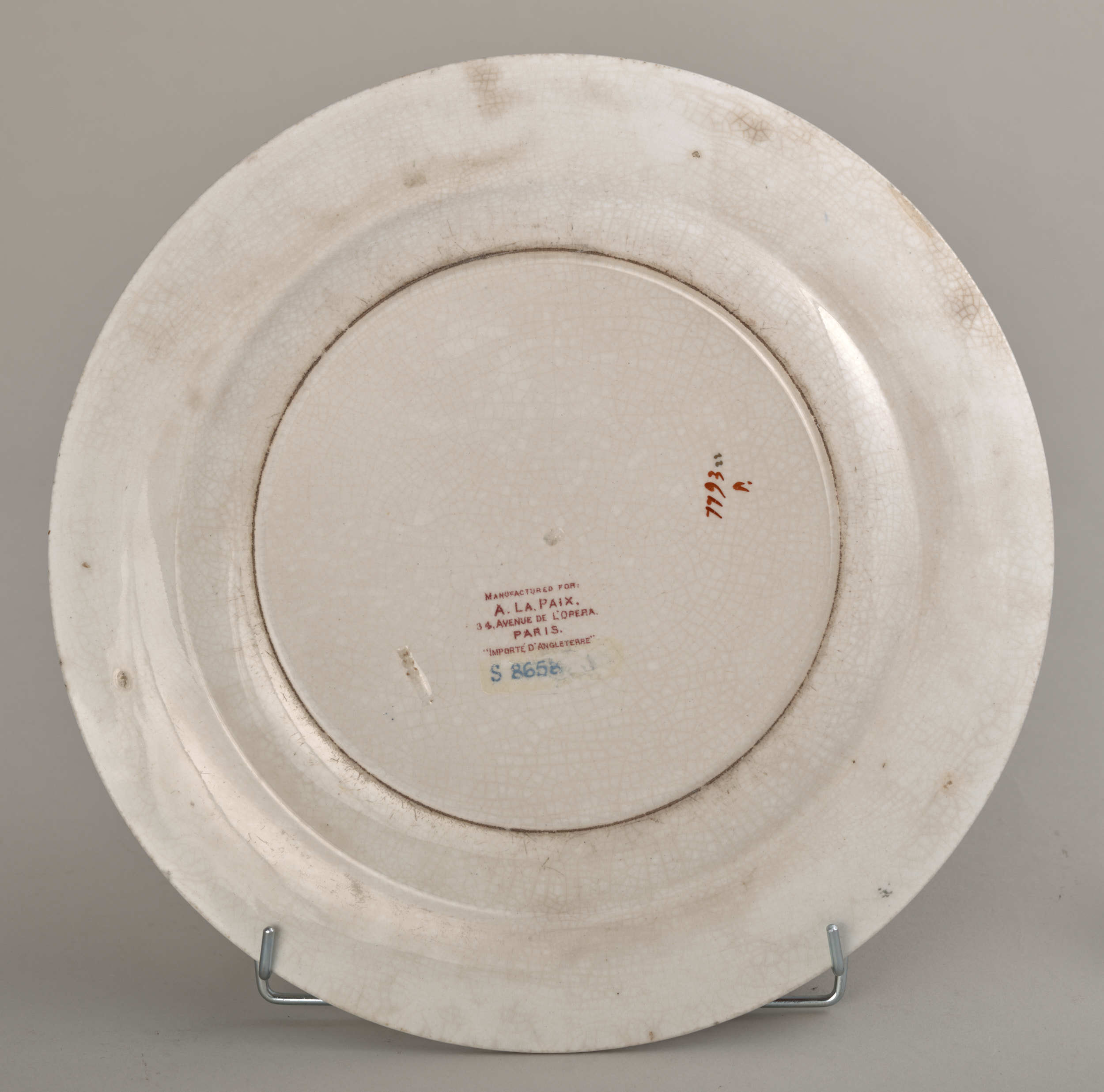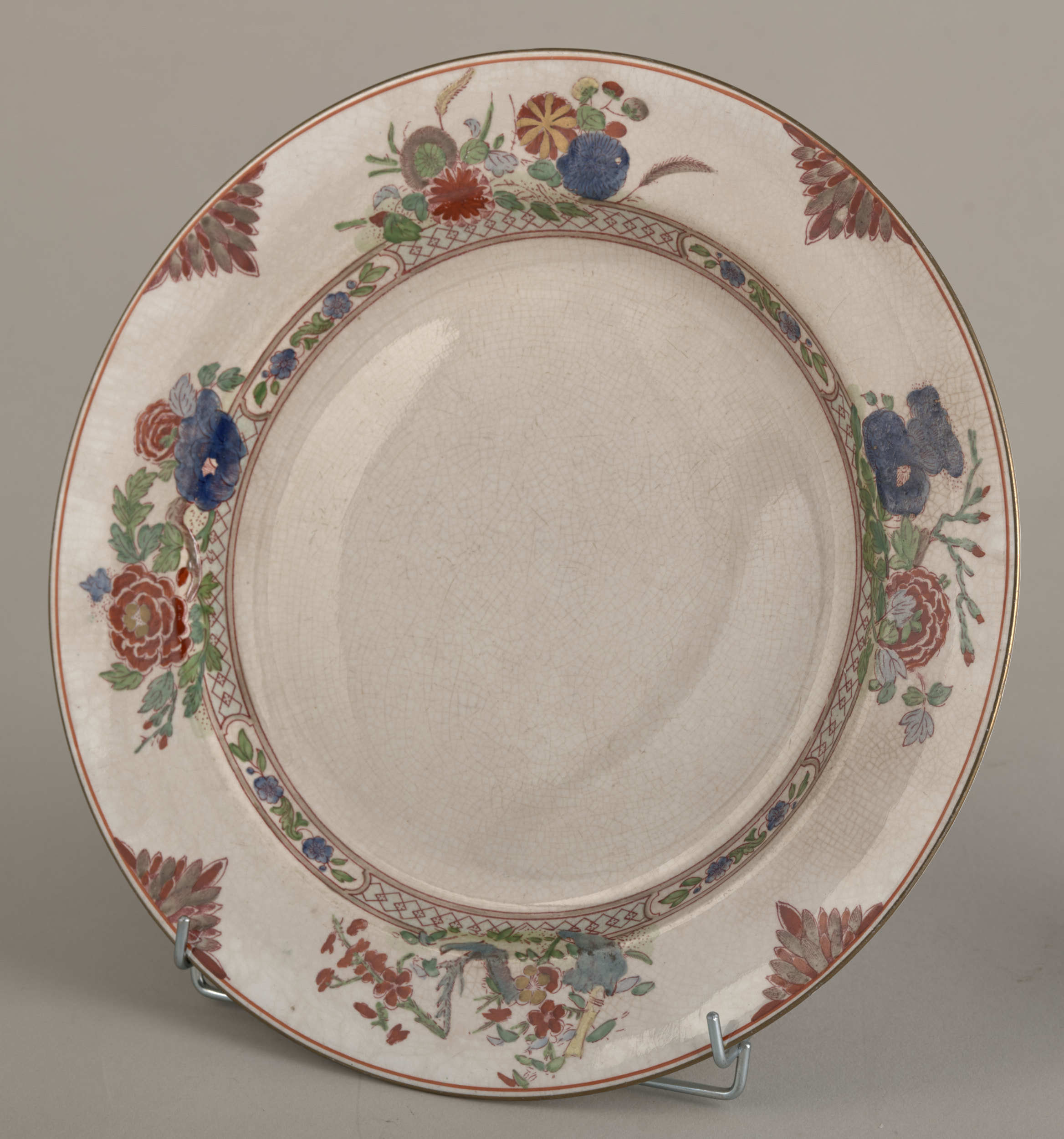 Talerz płytki z dekoracją chinizującą Talerz płytki, fajansowy o lekko kremowym odcieniu, pokryty siatką ozdobnych spękań szkliwa, zdobiony dekoracją malarską w typie dalekowschodnim o motywach roślinno – geometrycznych, a skoncentrowaną w partii kołnierza. Szczegółowy rysunek wzoru dekoracji naniesiony drukiem w kolorze purpurowym, następnie już na szkliwie- ręcznie podmalowany farbami w kilku kolorach: rdzawa czerwień, ciemnoniebieski, zielony, piaskowo-beżowy. Natomiast w mniejszości użyto farb w kolorach: jasnoniebieskim, stalowozielonym, seledynowym i żółtym. Na dekorację tę składa się pas ornamentu geometrycznego z motywem rombów, biegnący tuż pod krawędzią wrębu, następnie cztery duże kompozycje kwiatowo-roślinne, a jedno z nich z motywem połamanego krzewu, rozmieszczone na kołnierzu, blisko pasa ornamentu. Kompozycje te rozdzielone są liściastymi półrozetami. Złoto znajduje się jedynie w pasku lamującym brzeg kołnierza i drobnych elementach trzech kwiatów w dużych kompozycjach. Odwrocie talerza pokryte jest pod szkliwem szarymi plamkami. Widoczne oznakowania: w centralnym punkcie litera „B”, sygnatura fabryki „BOOTHS” – obydwa znaki stemplowane w masie i duża pieczęć drukowana podszkliwnie w kolorze bordowym: „MANUFACTURED FOR:/A.LA.PAIX,/34.AVENUE DE L’OPERA, /PARIS./IMPORTE D’ANGLETERRE”. Pod nią napis z aktualnym nr inwen. Anglia, Hanley, XIX w.