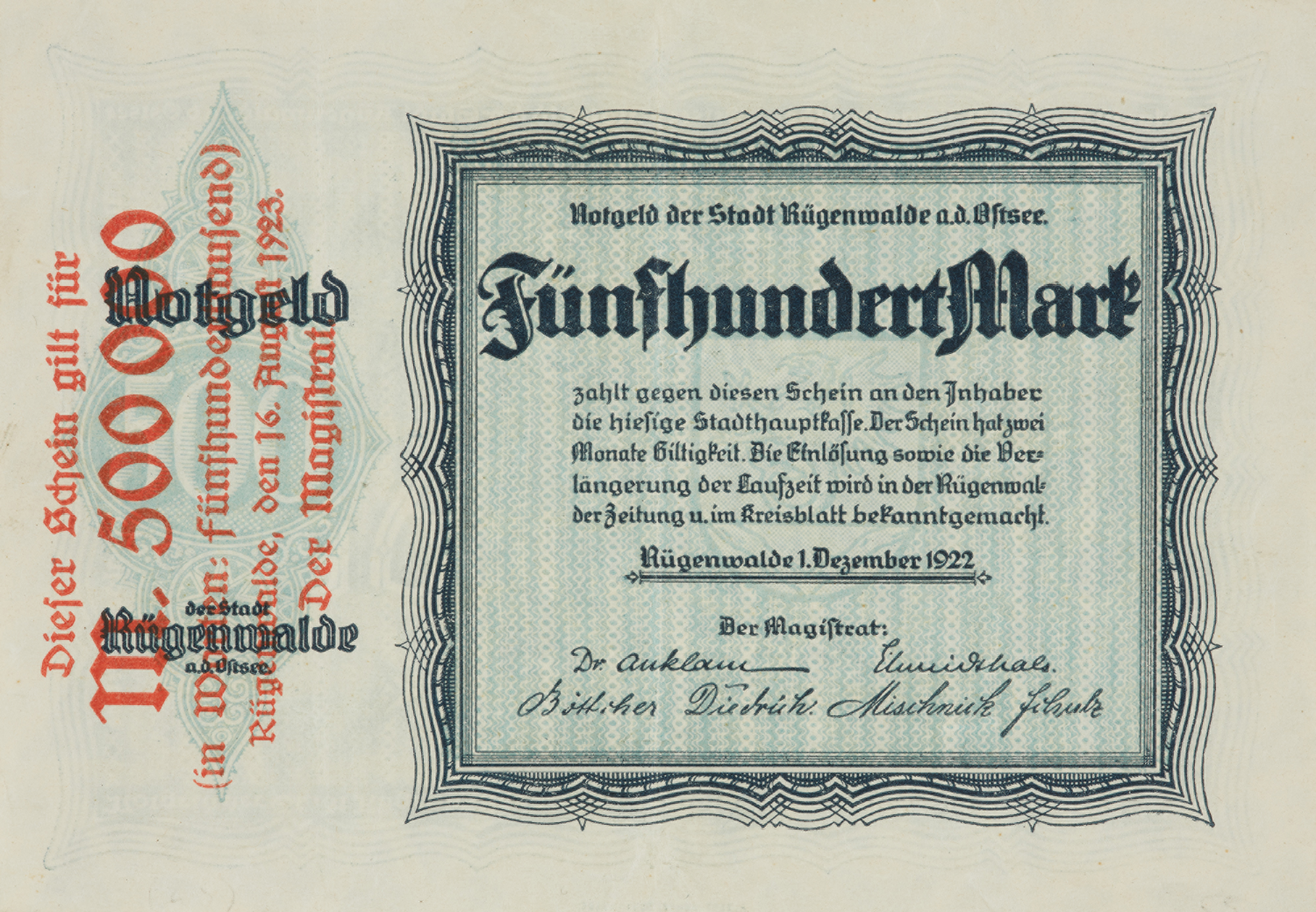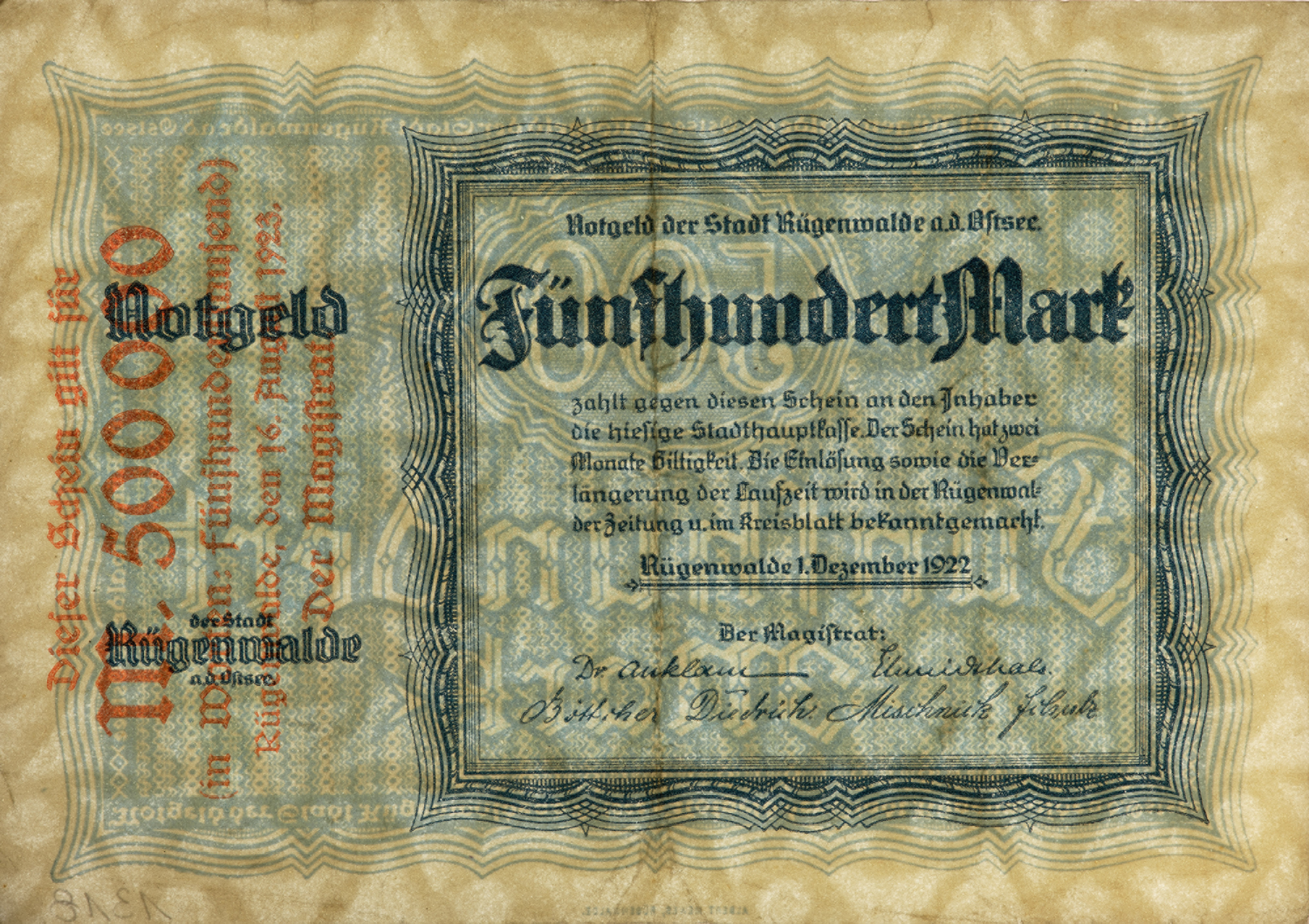 Latem 1923 roku w Niemczech, w wyniku inflacji i deprecjacji pieniądza nastąpił kolejny wyraźny spadek wartości marki. Jesienią tego roku ostra inflacja przybrała formę hiperinflacji. Na rynku pieniężnym ponownie zaznaczył się fizyczny brak gotówki. Późną jesienią 1923 roku konieczne stało się wprowadzenie do obiegu kolejnych partii pieniądza o wysokich nominałach. Państwowe drukarnie w Niemczech, mimo stosowanego powszechnie prostego i jednostronnego druku, nie były w stanie sprostać temu zadaniu. Produkcję banknotów powierzono więc drukarniom prywatnym. Podobne problemy miały również lokalne samorządy wydające pieniądze zastępcze. Sposobem na poprawienie podaży pieniądza było wykorzystanie wycofanych wcześniej bonów i przedrukowanie ich odpowiednimi nominałami. Taka sytuacja miała miejsce w Darłowie. Na emisjach z lata 1922 roku o nominale 500 marek wykonało czerwone nadruki, podnosząc wartość bonu do wysokości 500 000 marek. Pieniądz zastępczy Darłowa odstaje od stosowanej powszechnie praktyki zdecydowanego odróżniania pieniądza zastępczego od emisji oficjalnych. Przypomina banknot państwowy. Został wydrukowany obustronnie na sztywnym papierze ze znakami wodnymi pod postacią trójkątów i kół oraz w standardowym formacie banknotów Banku Rzeszy. Projekt strony głównej również upodabnia bon od oficjalnych emisji, ale odróżnia go zdecydowanie metoda druku oraz niezbyt wyszukana grafika i uboga kolorystyka. Były to warunki, którym nie zawsze mogły sprostać małe prywatne drukarnie. Pojawienie się w obiegu późną jesienią 1923 roku bonów przedrukowanych z grudniowej emisji 1922 roku było możliwe dzięki decyzji Pruskiego Ministra Handlu i Przemysłu. W piśmie z 27 stycznia 1922 roku doradzał on prezydentom rejencji oraz burmistrzom, aby pieniędzy zastępczych, wycofywanych od 5 lutego 1923, nie niszczyć, ale przechować na wypadek ewentualnych przyszłych niedoborów gotówki.