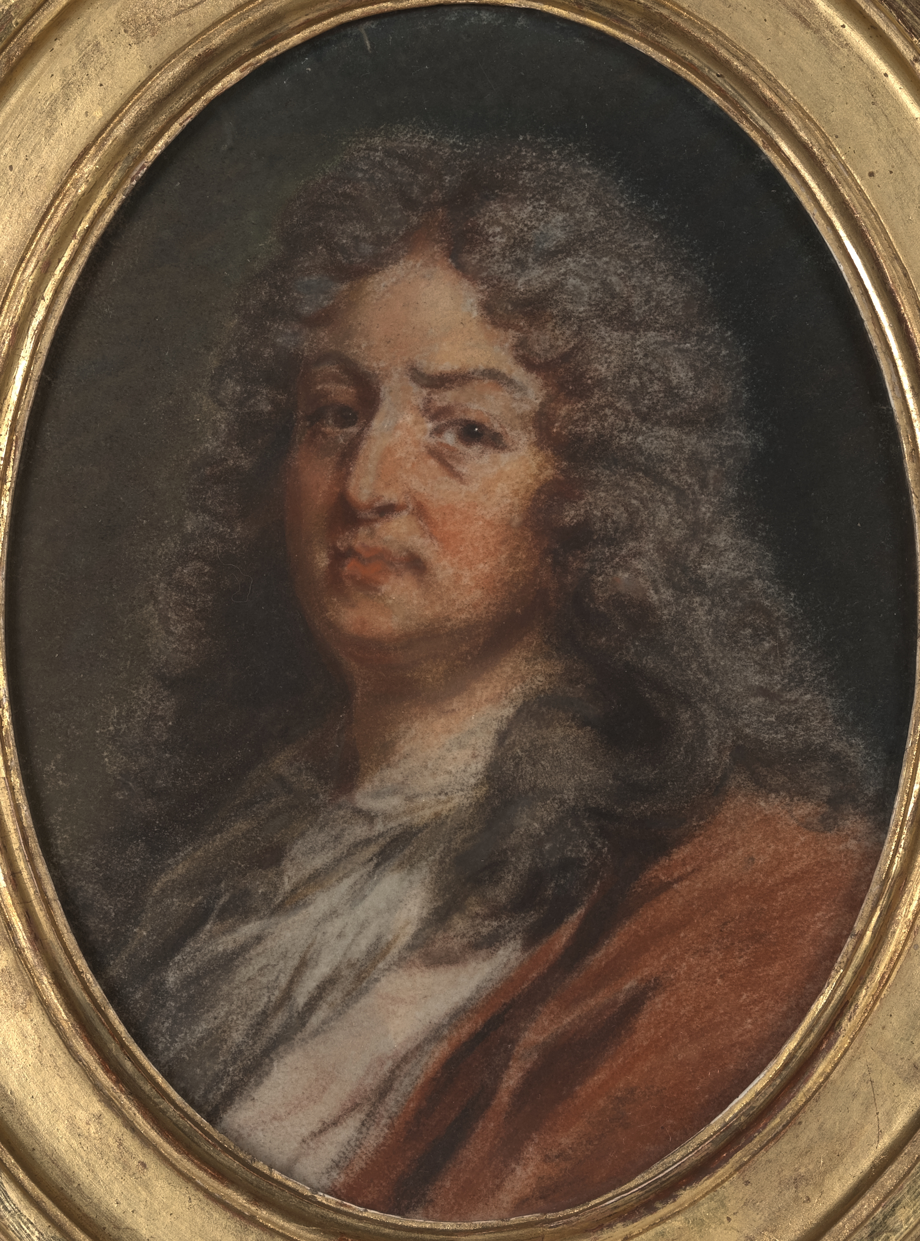 Owalny portret młodego mężczyzny ukazanego w popiersiu, na neutralnym pochodzi z dawnej kolekcji Potockich, właścicieli Łańcuta i zamku. Zachowały się trzy takie miniatury przedstawiające popiersia sławnych mężów (żyjących w XVII w).Ten portret przedstawia Jean Baptiste Racinéa, dramatopisarza, zaliczanego do trójki głównych francuskich dramatopisarzy (obok Moliera i Corneilléa), przedstawiciela klasycyzmu z elementami późnego baroku. Dramaturg ( ur. w grudniu 1639 r w La Ferte- Milon, zm. w kwietniu 1699 r w Paryżu). Najpierw sztuki swe wystawiał w trupie Moliera, potem w teatrze Hotel de Bourgogne. Na dworze, dzięki poparciu króla zrobił zawrotną karierę – został dworzaninem królewskim i historiografem. Jest autorem tragedii opartych na motywach mitologicznych i historycznych, m. in „Andromacha”, „Ifigenia”, „Berenika”, „Estera”. Jest uważany za jednego z największych tragików, w swoich sztukach wnikliwie analizował ludzkie namiętności, został uznany za mistrza w przedstawianiu kobiecej psychiki. Nie dziwi więc chęć posiadania wizerunku takiego mistrza w swoich zbiorach, a księżna marszałkowa Lubomirska, będąca właścicielką zamku w XVIII w była mecenasem sztuki i wzbogaciła zbiory zamku nie tylko w zakresie malarstwa. Związana z dworem francuskim lubiła otaczać się przedmiotami należącymi do kręgu sztuki francuskiej, a w jej zbiorach nie mogło zabraknąć wizerunków słanych ludzi. Obraz został namalowany przez nieznanego francuskiego malarza w XVIII w.