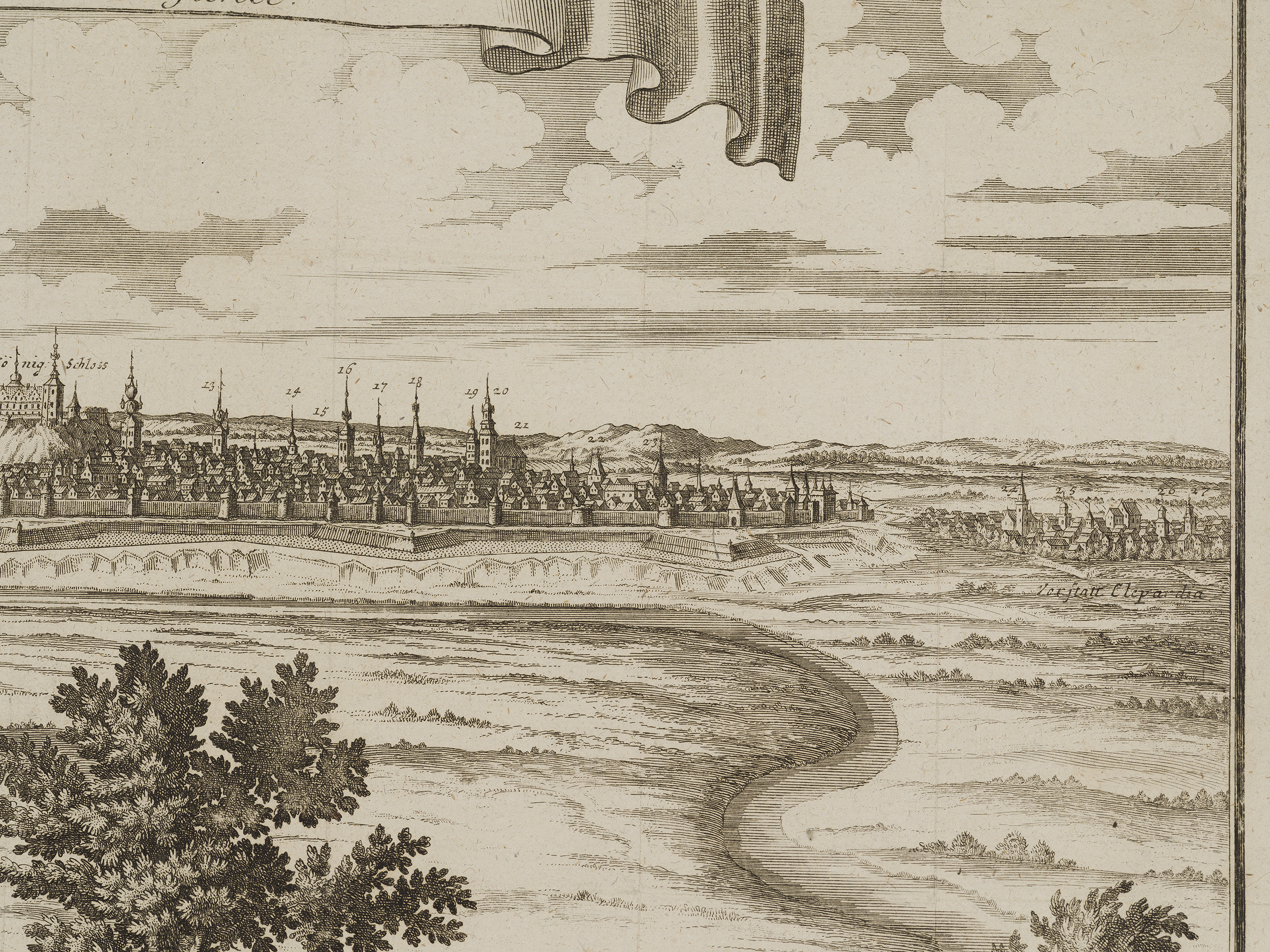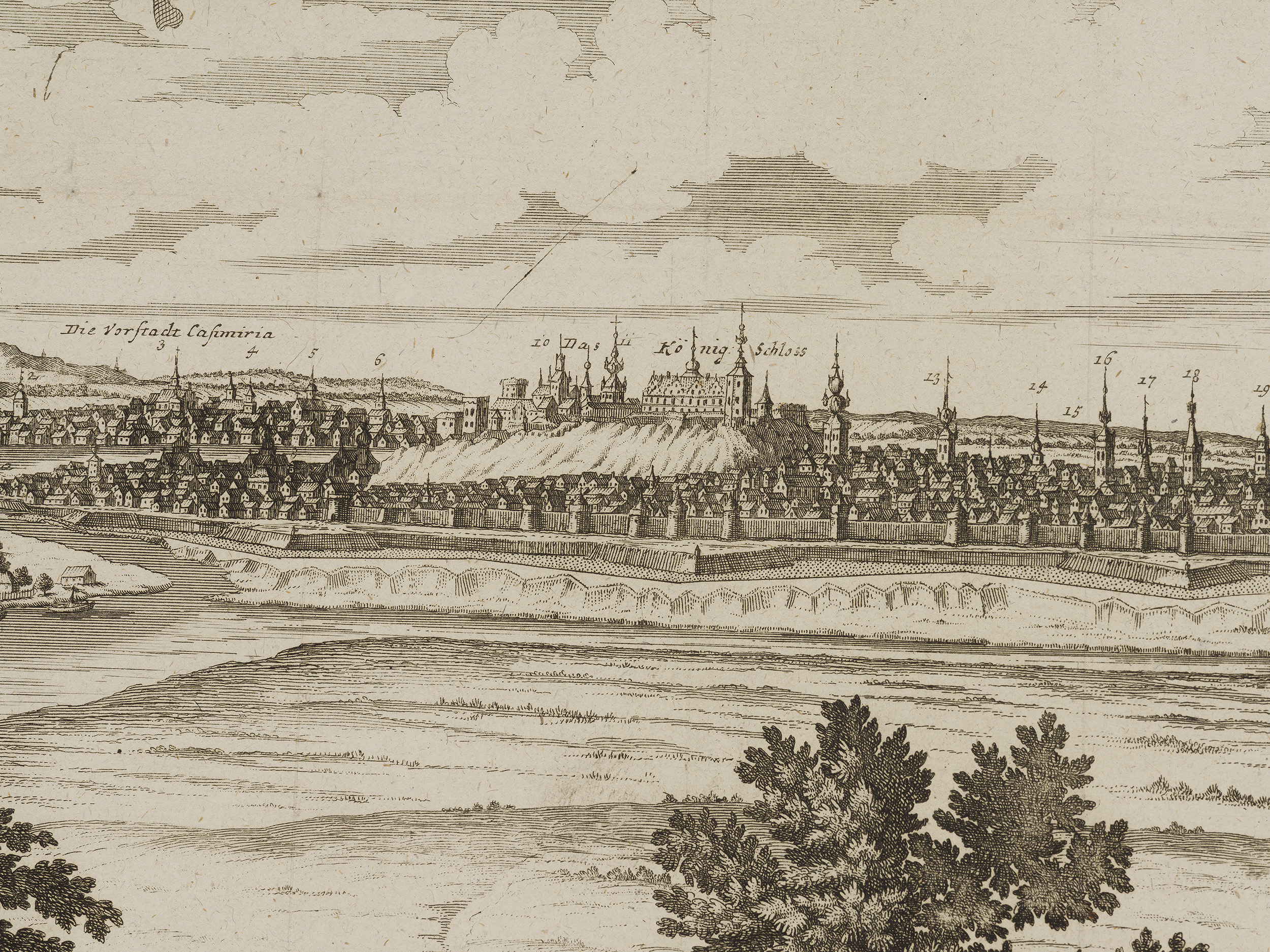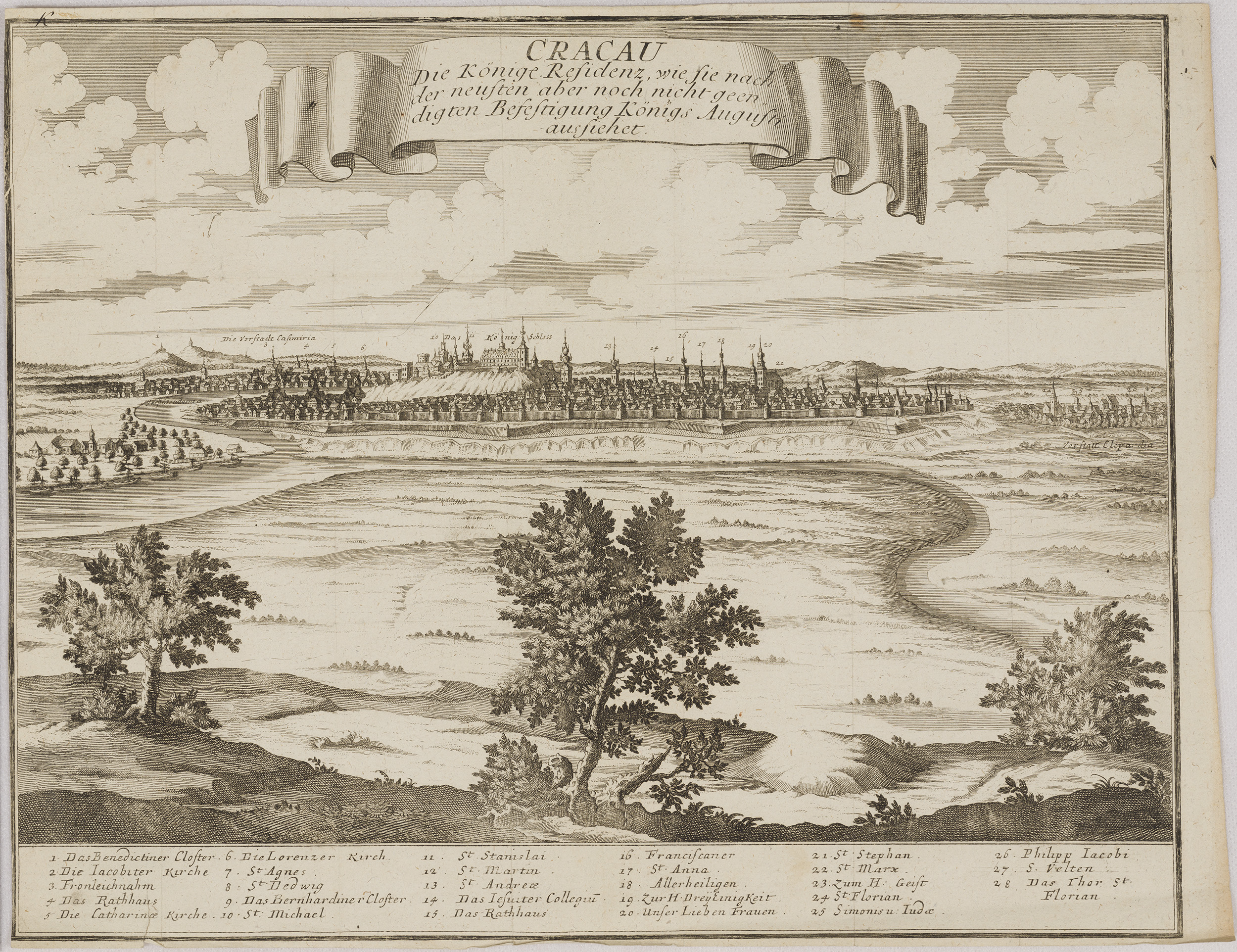 W dekoracyjnie pofalowanej, umieszczonej u góry ryciny wstędze, znalazł się wyjaśniający opis: CRACAU / Die Könige Residenz, wie Się nach / der neusten aber noch nicht geen / digten Befestigung Königs Augusti / aussiehet. Treść sugeruje nam, że jest to panorama Krakowa z czasów panowania Augusta II Wettyna, króla Polski w latach 1697-1733. W pierwszych latach XVIII wieku wybuchł konflikt zbrojny pomiędzy Szwecją, a zrzeszonymi Saksonią, Danią i Rosją. Rzeczpospolita, choć neutralna w tym konflikcie, poprzez osobę saskiego króla, została włączona do działań wojennych, które w znacznym stopniu rozgrywały się na jej terenie. Dotkliwie ucierpiała na tym ludność polski, zniszczeniu uległy niedawno wzniesione po klęskach potopu szwedzkiego miasta i wsie. Wśród miejsc dotkniętych wydarzeniami konfliktu pomiędzy wojskami szwedzkimi pod dowództwem króla Karola XII, a jego oponentami, był Kraków. Wkrótce po przegranej przez stronę sasko-polską bitwie pod znajdującym nie niedaleko Krakowa Kliszowem (2 lipca 1702 roku), August II opuścił szykujące się do oblężenia miasto. Odejście króla było właściwie jednoznaczne z kapitulacją Krakowa, który wkrótce został zajęty przez Szwedów. Podczas okupacji cierpiała ludność cywilna zmuszana do wnoszenia na rzecz Szwedów dotkliwych kontrybucji pieniężnych. Tyle o historii. Sama rycina, która zapewne powstała w trakcie opisanych wydarzeń, lub wkrótce, jest bardzo interesującym panoramicznym ukazaniem Krakowa, z dokładnym odwzorowaniem najważniejszych, widocznych w sylwetce miasta gmachów, przede wszystkim kościołów, ale także ratusza i synagogi. Zostały one oznaczonych numerami, oraz wyjaśnione u dołu kompozycji. Fragmenty miasta zaś opatrzone zostały podpisami: I tak, po lewej stronie panoramy, odnajdujemy „Die Vorstadt Casimiria” – dzisiejszą dzielnicę Kazimierz, w centralnej części „Das König Schloss” – zamek królewski na Wawelu, a po prawej „Vorstatt Clepardia” – Kleparz. Wskazuje to, że autor rysunku stanowiącego podstawę ryciny, a w konsekwencji dla prezentowanego widoku, obserwował Kraków od strony wschodniej, dawnej wsi, a obecnie dzielnicy Grzegrzóki.