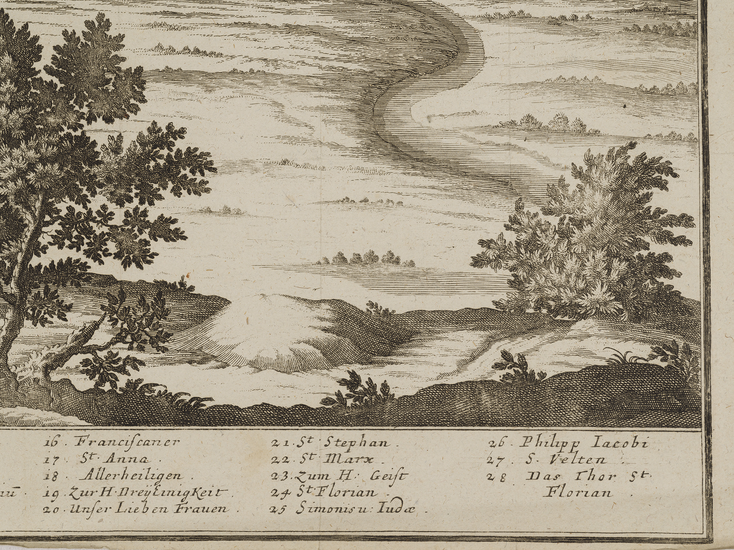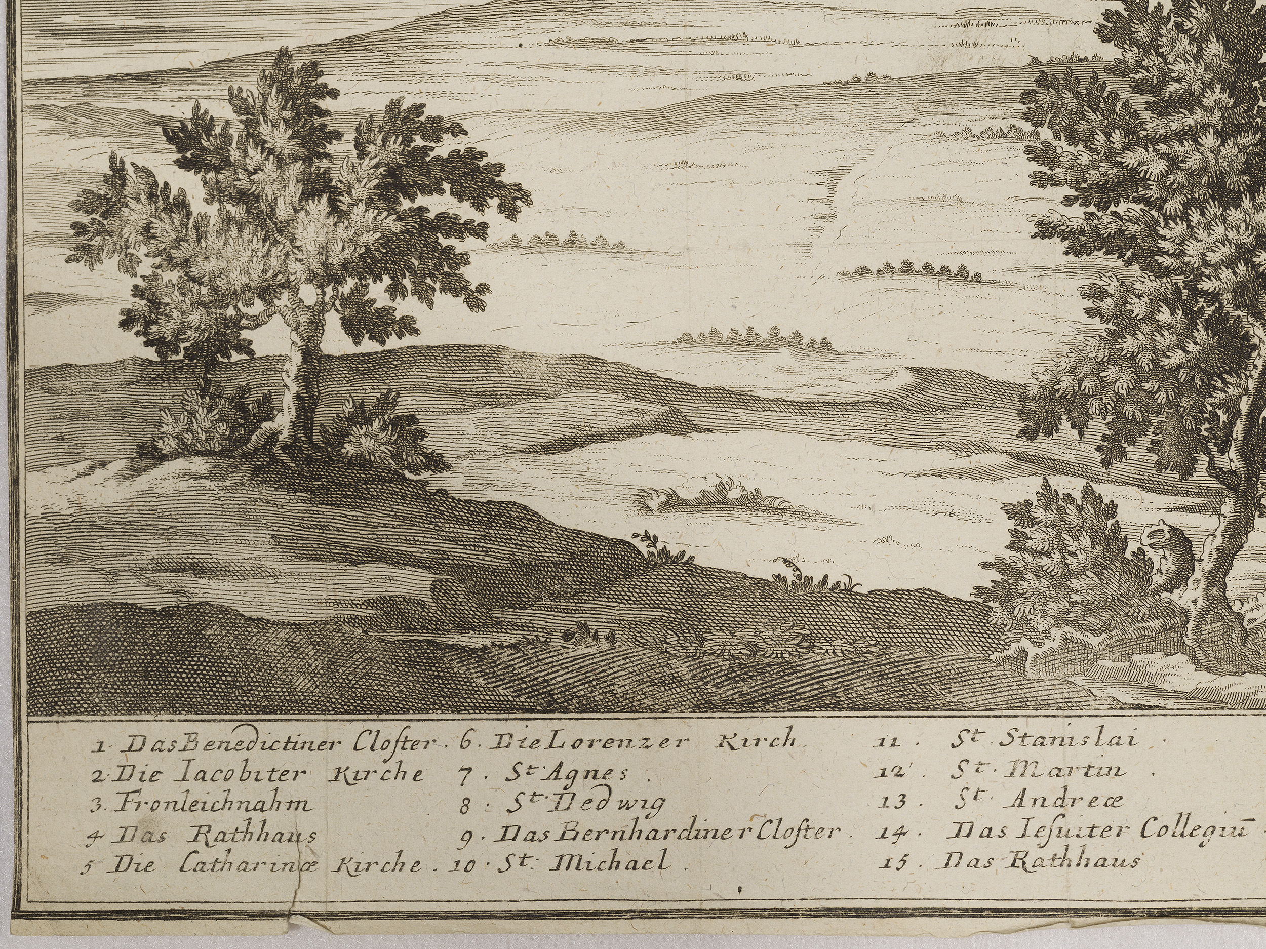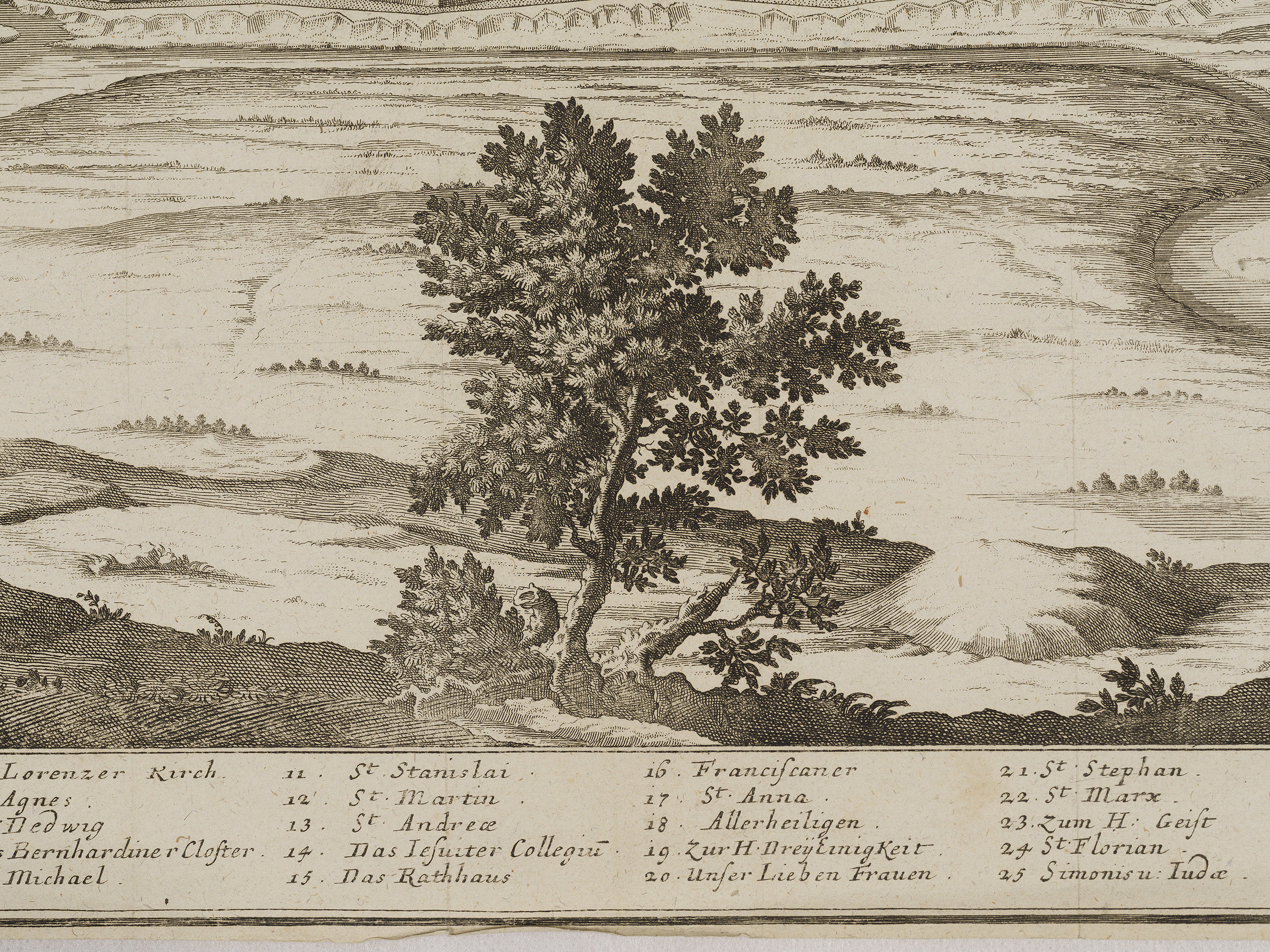 W dekoracyjnie pofalowanej, umieszczonej u góry ryciny wstędze, znalazł się wyjaśniający opis: CRACAU / Die Könige Residenz, wie Się nach / der neusten aber noch nicht geen / digten Befestigung Königs Augusti / aussiehet. Treść sugeruje nam, że jest to panorama Krakowa z czasów panowania Augusta II Wettyna, króla Polski w latach 1697-1733. W pierwszych latach XVIII wieku wybuchł konflikt zbrojny pomiędzy Szwecją, a zrzeszonymi Saksonią, Danią i Rosją. Rzeczpospolita, choć neutralna w tym konflikcie, poprzez osobę saskiego króla, została włączona do działań wojennych, które w znacznym stopniu rozgrywały się na jej terenie. Dotkliwie ucierpiała na tym ludność polski, zniszczeniu uległy niedawno wzniesione po klęskach potopu szwedzkiego miasta i wsie. Wśród miejsc dotkniętych wydarzeniami konfliktu pomiędzy wojskami szwedzkimi pod dowództwem króla Karola XII, a jego oponentami, był Kraków. Wkrótce po przegranej przez stronę sasko-polską bitwie pod znajdującym nie niedaleko Krakowa Kliszowem (2 lipca 1702 roku), August II opuścił szykujące się do oblężenia miasto. Odejście króla było właściwie jednoznaczne z kapitulacją Krakowa, który wkrótce został zajęty przez Szwedów. Podczas okupacji cierpiała ludność cywilna zmuszana do wnoszenia na rzecz Szwedów dotkliwych kontrybucji pieniężnych. Tyle o historii. Sama rycina, która zapewne powstała w trakcie opisanych wydarzeń, lub wkrótce, jest bardzo interesującym panoramicznym ukazaniem Krakowa, z dokładnym odwzorowaniem najważniejszych, widocznych w sylwetce miasta gmachów, przede wszystkim kościołów, ale także ratusza i synagogi. Zostały one oznaczonych numerami, oraz wyjaśnione u dołu kompozycji. Fragmenty miasta zaś opatrzone zostały podpisami: I tak, po lewej stronie panoramy, odnajdujemy „Die Vorstadt Casimiria” – dzisiejszą dzielnicę Kazimierz, w centralnej części „Das König Schloss” – zamek królewski na Wawelu, a po prawej „Vorstatt Clepardia” – Kleparz. Wskazuje to, że autor rysunku stanowiącego podstawę ryciny, a w konsekwencji dla prezentowanego widoku, obserwował Kraków od strony wschodniej, dawnej wsi, a obecnie dzielnicy Grzegrzóki.