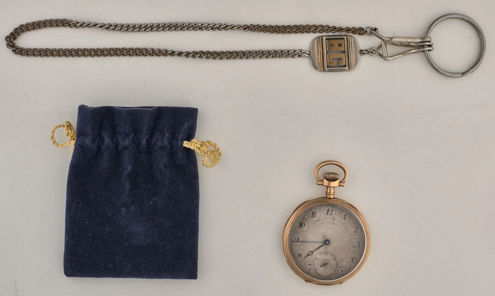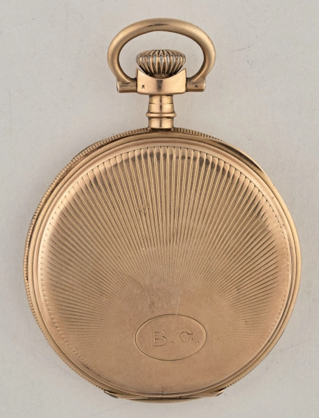 Szwajcarski zegarek kieszonkowy z dewizką wraz z etui. Na srebrzonej tarczy znajdują się cyfry rzymskie umieszczone w grawerowanych otokach. Posiada dwie czarne wskazówki. Mechanizm został oprawiony w złotą, przeszkloną kopertę. Główka naciągowa sprężyny wraz z uchwytem do dewizki umieszona na obrzeżu zegarka. Na odwrotnej stronie koperty, w owalu wygrawerowane zostały inicjały B.C. Powyżej wykonany został promienisty ornament. Koperta połączona jest z metalową dewizką łańcuszkową, na której powtórzone są inicjały B.C. Dodatkowo zachowało się granatowe etui z weluru, które u góry ściągane jest sznureczkiem. Zegarek należał do polskiego malarza Bolesława Jana Czedekowskiego (1885-1969), który przez większą część życia mieszkał poza krajem (Francja, Austria, Stany Zjednoczone). Posiadał renomę głównie jako portrecista. Malował również kwiaty i pejzaże. W okresie międzywojennym malował portrety ówczesnych elit arystokracji, duchowieństwa, polityków, przemysłowców. Portretował także hrabiów Potockich z Łańcuta.Największą w Polsce kolekcję dzieł Bolesława Jana Czedekowskiego obecnie posiada Muzeum-Zamek w Łańcucie, jest to pokłosie daru wdowy po malarzu Herthy Czedekowski, przekazanego w 2001 roku.