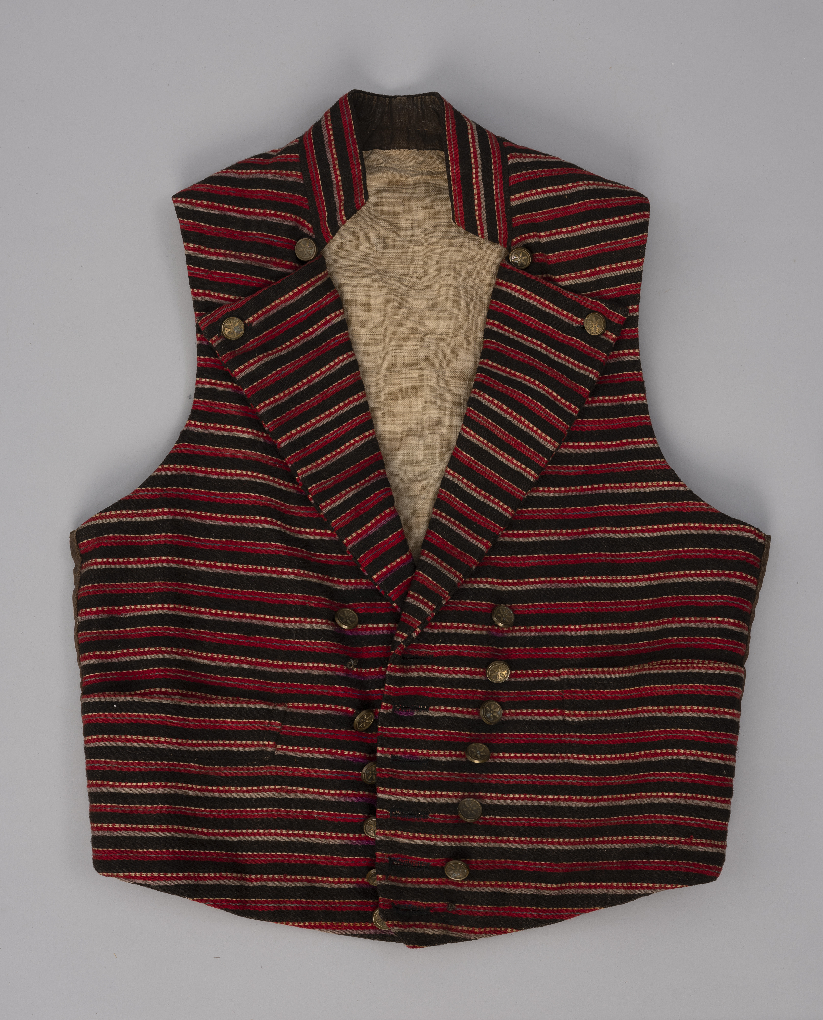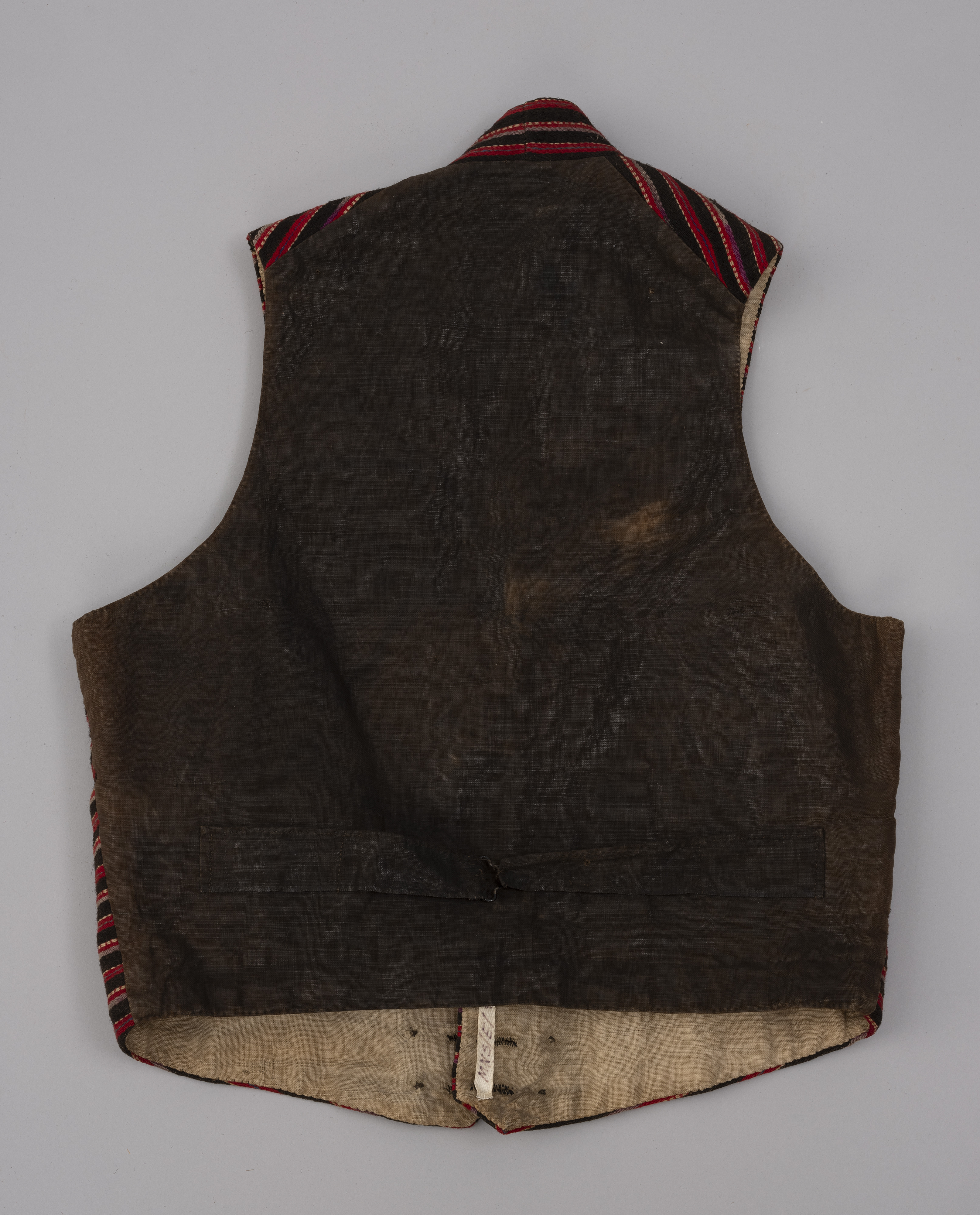 Prezentowana kamizelka z rugijskiego stroju ludowego typowego dla Mönchgut wykonana została z materiału tkanego prawdopodobnie jeszcze na ręcznych krosnach w kolorowy, pasiasty wzór. Przód wykrojony w ciekawy fason o wysokiej stójce, sporych klapach i wpuszczonych kieszeniach przyozdobiono mosiężnymi guzikami w kolorze złotym. Tył uszyty z ciemnego płótna wyposażony został w pasek umożliwiający dopasowanie szerokości.