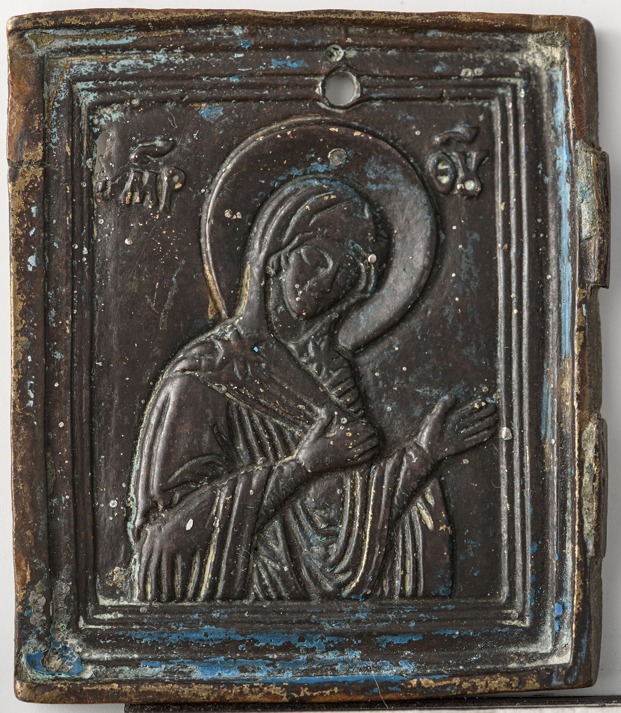 Prezentowany wizerunek Bogurodzicy stanowi lewe skrzydło składanej na zawiasach ikony z przedstawieniem Deesis oznaczającego po grecku błaganie, prośbę (patrz S.12787MŁ; S.12802MŁ). Pojęcie to od wczesnych wieków chrześcijaństwa ukształtowało się w oparciu o teksty liturgiczne, wśród nich eucharystyczna modlitwa dziękczynna i modlitwy błagalne, w których Kościół ucieka się do orędownictwa Bogurodzicy, Jana Chrzciciela, aniołów, apostołów, męczenników, świętych. Obrazowa forma Deesis, znana od VI-VII w., rozwinęła się w kilku wariantach, gdy po okresie obrazoburstwa zaprzestano zwalczać kult ikon w Bizancjum, skąd przedstawienie rozpowszechniło się na obszarze wschodniego chrześcijaństwa. W podstawowym wariancie ikonograficznym, oprócz centralnie umieszczonej postaci Chrystusa, występują: po prawicy Bogurodzica, jak na prezentowanej ikonie, po lewicy Jan Chrzciciel – najwięksi orędownicy ludzkości (patrz S.12824MŁ). Układ postaci zawsze jest hierarchiczny. Na terenach Carstwa Rosyjskiego, utożsamiającego się ze spuścizną Rusi, od połowy XVII w. wzmagał się ruch przeciwników reform liturgicznych zapoczątkowanych przez patriarchę Nikona. Prześladowani zwolennicy dawnej tradycji, nazywani staroobrzędowcami lub starowiercami, rozwinęli własne ośrodki wytwarzające przedmioty kultu, między innymi odlewane w metalu ikony składane czyli składnie. Wśród różnorodnej tematyki obrazowej składni znajdowały się przedstawienia Deesis. Prezentowana ikona jest przykładem wizerunku, w którym półpostacie Chrystusa z adorującymi Bogurodzicą i Janem Chrzcicielem umieszczono pojedynczo na każdym ze skrzydeł tryptyku (środkowe i prawe nie zachowane). Ikony takie, używane często w podróży, mocowano rzemieniami do górnych bolców środkowego skrzydła i noszono bezpośrednio na ciele.