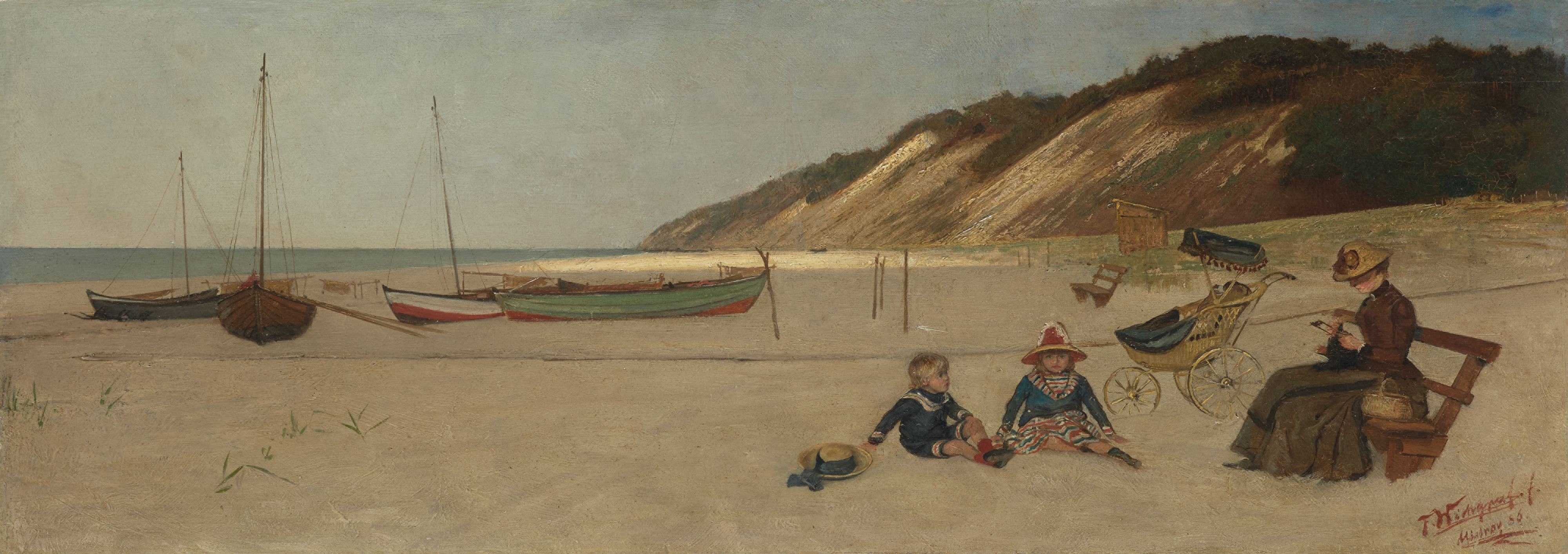 Obraz namalowany na niewielkiej desce przedstawia widok nadmorskiej plaży w Międzyzdrojach w 1886 roku. Kompozycja zamknięta w formie wydłużonego leżącego prostokąta to pospolita scena rodzajowa. Na pustej, stosunkowo wąskiej plaży osłoniętej od strony lądu wysokim, porośniętym wysokimi drzewami klifem, nieopodal brzegu morza, siedzi na ławce kobieta w brązowej sukni i słomkowym kapeluszu na głowie. Zdaje się być pochłonięta szydełkowaniem, choć z pewnością czuwa również nad dwójką dzieci bawiących się w piasku – chłopcem i dziewczynką w marynarskich strojach. Z tyłu stoi trójkołowy wózek dziecięcy, nieco dalej znajdują się cztery wyciągnięte na brzeg łodzie ze zwiniętymi żaglami. Kadr kompozycji wypełniają jeszcze widoczne w oddali druga, pusta ławka oraz drewniany kosz plażowy w pobliżu wydm.