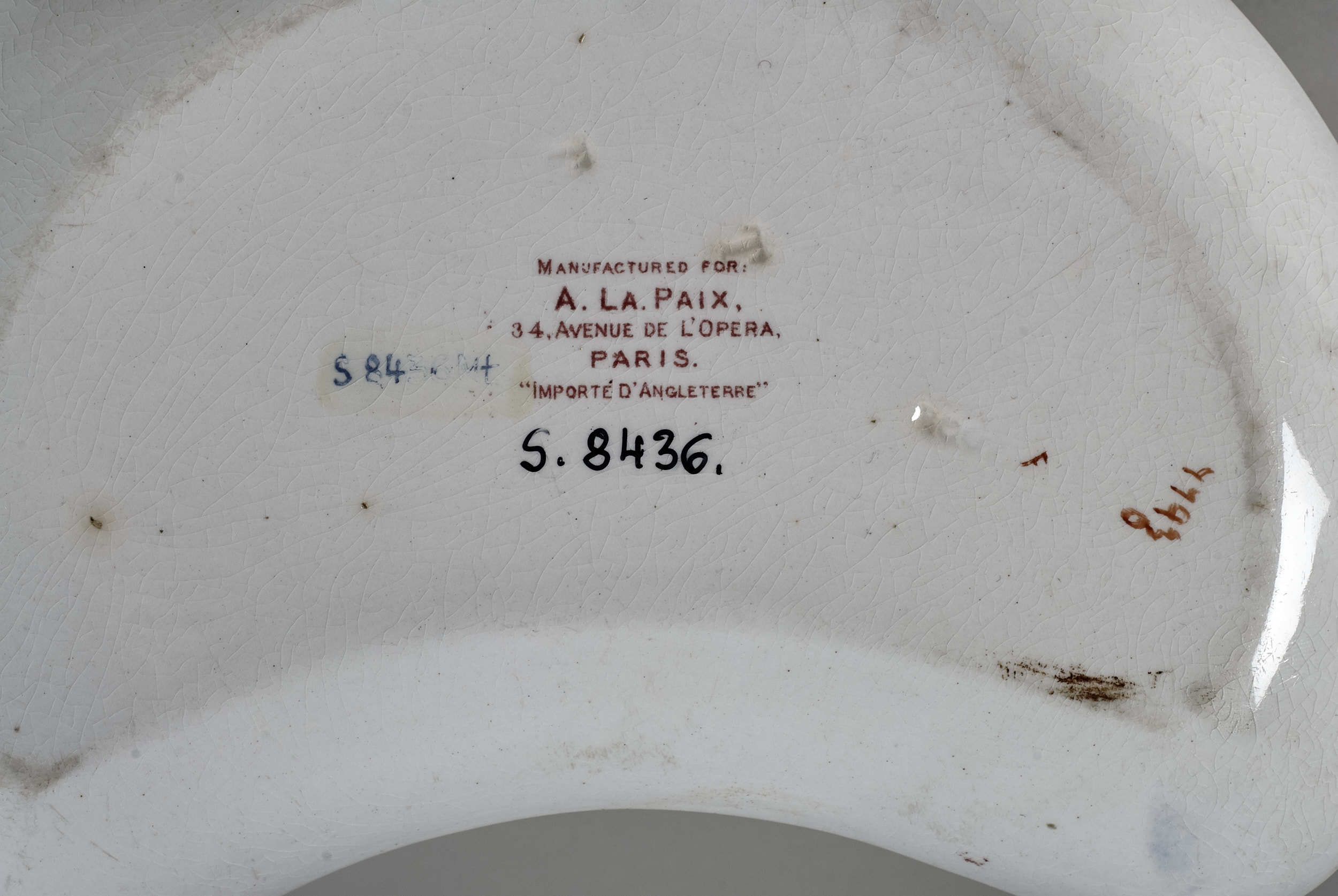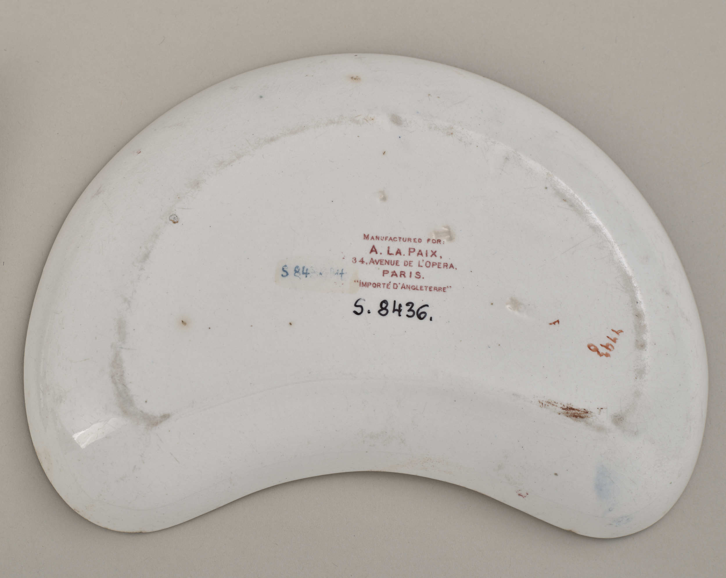 „Talerzyk przystawkowy z dekoracją chinizującą” Talerzyk z fajansu w  kształcie nerki o lekko kremowym zabarwieniu i drobnej siatce ozdobnych spękań szkliwa – „krakle”. Zdobiony w stylu chińskim motywami floralnymi i geometrycznymi. Widoczne są kwiaty piwonii oraz ukwiecone gałęzie naśladujące kwitnącą wiśnię. Szeroki pas nie połączonych ze sobą zdobień pokrywa brzeg naczynia otaczając znajdujące się w centrum niewielkie lustro talerzyka. Rysunek wzoru naniesiony jest techniką druku podszkliwnego, na szkliwie znajduje się zdobienie w kolorze rdzawej czerwieni, jasno – i ciemnoniebieskie, zielone w kilku odcieniach oraz żółte i złocenia. Jedyny ciągły ornament to wąski pas złożony z nachodzących na siebie rombów, w sześciu miejscach przerwany krótkimi odcinkami rezerw (niebieski kwiat z liśćmi). Na płaskim odwrociu talerzyka widoczna jest sygnatura producenta „BOOTHS” oraz zdwojona litera „T”, stemplowane w masie. Znajdują się tu też pieczątki drukowane podszkliwnie s kolorze bordowym: „MANUFACTURED FOR:/A LA PAIX,/34.AVENUE DE L’OPERA,/PARIS/ IMPORTE D’ANGLETERRE”. Dalej widoczny jest ręczny zapis cyfrowy farbą naszkliwną w kolorze cynobru:”7793”/”0” oraz litera „F”. Obok odręczny napis olejną farbą „nr inw.S.8436MŁ”. Fajans kształtowany w formie, dekoracja drukowana i podmalowana farbami naszkliwnymi, złocenie. Firma: Thomas, Booths Sonne, Anglia, Hanley, Booths, 2 poł XIX w.