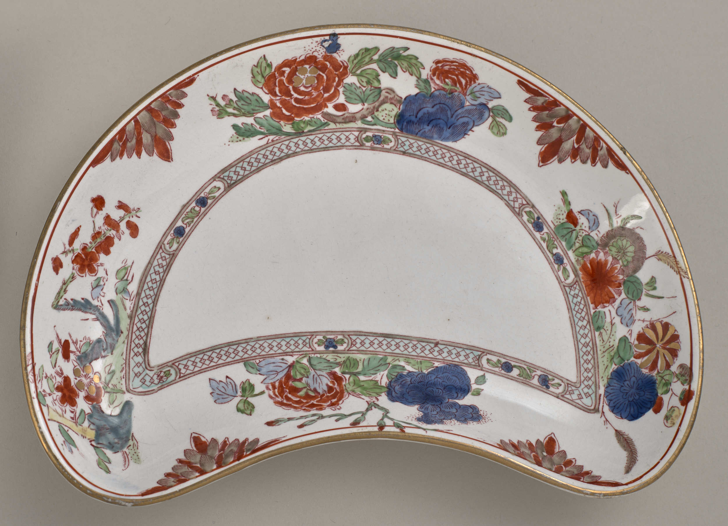 Talerzyk przystawkowy w krztałcie półksiężyca, zdobiony motywem roślinnym, kwiatowym i geometrycznym w kolorze czerwonym