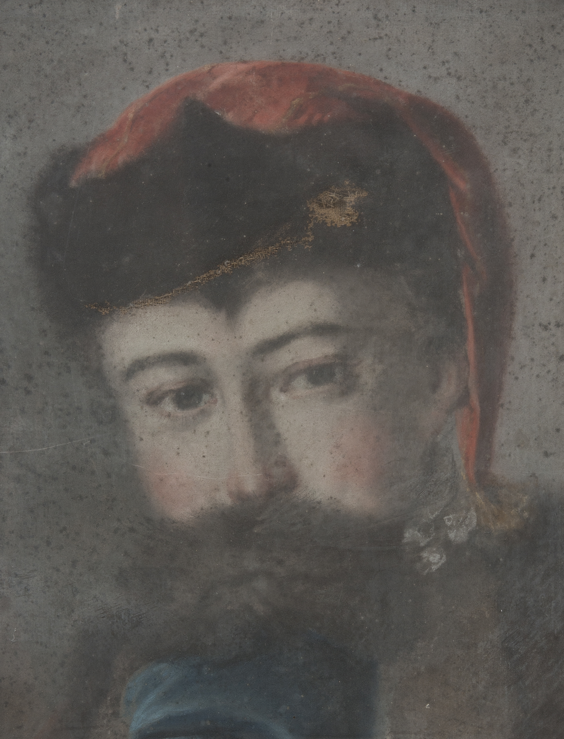 Twarz przedstawionej kobiety tajemniczo skrywa mufka z błękitnego aksamitu. Widzimy tylko jej fragment, oddany z dużą starannością: różowane policzki, długi prosty nos i ciemną oprawę ciemnych oczu. Szlachetne rysy pozwalają sądzić, że mamy przed sobą wysoko urodzoną osobę. Potwierdza to obramowana ciemnym futrem czapka à la kozacka, której szkarłatne denko zakończone chwostem zwisa aż do ramienia. Obraz ten jest rodzajem żartu graficznego. Pomysł mógł wyjść ze strony modelki, bo któż czyniąc portret decydowałby się na zasłonięcie uwiecznianej twarzy, szczególnie gdy jej resztę przedstawił w sposób tak przekonujący? Może to aktorka, a może chłód jest rozwiązaniem zagadki.