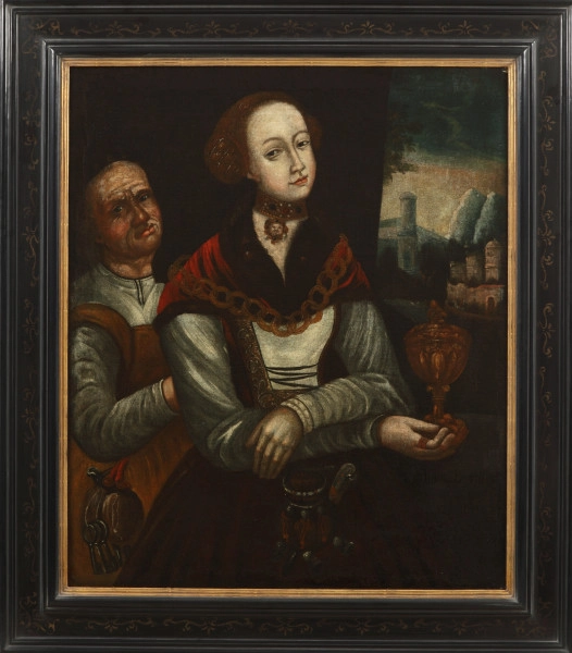 W nieokreślonym wnętrzu z oknem, z którego widać górzysty krajobraz z elementami architektury, stoi młoda kobieta, ubrana w renesansową suknię ze sznurowanym gorsetem i trzyma w ręku kielich. Zza jej pleców, po lewej stronie wychyla się staruszka z przypiętym do pasa pękiem kluczy. Scena autorstwa nieznanego malarza według inskrypcji na obrazie przedstawiać miała tę samą postać, Sydonię von Borck (1548–1620), jako młodą i starą kobietę.
