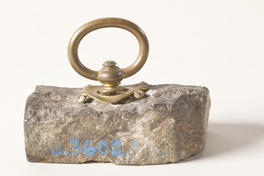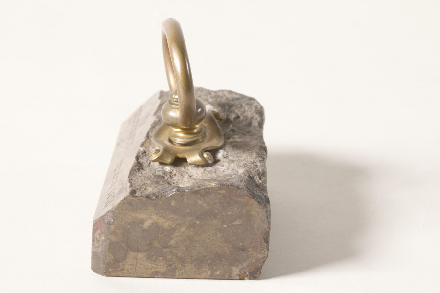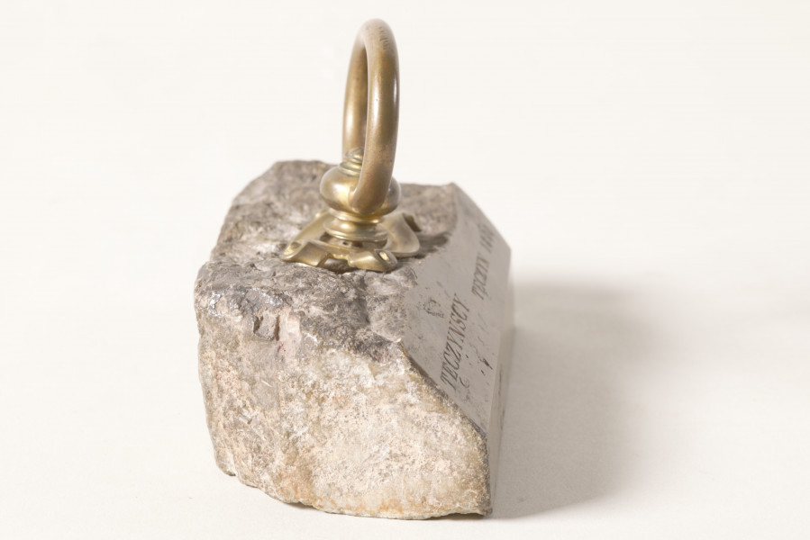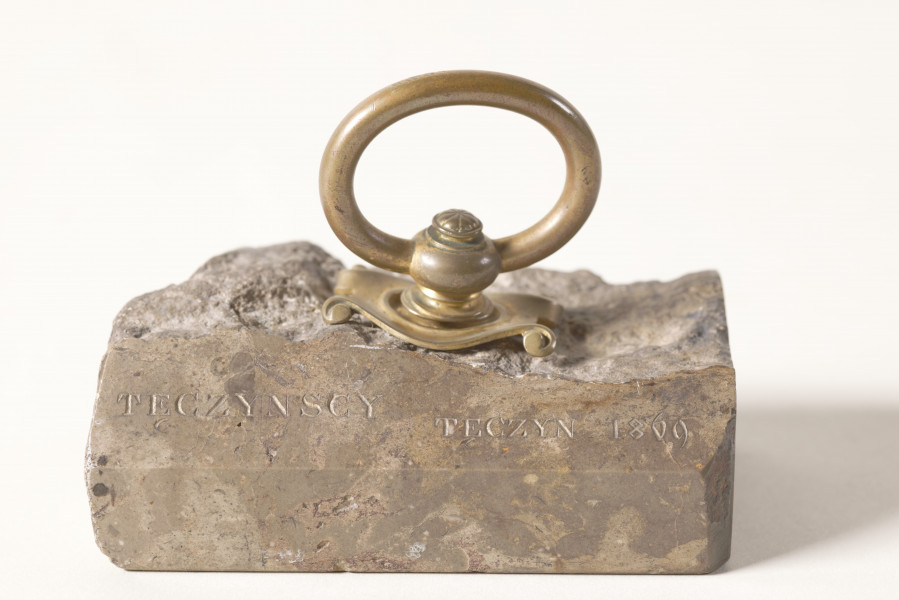 Z kamienia został wykonany przycisk, który prezentujemy w naszym Muzeum. Pochodzi z kolekcji rodziny Potockich przejętej w 1944 roku. Ma formę nieregularnej, częściowo oszlifowanej bryły wapienia. Dla ułatwienia użytkowania został dodany mosiężny uchwyt. Na powierzchni kamienia widnieją wygrawerowane dwa napisy: Tęczyńscy, Tęczyn i data 1869 – zatem nasz przycisk jest pamiątką związaną z Tęczyńskimi i Tenczynem. Tylko co wspólnego z Tęczyńskimi, Tenczynem i rokiem 1869 mają Potoccy?