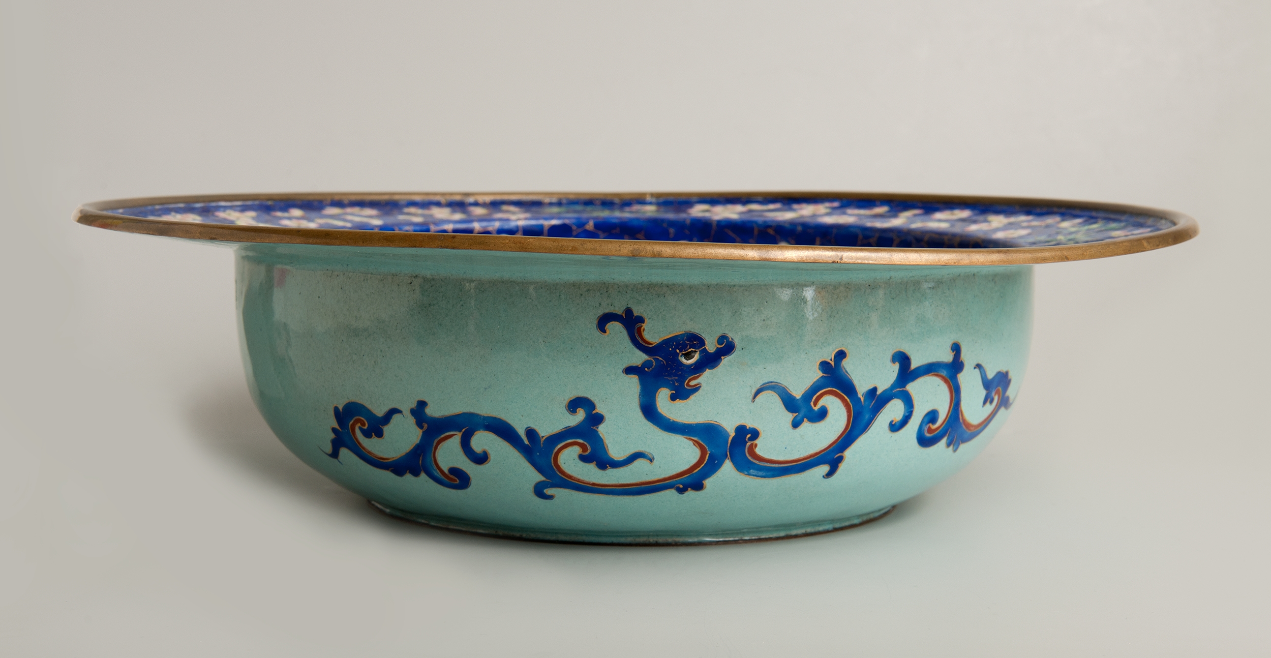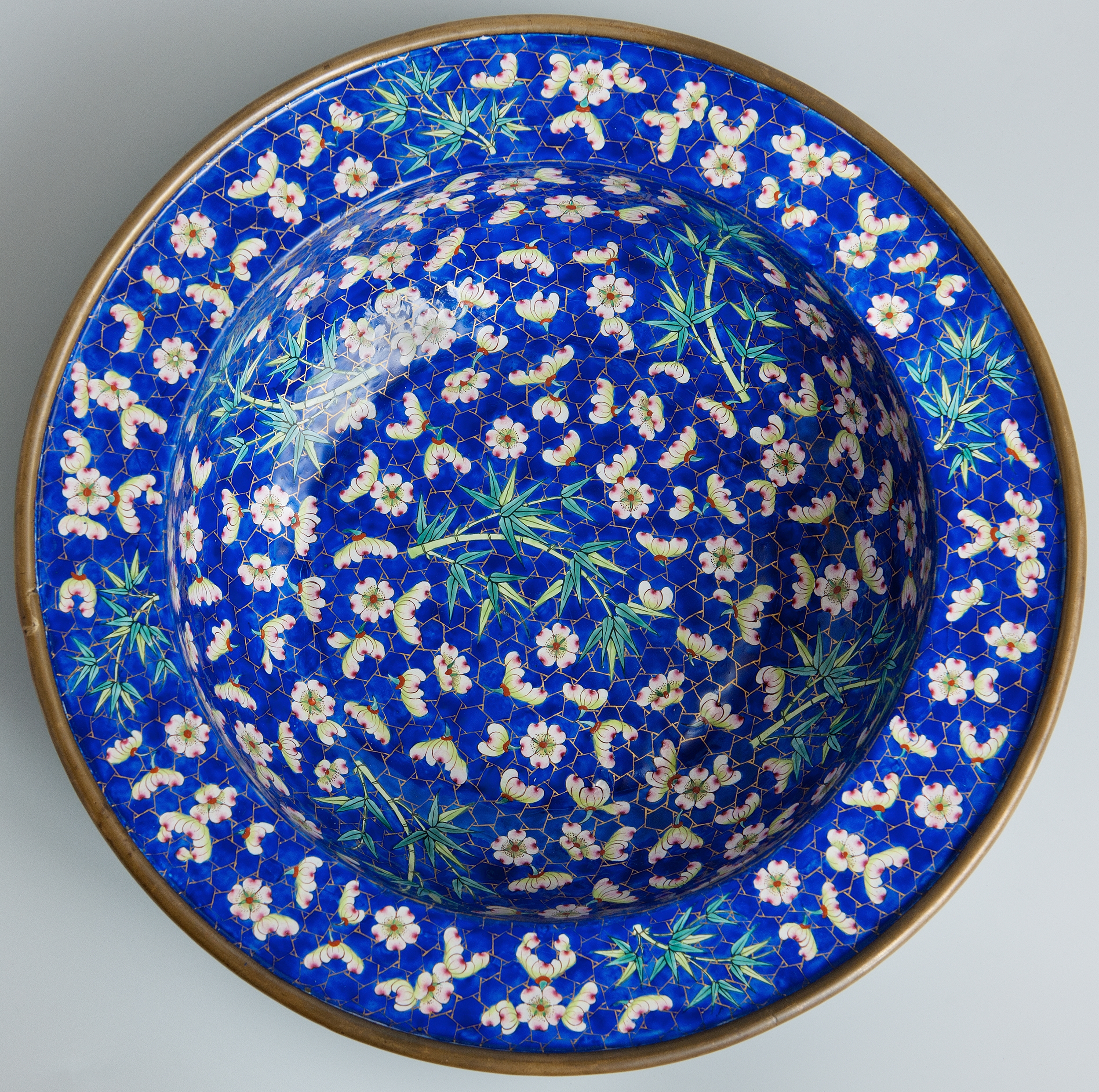 Miednica wykonana w technice emalii na miedzi. Okrągła, głęboka, z kołnierzem ujętym miedzianą obręczą. Całą wewnętrzną powierzchnię miednicy pokrywa emalia w głębokim kobaltowym kolorze. Zdobią ją gęsto rozmieszczone białoróżowe kwiaty śliwy i gdzieniegdzie zielone gałązki bambusa na tle złotego wzoru przypominającego spękany lód. Odwrocie naczynia pokryto emalią o barwie turkusowej. Po dwóch stronach kielicha misy umieszczono stylizowany, uproszczony motyw chińskiego smoka.