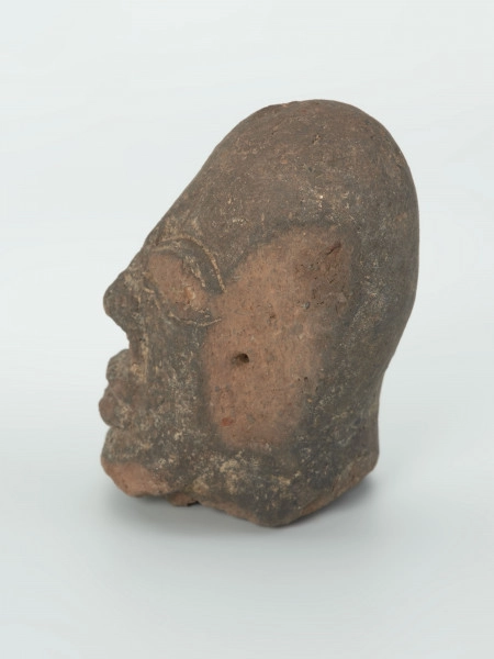 Afrykańska tradycja wypalania glinianych rzeźb sięga pierwszego tysiąclecia BC czego przykładem są znaleziska z obszaru kultury Nok ze Środkowej Nigerii, czy datowane na późniejszy okres terakoty odkryte w regionie Djenne-Jeno we współczesnym Mali. W tradycyjnych społecznościach afrykańskich rzeźbiarzem jest zazwyczaj kowal, często należący do endogamicznej kasty zawodowej, pracujący w kamieniu i drewnie. Figurki z wypalonej gliny są dziełem kobiet, najczęściej jednej z żon kowala, która specjalizuje się w garncarstwie. Prezentowany obiekt przedstawia głowę ludzką z kwadratową twarzą i mocno zaznaczoną żuchwą, wykonaną z gliny grafitowego koloru. Brakuje na niej jednego ucha, po którym pozostał jedynie malutki, okrągły otwór. Omawiana rzeźba została wypalona najprawdopodobniej w atmosferze redukcyjnej, o czym świadczy jej barwa. Przeznaczenie figurki nie jest jasne. Wydaje się, że pierwotnie miała związek z religią i obrzędowością. Prawdopodobnie była stawiana na domowym ołtarzu poświęconym przodkom.