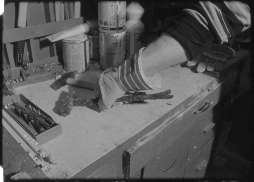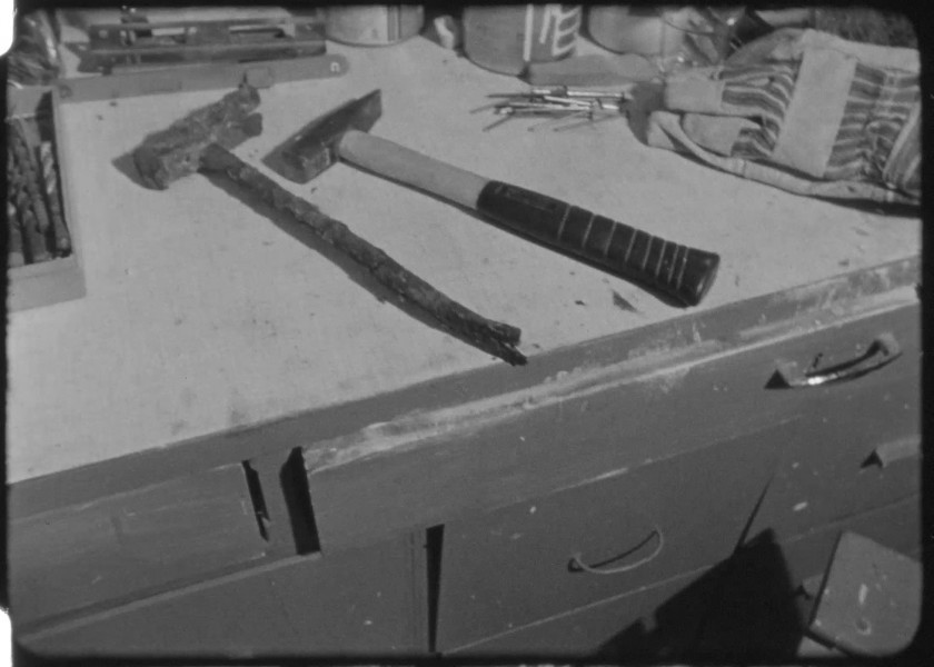 Jeden z 5 czarno-białych filmów z dźwiękiem zrealizowanych w konwencji dawnego kina, wchodzących w skład pracy „Szukaliśmy w popiołach”. Praca ta powstała z wykorzystaniem obiektów archeologicznych znajdujących się w depozycie Muzeum POLIN. Najważniejszym elementem filmu jest pokryty rdzą i uszkodzony młotek. Pierwszy kadr pokazuje młotek leżący na blacie długiej, drewnianej komody z wieloma szufladami pośród różnych współczesnych elementów służących do naprawy i majsterkowania. W kolejnych scenach widać rękę w rękawicy ochronnej, która bierze młotek oraz gwóźdź i markuje ruchy wbijania gwoździa w siedzisko taboretu. Dźwięki filmu imitują czynność miarowego wbijania, co podkreśla realność sceny.