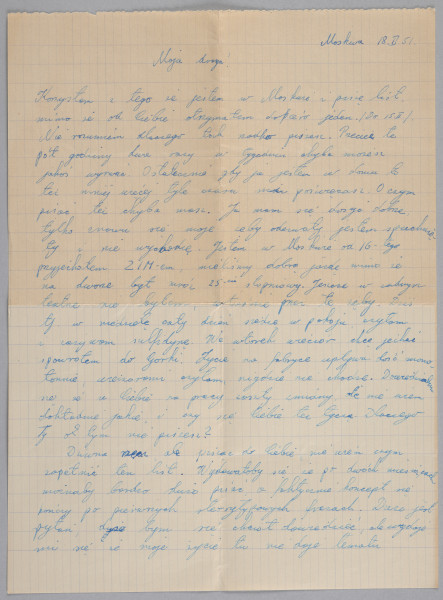 „Nie rozumiem dlaczego tak rzadko piszesz. Przecież te pół godziny dwa razy w tygodniu chyba możesz jakoś wyrwać. Ostatecznie gdy ja jestem w domu to też mniej więcej tyle czasu mi poświęcasz. O czym pisać też chyba masz. Ja mam się dosyć dobrze, tylko znowu się moje zęby odezwały, jestem spuchnięty i nie wychodzę. Jestem w Moskwie od 16-tego przyjechałem ZIM-em [najpewniej chodzi o markę radzieckiego samochodu osobowego, produkowanego w mieście Gorki – dop. red.], mieliśmy dobrą jazdę mimo że na dworze był mróz 25-ciostopniowy. Jeszcze w żadnym teatrze nie byłem, wtórnie przez te zęby. Dziś tj. w niedzielę cały dzień siedzę w pokoju, czytam i zażywam sulfidynę. We wtorek wieczór chcę jechać [z] powrotem do Gorki. Życie na fabryce upływa dość monotonnie, wieczorem czytam, nigdzie nie chodzę. [...] Chciałbym już być z powrotem w domu i zobaczyć Was”.