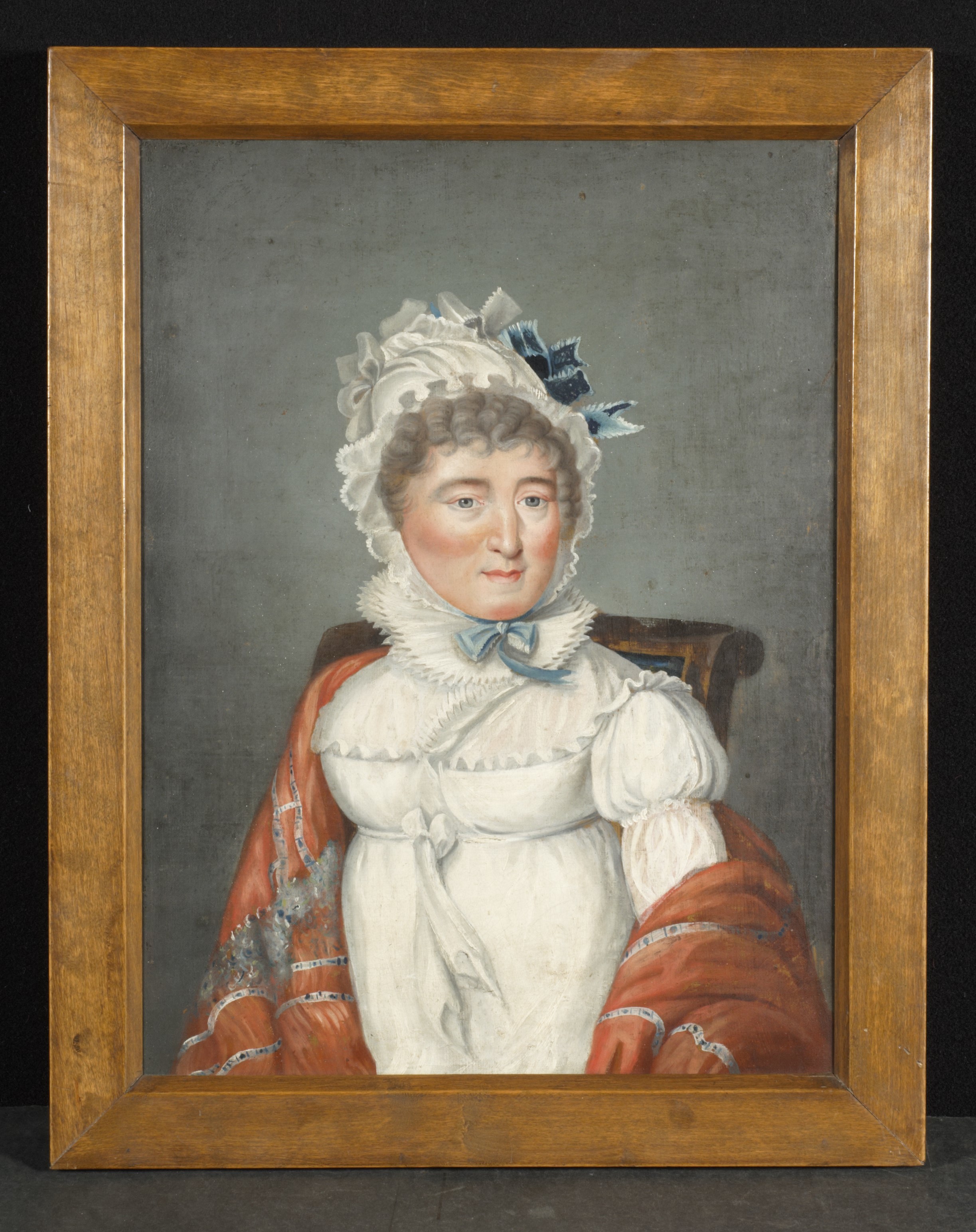Obraz olejny na płótnie przedstawiający portret księżnej w starszym wieku. Portretowana z charakterystycznym poważnym spojrzeniem, ukazana w ujęciu do pasa i lekkim zwrocie ciała w prawo (en trois quarts). Twarz mocno podkreślona pudrem o różowym odcieniu. Księżna siedzi na krześle, ubrana w empirową biało - szarą suknię z wysoka talią, ramiona okrywa czerwony szal zdobiony wzorami z pasów. Podobne charakterystyczne kaszmirowe szale stanowiły modny i cenny dodatek stroju w tamtym okresie. Głowa ozdobiona dobranym kolorystycznie czepkiem z ciemnoniebieską wstążką i kokardkami.