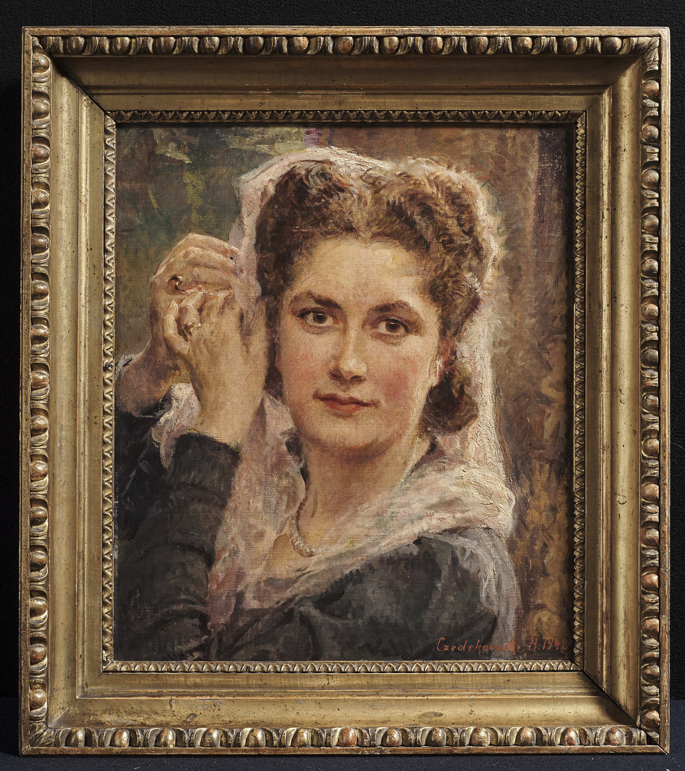 Obraz „Przed lustrem” został namalowany w 1942 roku w okresie, kiedy Czedekowscy mieszkają w Wiedniu, a malarza obejmuje wydany przez gestapo zakaz wykonywania zawodu. Pomimo coraz większych trudności ze zdobyciem farb i płótna artysta maluje. Są to portrety o mniejszych rozmiarach, do których czasem pozuje córka artysty Helena. Tu została przedstawiona tylko do ramion. Patrzy na wprost, przegląda się w naszych oczach, bo widz jest lustrzaną taflą, w której śledzi swoje odbicie. Spokojna twarz o zaróżowionych policzkach, prostym nosie i ładnie zarysowanych naturalnie koralowych ustach. Brązowe, szerokie brwi są oprawą do piwnych oczu, które z uwagą spoglądają na nas. Ciemne włosy odsłaniają czoło i zaczesane puchatymi falami są spięte z tyłu głowy. Różowobiałą mgiełką leży na nich woalka, którą Helena próbuje upiąć. Woalka kładzie się także na ramionach i podtrzymywana jest przez dłonie z prawej strony głowy. Palce lewej uniesionej dłoni przytrzymują tkaninę, by prawa mogła wbić szpilkę do włosów. Na szyi krótki sznur pereł, które są najchętniej malowanymi klejnotami przez Czedekowskiego. Palce zdobią delikatne złote pierścionki. Jasnoróżowa woalka stanowi kolorystyczne urozmaicenie ciemnej, grafitowej bluzki, czy też sukni. Skromność stroju, jego koloryt bardzo dobrze współgrają w poważnym wyrazem twarzy młodej kobiety. Tłem z prawej strony jest fragment wzorzystej tkaniny w ciepłych odcieniach brązu i zgaszonej żółci. Zaś lewy górny róg to spopielałe ciemne i jasne zielenie ściany, pomieszane z kolorem brązowym, który spaja oba fragmenty tła. To bardzo udane płótno Bolesława Czedekowskiego, choć brak w nim gry światłocienia, którą dobrze operował malarz. Ale przecież Helena tylko przegląda się w lustrze…
