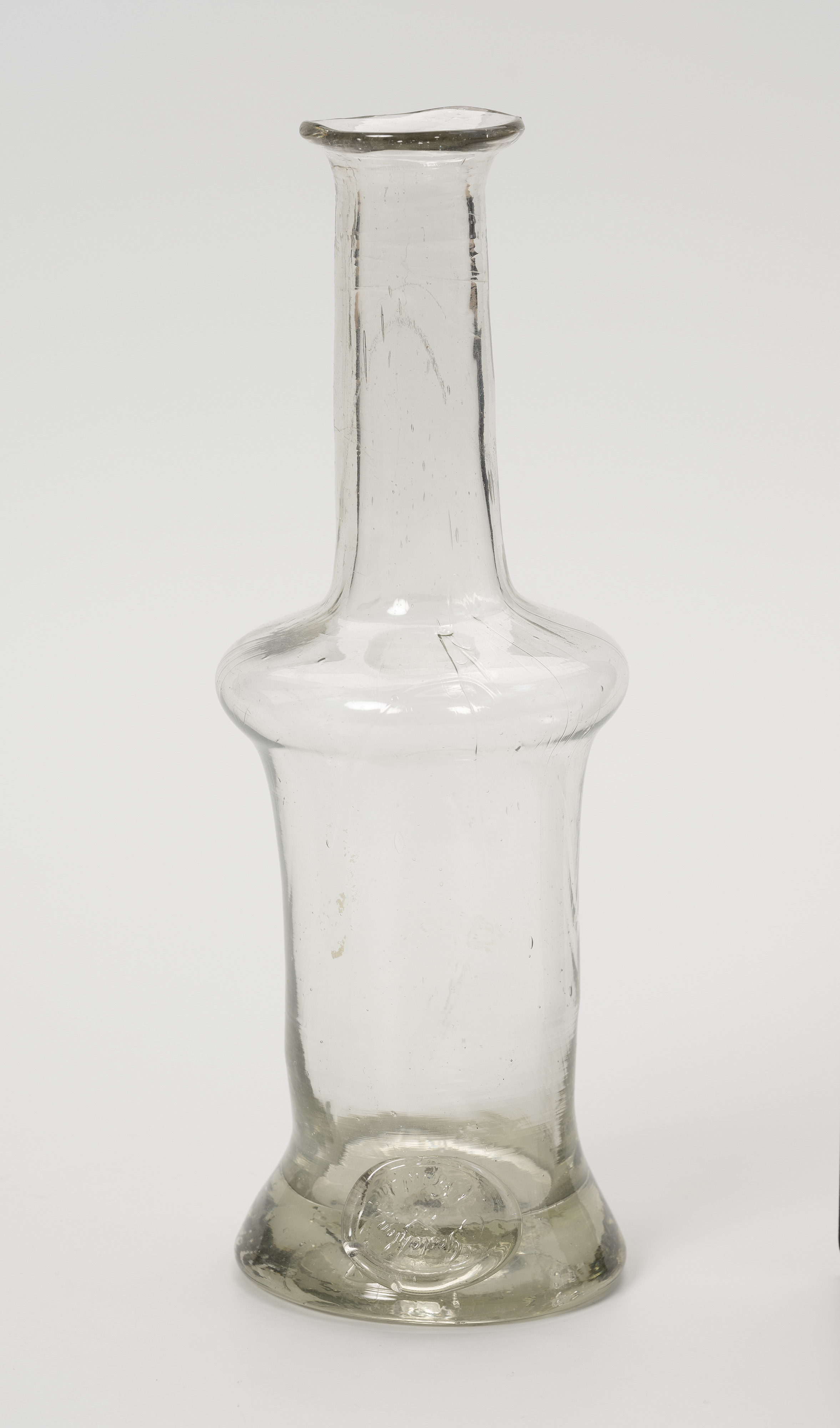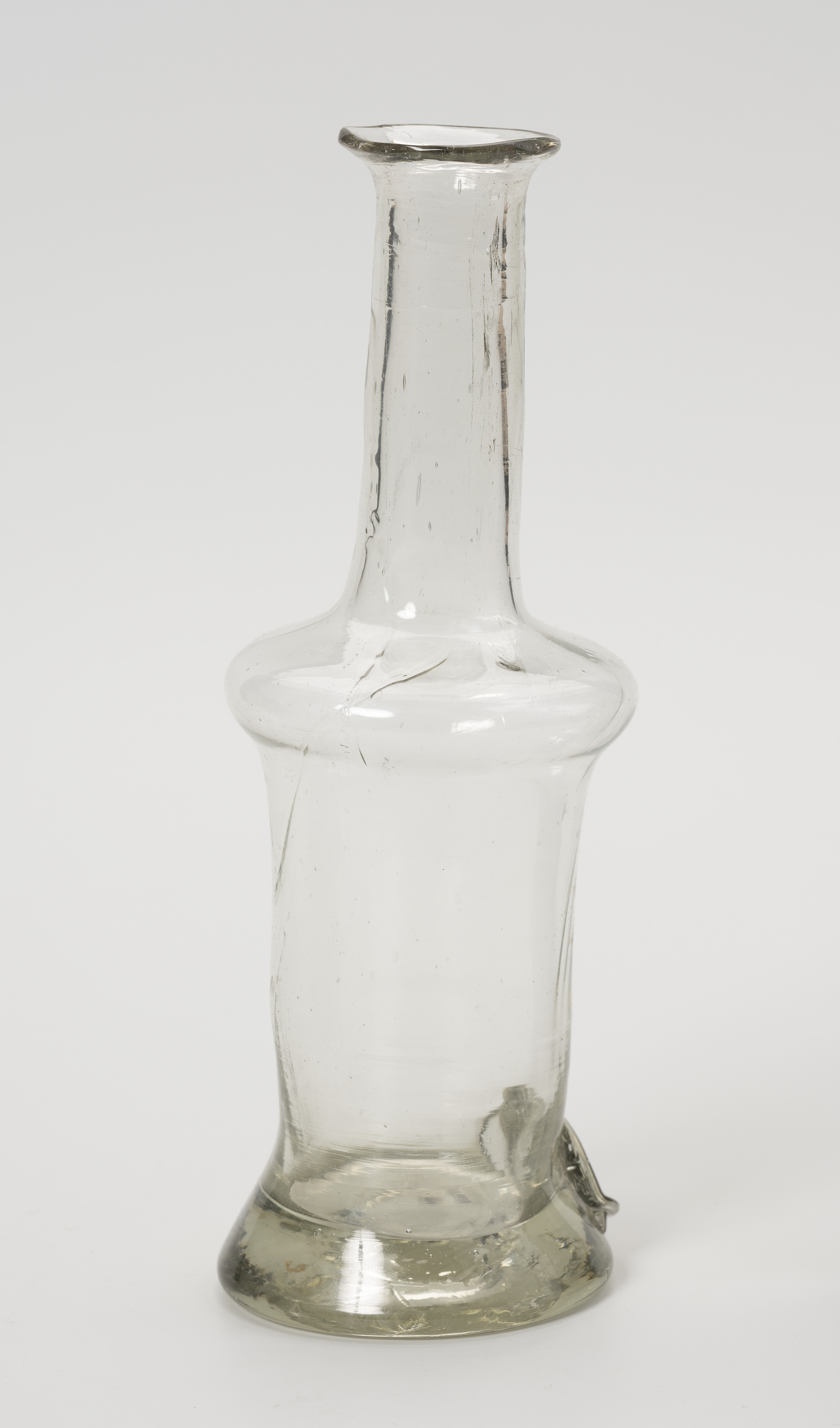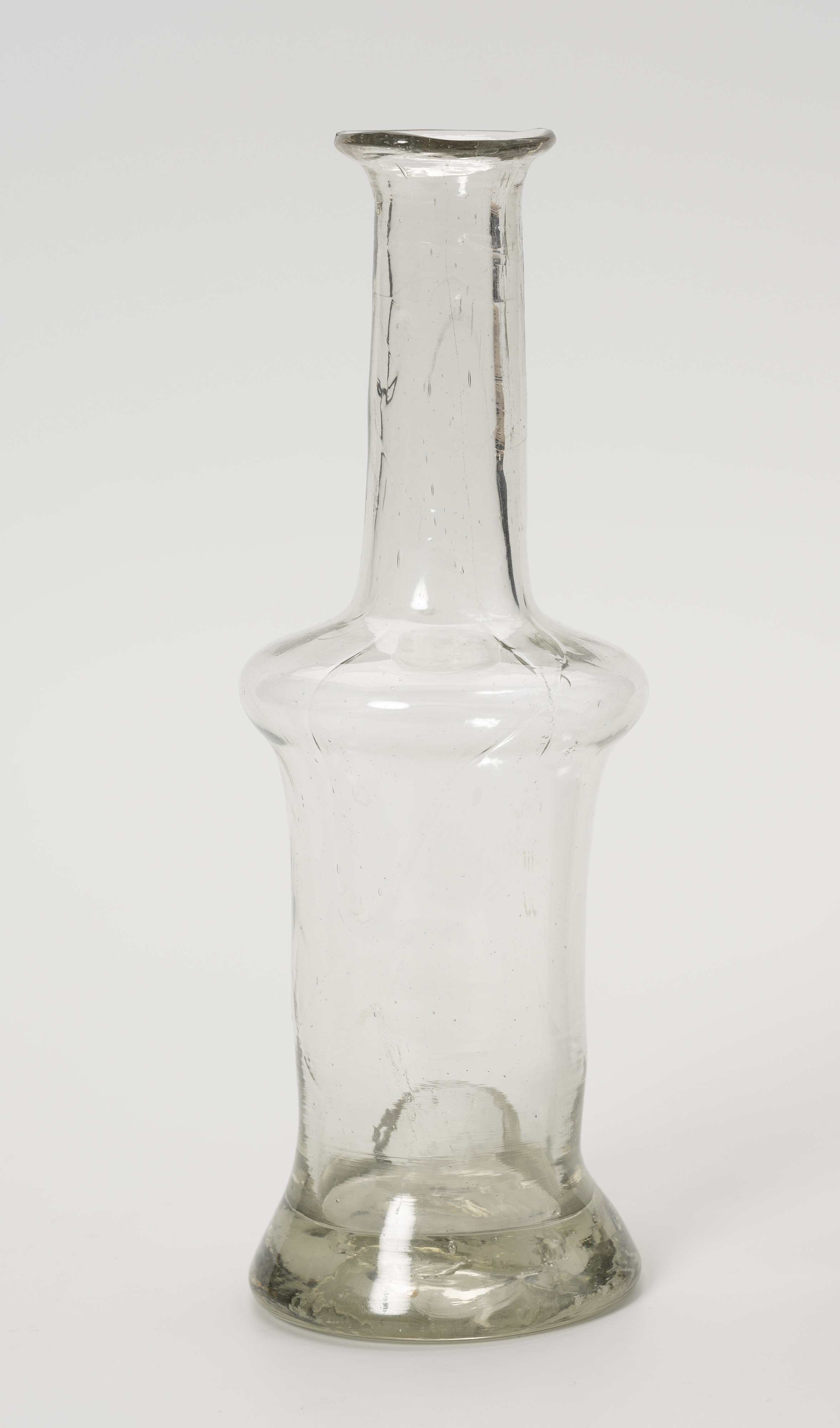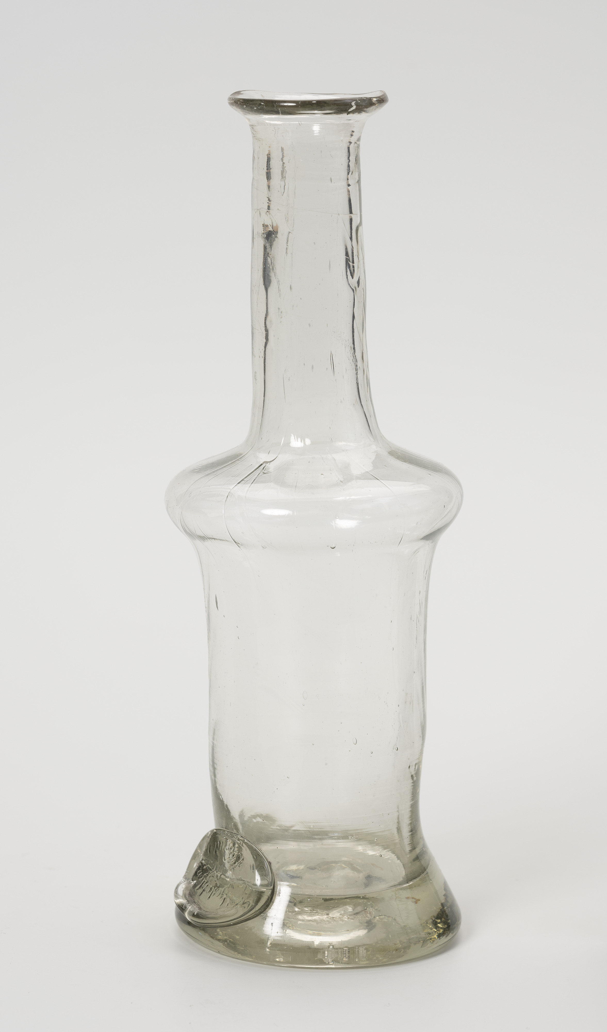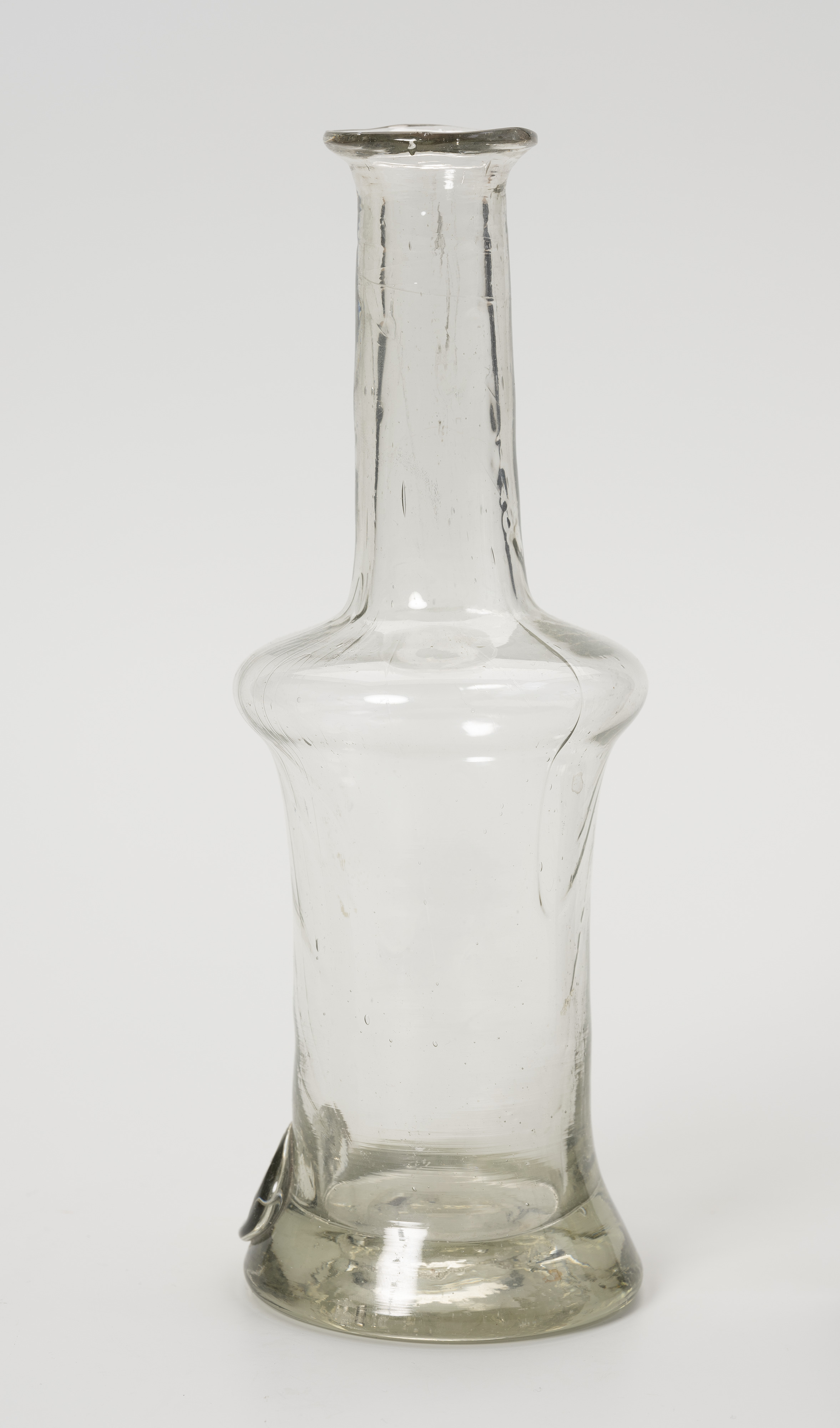 Karafinka została wykonana na piszczelu hutniczym metodą dmuchania i kształtowania formy za pomocą kształtownika. Na jej dnie wyraźnie widoczne pozostało miejsce odcięcia od piszczeli, a na powierzchni naczynia ślady nie do końca perfekcyjnego procesu produkcyjnego w postaci strug masy szklanej, których nie rozprowadzono równo na powierzchni naczynia.