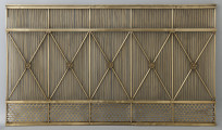 Ekran kominkowy w kształcie prostokąta, mosiężny, ażurowy, złożony z wąskiej ramy na wysokim cokole wypełnionym ażurową siatką z perforowanej blachy, podzielony na pięć wąskich pionowych segmentów rozdzielonych wąskimi prętami o okrągłym przekroju, wypełnionych gęsto rozmieszczonymi, pionowo i równolegle przytwierdzonymi grubymi drutami. Górny ramiak opatrzony prostym gzymsem. Poniżej jego, w jednej piątej wysokości od góry, biegnie przez całą szerokość wąska, pozioma, płaska listwa, identyczna jak listwy wydzielające cokół. Od przodu między listwami każdy segment opatrzony został parą skrzyżowanych ukośnie grubych prętów o okrągłym przekroju, w miejscu skrzyżowania opatrzonych wytłaczanymi rozetami kwiatowymi, a u góry i u dołu, w miejscu przytwierdzenia w rogach każdego segmentu – półrozetami. Od strony tylnej w górnych narożach ramy pod gzymsem, oraz po bokach na wysokości górnej listwy cokołu przylutowane zostały cztery pionowe haki, przeznaczone zapewne do zawieszenia ekranu na obramieniu kominka lub dodatkowym stelażu.