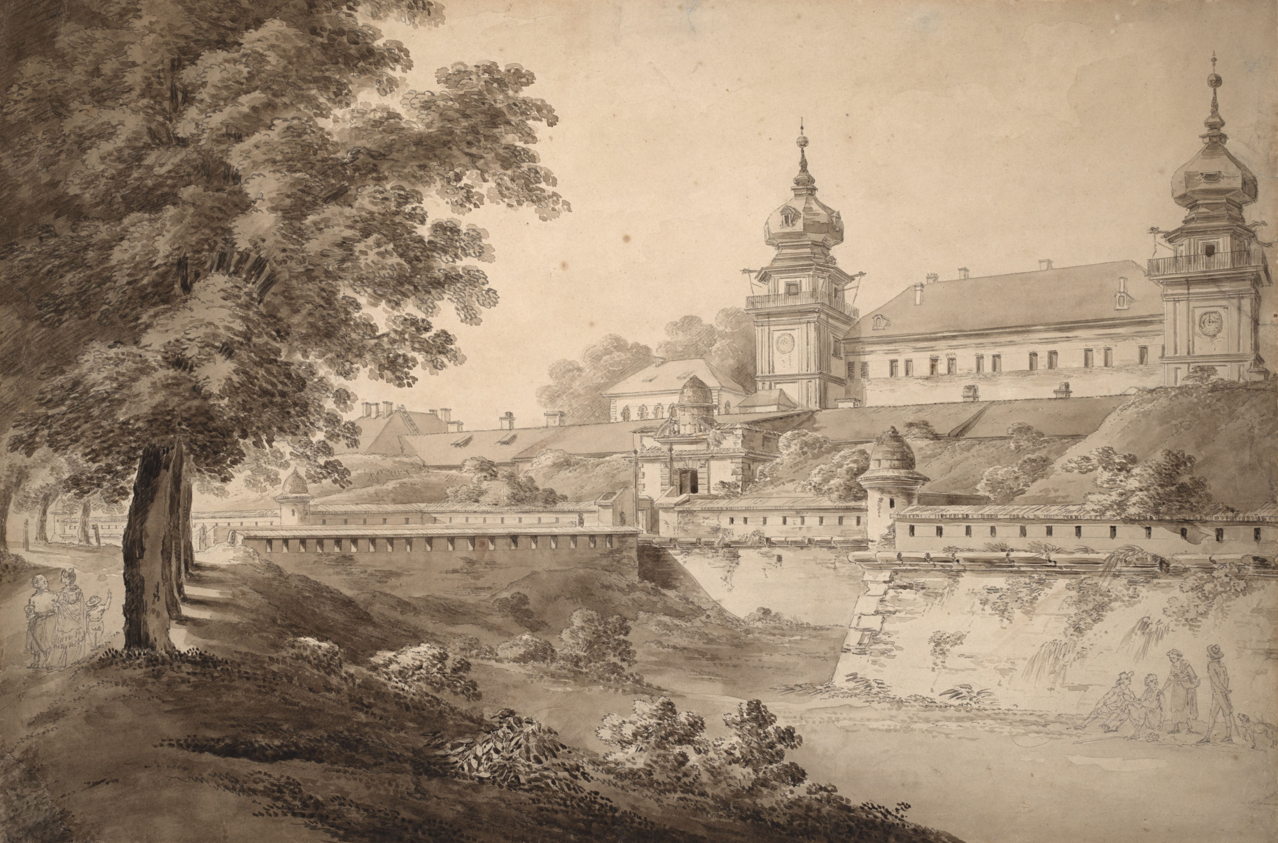 Obraz (akwarela monochromatyczna) z kolekcji Potockich, dawnych właścicieli zamku i Łańcuta przedstawia widok zamku łańcuckiego od strony południowo – zachodniej, z perspektywy alei lipowej biegnącej wokół fosy. Ukazane są: zamek, a właściwie fosa, mury obronne z otworami strzelniczymi, wały ziemne, budynek bramny oraz fasada zachodnia zamku z obu wieżami – północno – zachodnią i południowo – zachodnią. Wieże nakryte są barokowymi hełmami i namalowane z dokładnością – widoczne pilastry, gzymsy i balkony, a nawet zegar na wieży południowo – zachodniej. Natomiast sama fasada bez podziałów architektonicznych, z oknami i nakrywającym ją dachem. Do wieży północno – zachodniej przylega pawilon biblioteczny, ukazany fragmentarycznie (okna pietra i dach). Bliżej bastionu widoczny dach arsenału. Całość utrzymana w brązach, kompozycję ożywiają damy spacerujące aleją lipową oraz grupka czterech mężczyzn stojących w fosie. Osoby te naszkicowane są delikatną linią. Na odwrociu obrazka szkic czterech kawalerów w strojach charakterystycznych dla mody francuskiej i ołówkiem „Thomas de Thomond”. Akwarela ujęta w dość szerokie passe – partout, obraz zaś w drewnianą płaską ramę ozdobioną n narożach nakładanymi pozłacanymi rozetkami. Obraz ukazuje zamek z lat 90 –tych XVIII w. Jean François Thomas de Thomon (ur w kwietniu 1760 r, zm. W we wrześniu 1813 r w Petersburgu to szwajcarski architekt), który działał na terenie Polski, Rosji I Austrii. Studiował w paryskiej Akademii Sztuk Pięknych, a później w Rzymie, potem zamieszkał w Rzymie. W 1792 r wyjechał do Rosji na zaproszenie ambasadora Rosji w Wiedniu. Po krótkim pobycie w Moskwie udał się w 1799 r do Petersburga, gdzie został profesorem Akademii Sztuk Pięknych. Zagranicą spotkał się z księżną marszałkową Lubomirską, która zaprosiła go do Łańcuta (miał m.in. wykonać projekt Galerii Rzeźb w zamku). Przebywał w Łańcucie prawdopodobnie podczas podróży do Rosji.