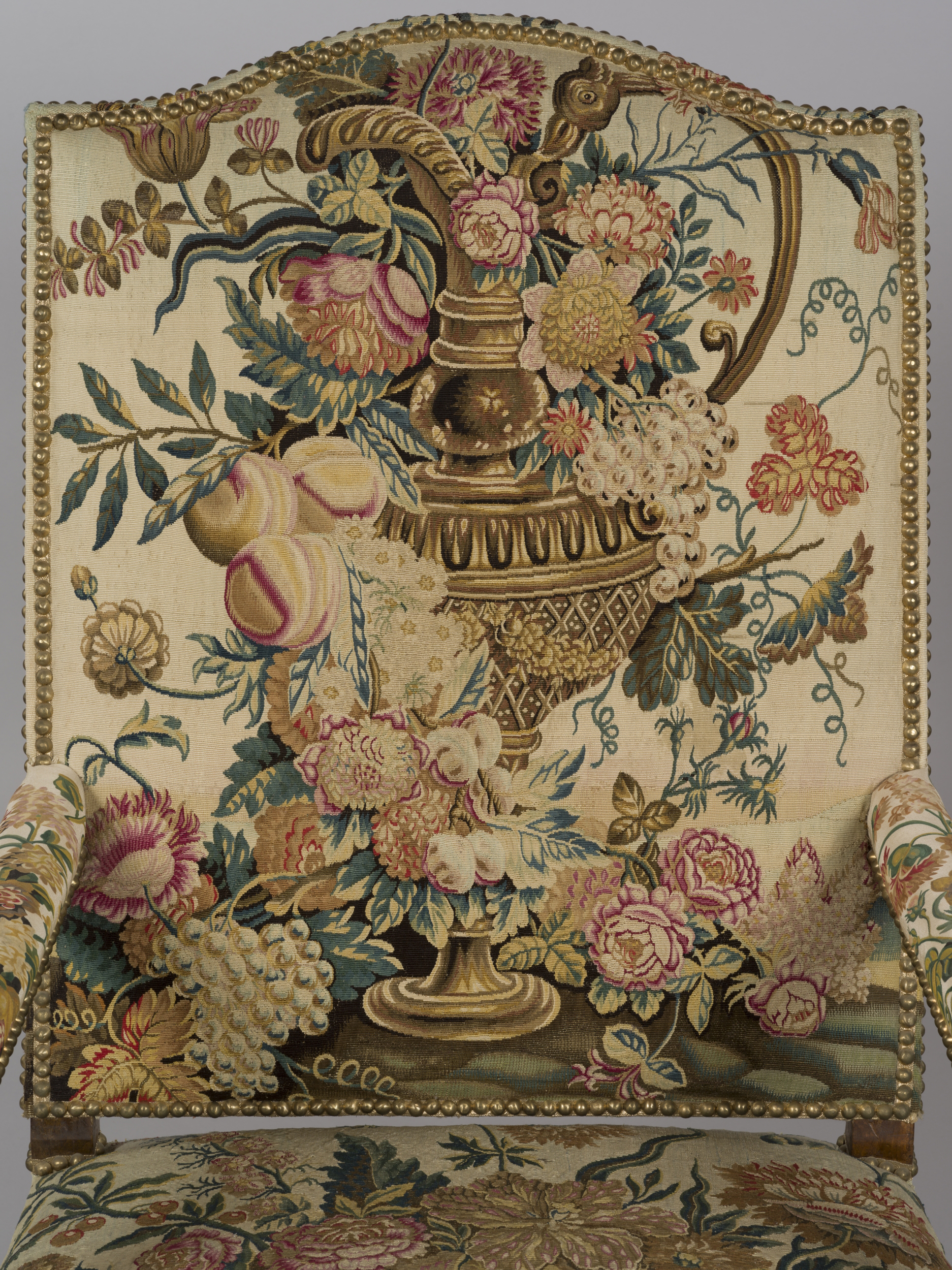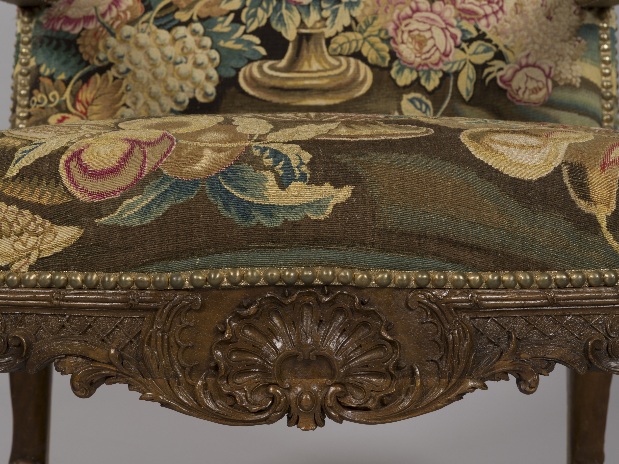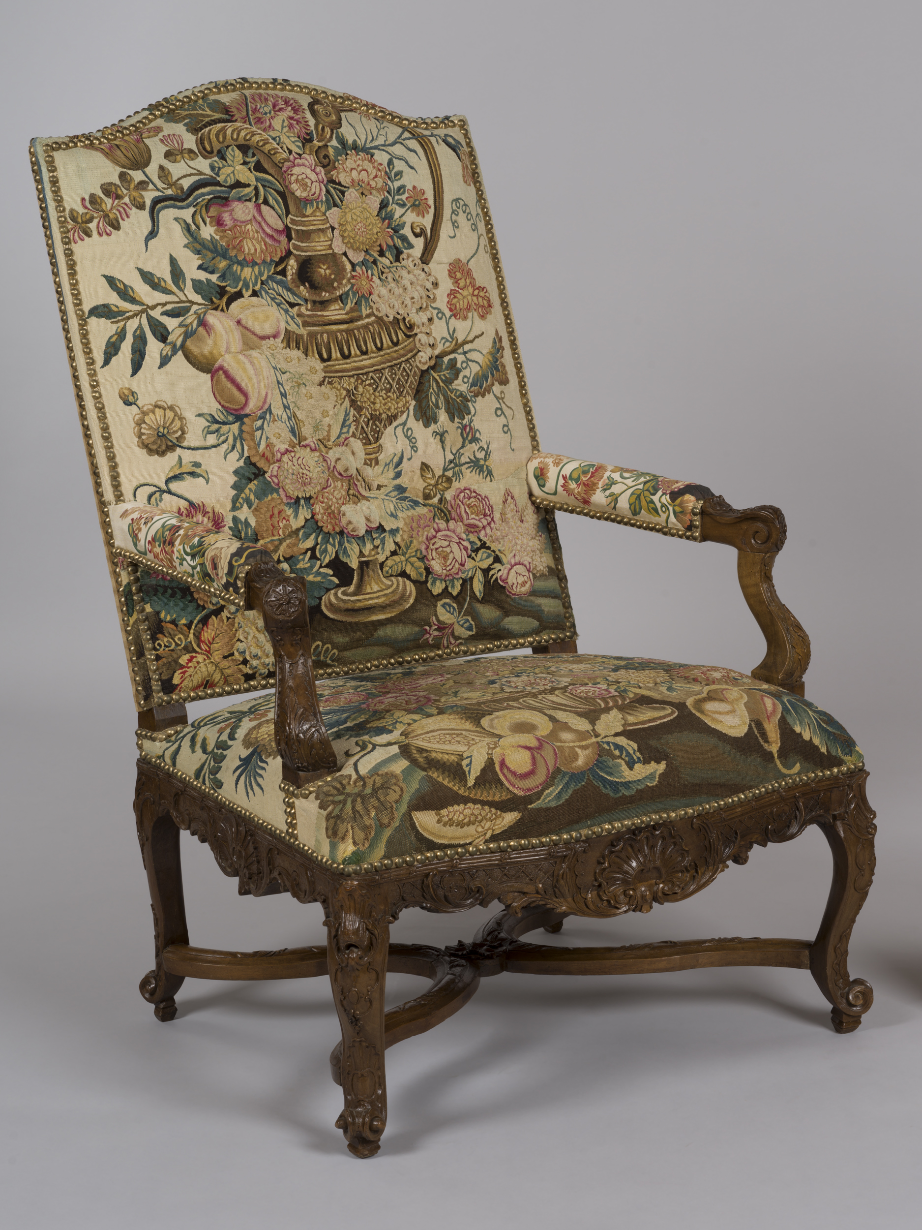 Fotel należy do jednego z trzech w zbiorach wilanowskich kompletów francuskich mebli w stylu regencyjnym, krytych gobelinem o wysokiej wartości artystycznej, składającego się pierwotnie z kanapy i dwunastu foteli. Reprezentuje typ à la raine, - oparcie pleców oddzielone od siedziska, zachowało jeszcze barokowy kształt prostokąta o lekko sfalowanej górnej krawędzi. Falista forma pozostałych elementów zaciera linie konstrukcyjne mebla; zapowiada nadchodzące rokoko. Siedzisko fotela wsparte jest na czterech wygiętych nóżkach typu cabriole; widoczne części drewnianej konstrukcji w naturalnym kolorze orzecha (rama oskrzynia, nóżki i ich krzyżowe wiązania, podpory poręczy) pokrywa bogata rzeźba z motywami regencyjnymi: stylizowanymi zwojami akantu, pióropuszami, kampanullami oraz muszlami akcentującymi podziały kompozycyjne nadając mu walor lekkości. Podkreśla go wielobarwna tkanina gobelinowa pokrywająca oparcie pleców, poręcze i siedzisko, przedstawiająca wspaniałe kompozycje kwiatów znanych z barokowych obrazów mistrzów flamandzkich. W części centralnej oparcia imponujący bukiet kwiatów i owoców w dekoracyjnej dzbanie, na siedzisku kwiaty i owoce w misie. Rzędy główek dekoracyjnych ćwieków mocujących tkaninę do konstrukcji drewnianej dają dyskretne złote refleksy. Komplet mebli pod koniec XVIII w. stanowił wyposażenie Apartamentów ks. Izabeli Lubomirskiej, później dekorowały Apartamenty Królewskie. Obecnie z kompletu zachowały się tylko dwa fotele (Wil.963/1 i Wil.963/2).