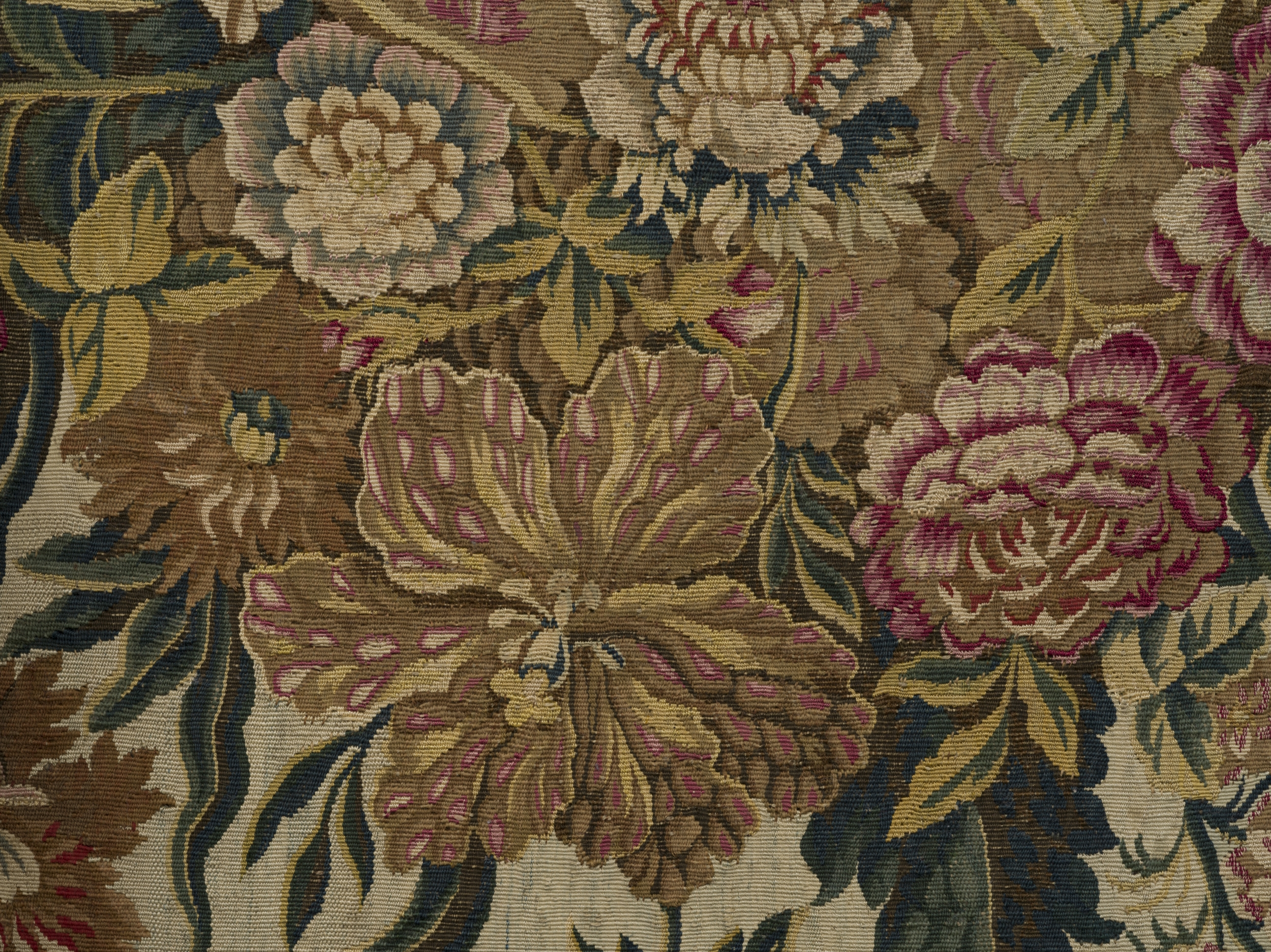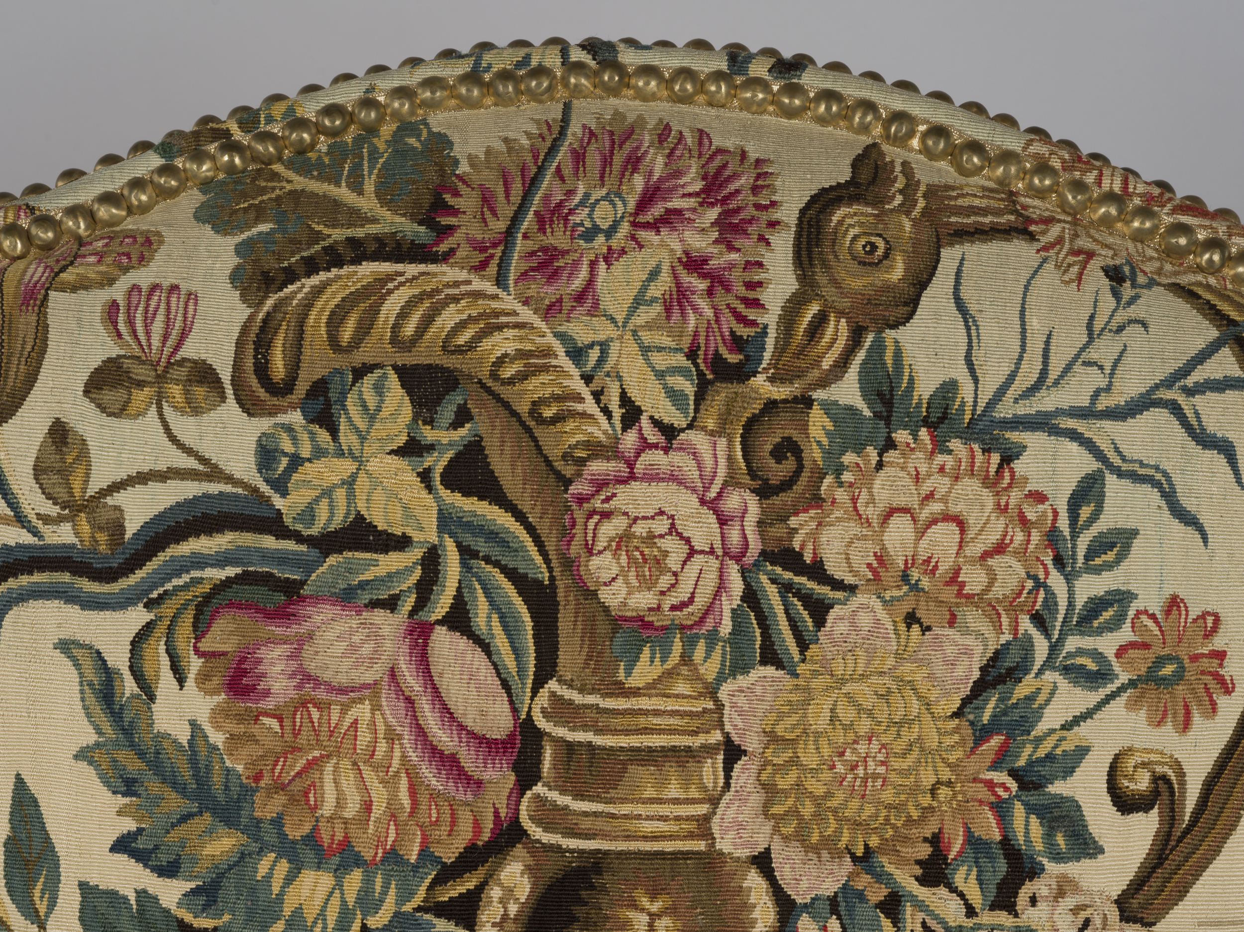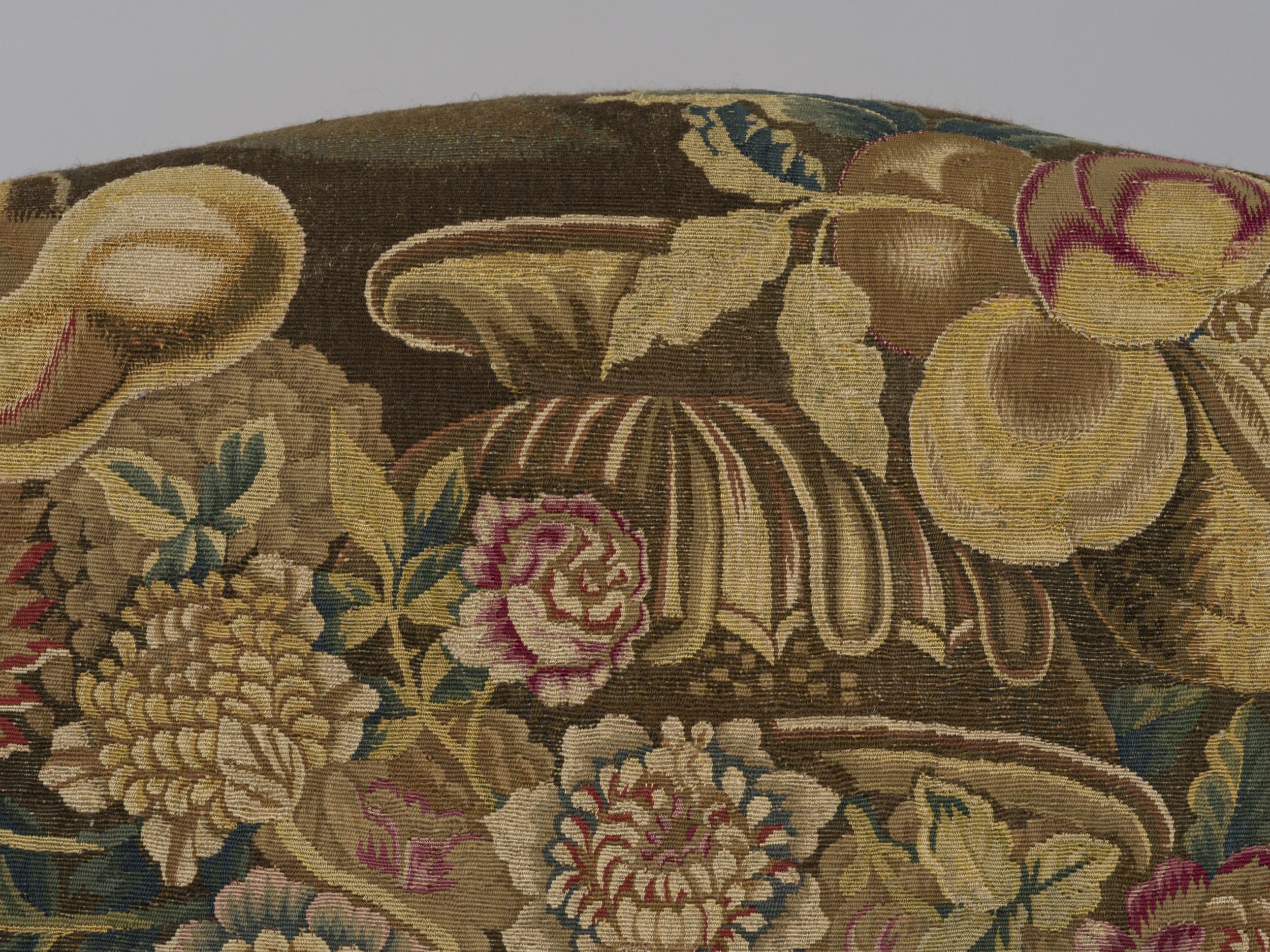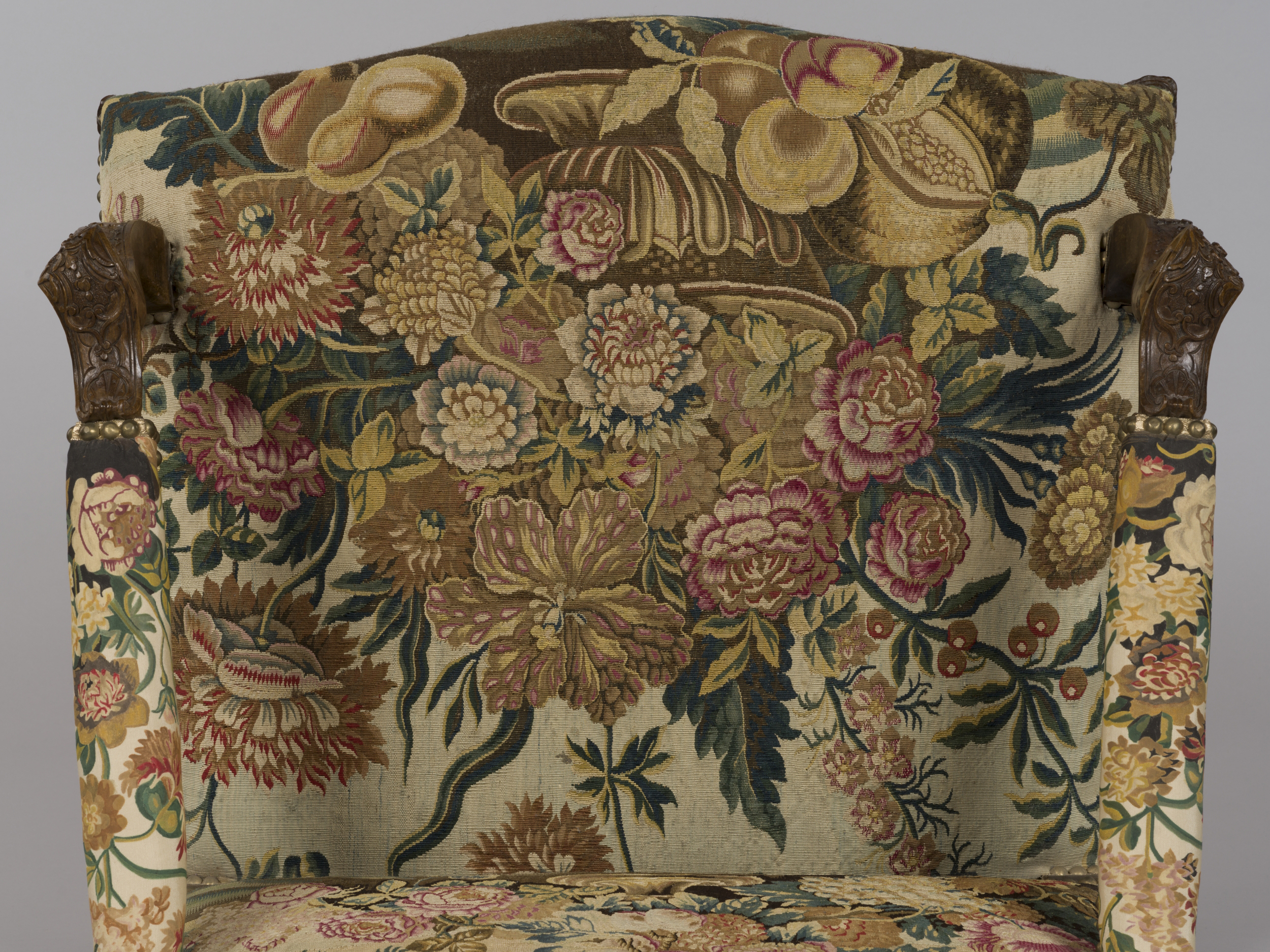 Fotel należy do jednego z trzech w zbiorach wilanowskich kompletów francuskich mebli w stylu regencyjnym, krytych gobelinem o wysokiej wartości artystycznej, składającego się pierwotnie z kanapy i dwunastu foteli. Reprezentuje typ à la raine, - oparcie pleców oddzielone od siedziska, zachowało jeszcze barokowy kształt prostokąta o lekko sfalowanej górnej krawędzi. Falista forma pozostałych elementów zaciera linie konstrukcyjne mebla; zapowiada nadchodzące rokoko. Siedzisko fotela wsparte jest na czterech wygiętych nóżkach typu cabriole; widoczne części drewnianej konstrukcji w naturalnym kolorze orzecha (rama oskrzynia, nóżki i ich krzyżowe wiązania, podpory poręczy) pokrywa bogata rzeźba z motywami regencyjnymi: stylizowanymi zwojami akantu, pióropuszami, kampanullami oraz muszlami akcentującymi podziały kompozycyjne nadając mu walor lekkości. Podkreśla go wielobarwna tkanina gobelinowa pokrywająca oparcie pleców, poręcze i siedzisko, przedstawiająca wspaniałe kompozycje kwiatów znanych z barokowych obrazów mistrzów flamandzkich. W części centralnej oparcia imponujący bukiet kwiatów i owoców w dekoracyjnej dzbanie, na siedzisku kwiaty i owoce w misie. Rzędy główek dekoracyjnych ćwieków mocujących tkaninę do konstrukcji drewnianej dają dyskretne złote refleksy. Komplet mebli pod koniec XVIII w. stanowił wyposażenie Apartamentów ks. Izabeli Lubomirskiej, później dekorowały Apartamenty Królewskie. Obecnie z kompletu zachowały się tylko dwa fotele (Wil.963/1 i Wil.963/2).